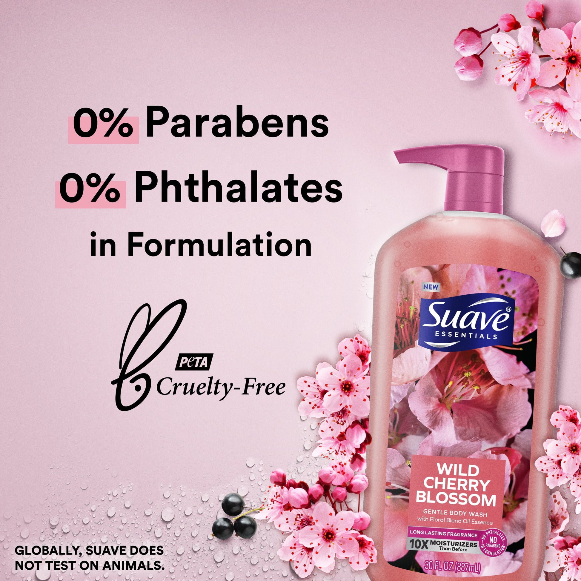 Allow us to reintroduce ourselves! Suave Essentials Body Washes are now new and improved! New look, new sizes, and even more benefits. Fresh, Floral, Fruit, Sweet, oh my! With our new fragrance families, finding your go-to scent is as easy as pie. A bubbly bloom awaits! Bathe in a bright bouquet of rich cherry blossom, sweet jasmine, and luscious black currant with our Wild Cherry Blossom Body Wash. The delightful, long-lasting blend of oil essence in our cleanser will leave your skin feeling instantly hydrated and silky smooth throughout the day. Now rich with 10X the moisturizers than before, and infused with Vitamin E and cherry blossom extracts, you'll pamper your skin with every use. Gentle and perfect for everyday cleansing, our Body Wash contains absolutely no parabens or phthalates in its formulation.