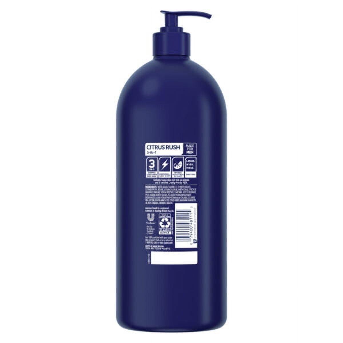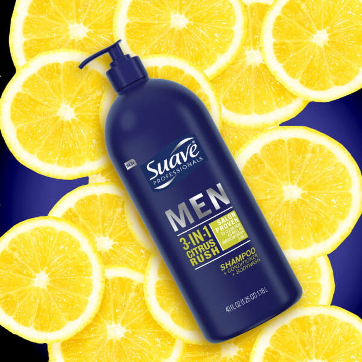 Suave Men 3-in-1 Shampoo, Conditioner & Body Wash Citrus Rush cleanses hair and skin all in one, keeping your routine quick and easy. Now available in larger pump sizes for value and convenience. Made for men, this mens 3 in 1 nourishing bodywash shampoo and conditioner, is infused with citrus extract and leaves your hair and skin with the energizing and clean scent of citrus. Quality you can trust from America’s #1 Men’s Hair Brand. Suave Men Citrus Rush 3 in 1 Shampoo + Conditioner + Body Wash is salon proven to clean hair as well as American Crew 3-in-1. Directions: Lather. Wash. Rinse. Good for your skin and hair and good for the planet. This shampoo, conditioner and body wash bottle is made from 100% recycled plastic. Globally, Suave does not test on animals and is certified Cruelty-Free by PETA. For Over 75 years, Suave has offered professional, quality products for the entire family, which are proven to work as well as salon brands. The Suave mission is to make gold standard quality attainable to all, so everyone can look good, smell good and feel good every day.