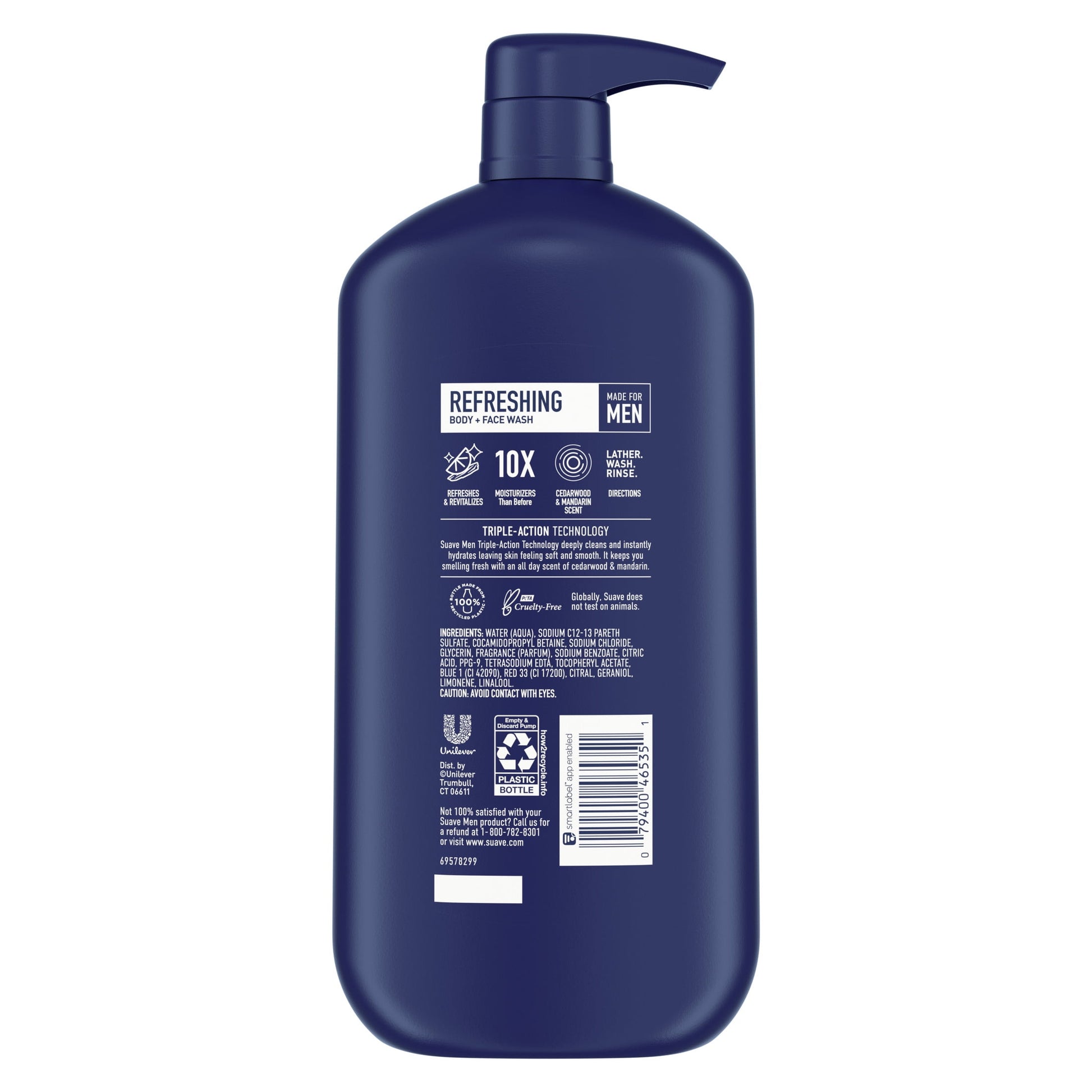 Work Hard. Smells Great! Refresh and recharge with the Suave Men Refresh Face and Body Wash. After a tough day's work, Refresh transforms you. Suave Men body wash is designed for the hard-working man. Made with fresh, all day scents and a rich lather that will leave you feeling, looking, and smelling clean, so you can be at your best, now with 10x more moisturizers than before. Give your skin a fresh clean and a feeling of renewal – with hints of cedarwood and mandarin. This face wash, body wash and shower gel is formulated with our Suave Men Triple-Action Technology. Our body washes are formulated with our Triple-Action Technology that works to deeply clean, washing away sweat, oil and impurities, leaving skin feeling soft and smooth, while smelling fresh all-day. Directions: Lather this face and body cleanser. Wash. Rinse.