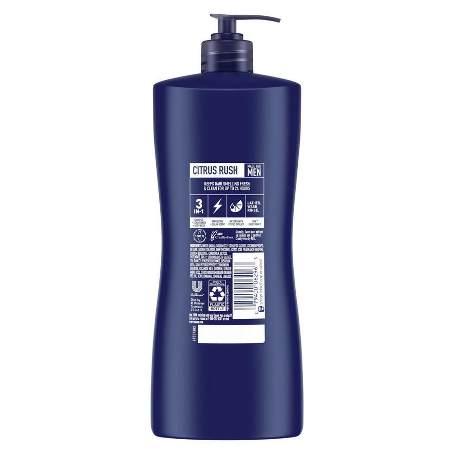 CITRUS RUSH: Suave Men Citrus Rush 3-in-1 shampoo conditioner body wash is a triple-action formula that refreshes you from head to toe while delivering the energizing scent of citrus extract