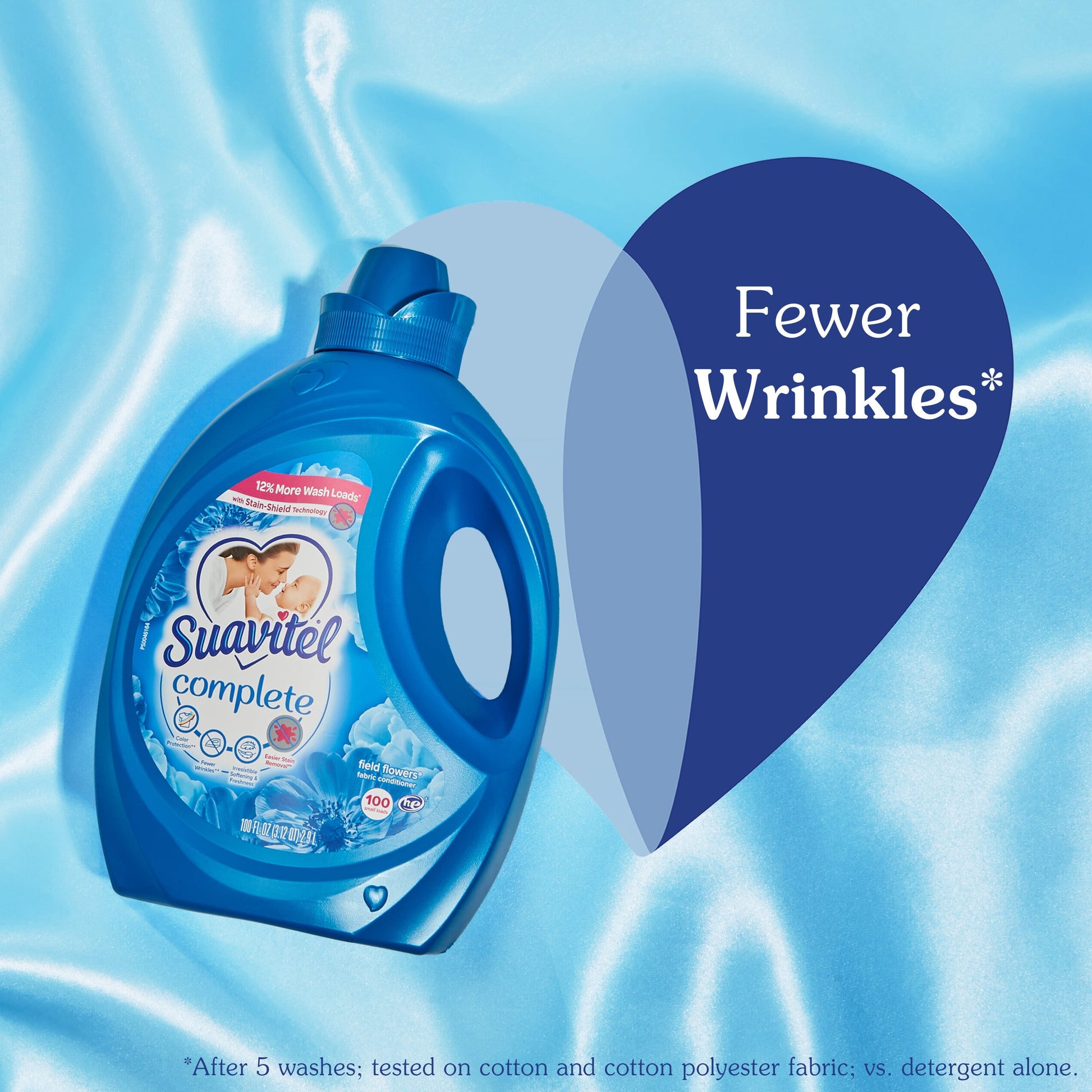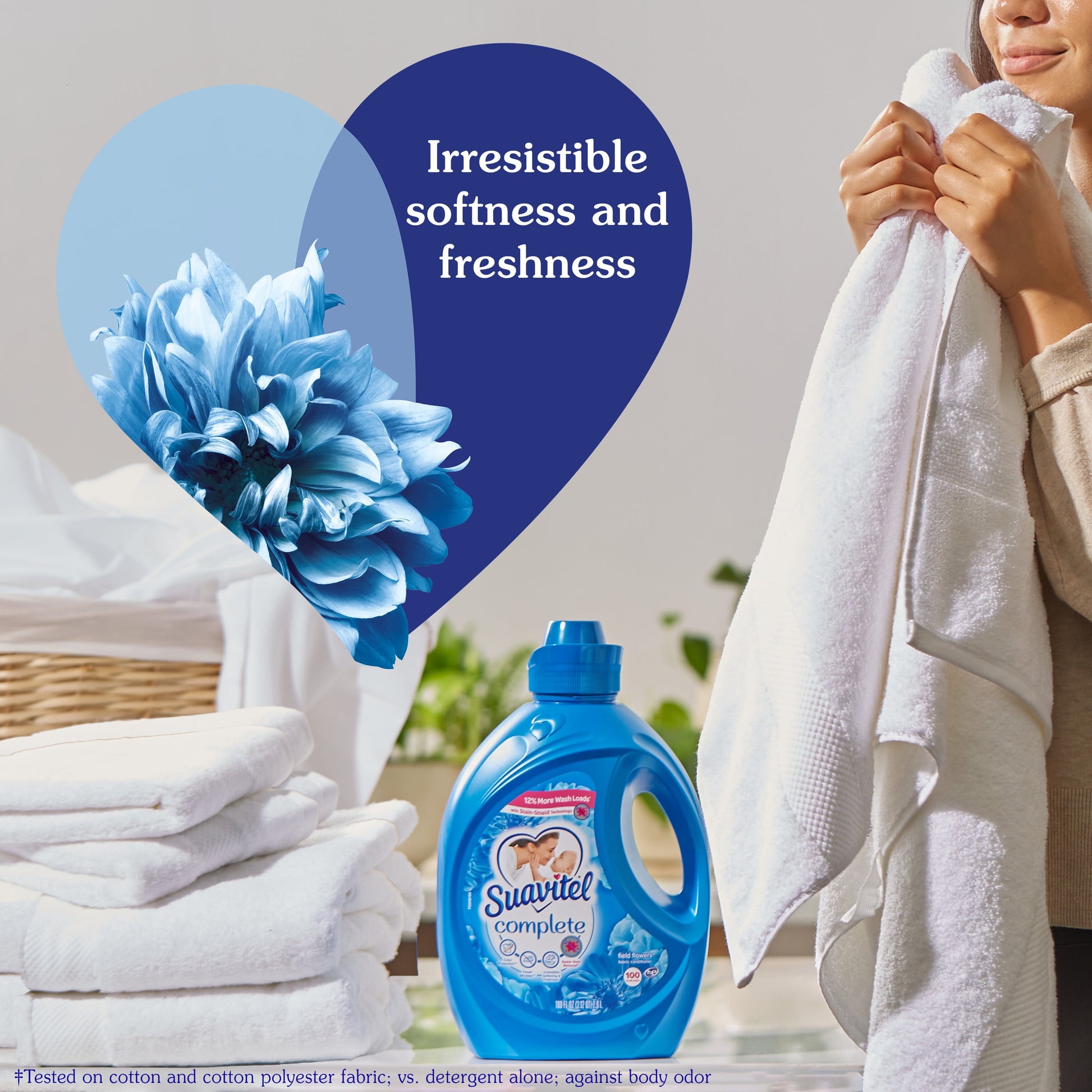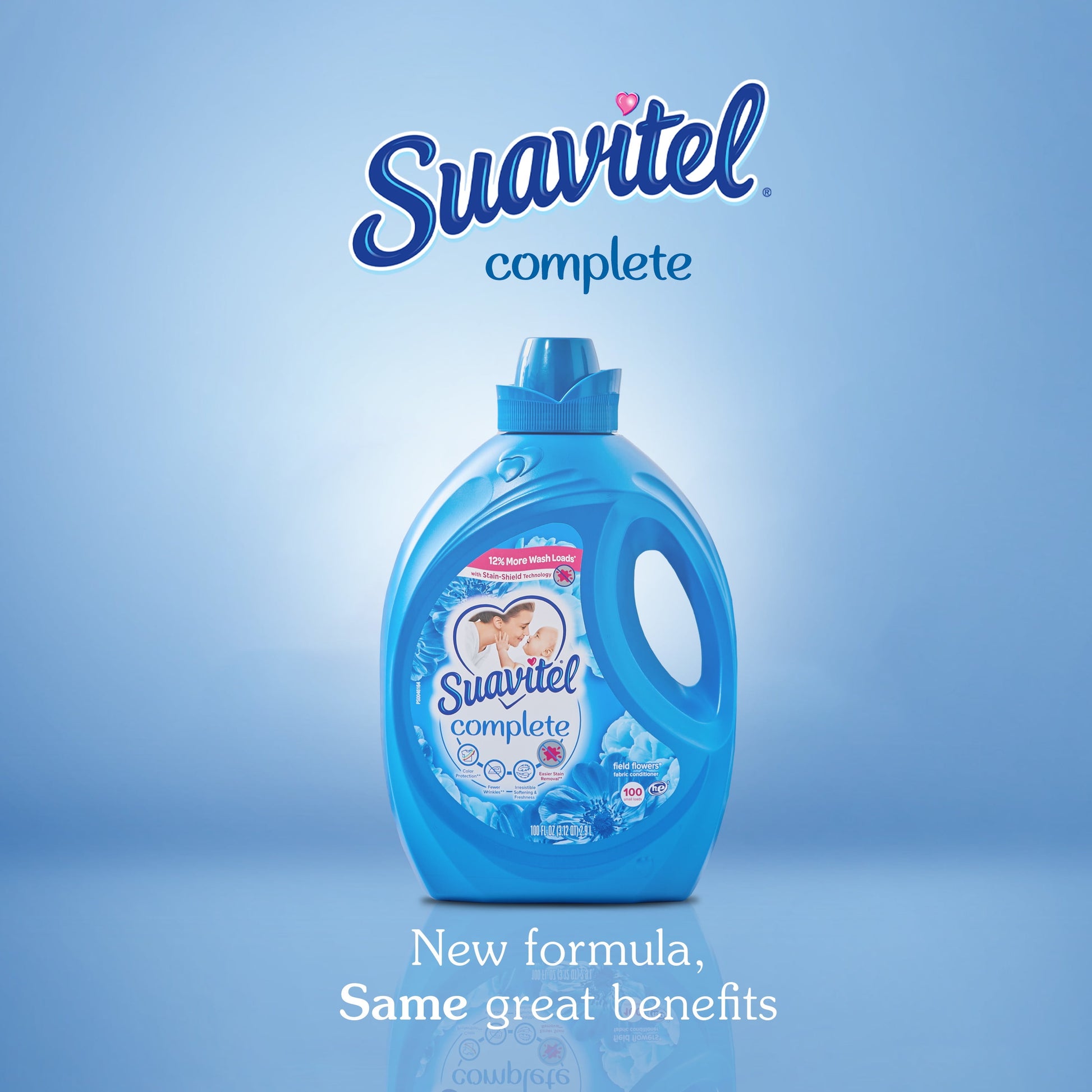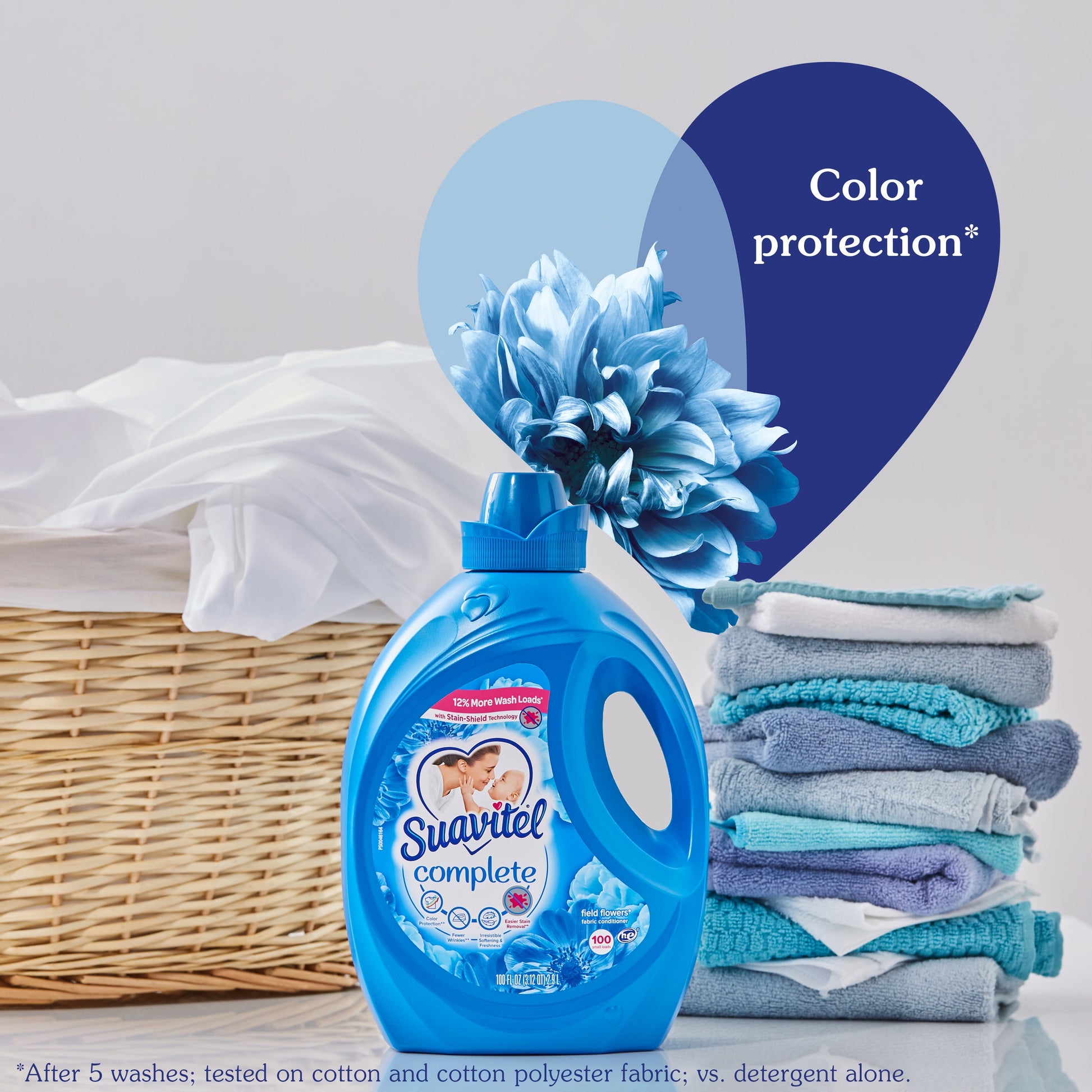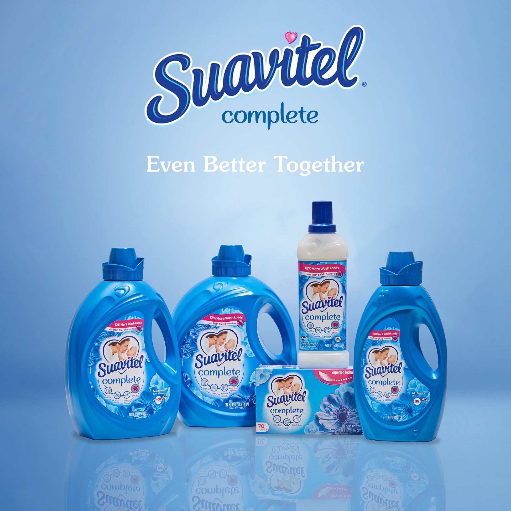 Suavitel Complete is the ideal solution to caring for your clothes and your family's clothes with ease. Liquid fabric softener provides fabric protection benefits that help keep clothes looking newer longer (2). Suavitel Complete Field Flowers now offers a new formula providing you with the softening and freshness that you and your family love. Say goodbye to bad odors with Suavitel Complete Field Flowers. Our technology fights odors and helps with all day odor protection (1). Enjoy the confidence of fresh and pleasant-smelling clothes, and fewer wrinkles (2). Suavitel Complete with Stain-Shield technology ensures color protection, making your clothes look newer for longer (2). Suavitel Complete provides softness to fabric fibers, aligning them and preventing extensive wrinkle formation. Indulge in the irresistible softness and freshness that Suavitel Complete provides. Suavitel Complete Field Flowers helps prevent stains from sticking (2), tackling even the toughest stains with its Stain-Shield Technology; thereby helping your clothes look their best. Suavitel is compatible with all types of washing machines, including HE Washing Machines (3). You can trust Suavitel to deliver exceptional results without damaging your laundry appliances. Upgrade your laundry routine with Suavitel Complete Field Flowers. Enjoy the long-lasting freshness and all-day odor protection with a formula that helps your clothes look newer, longer(2). Suavitel Complete Field Flowers is here to provide the ultimate care and freshness you deserve.