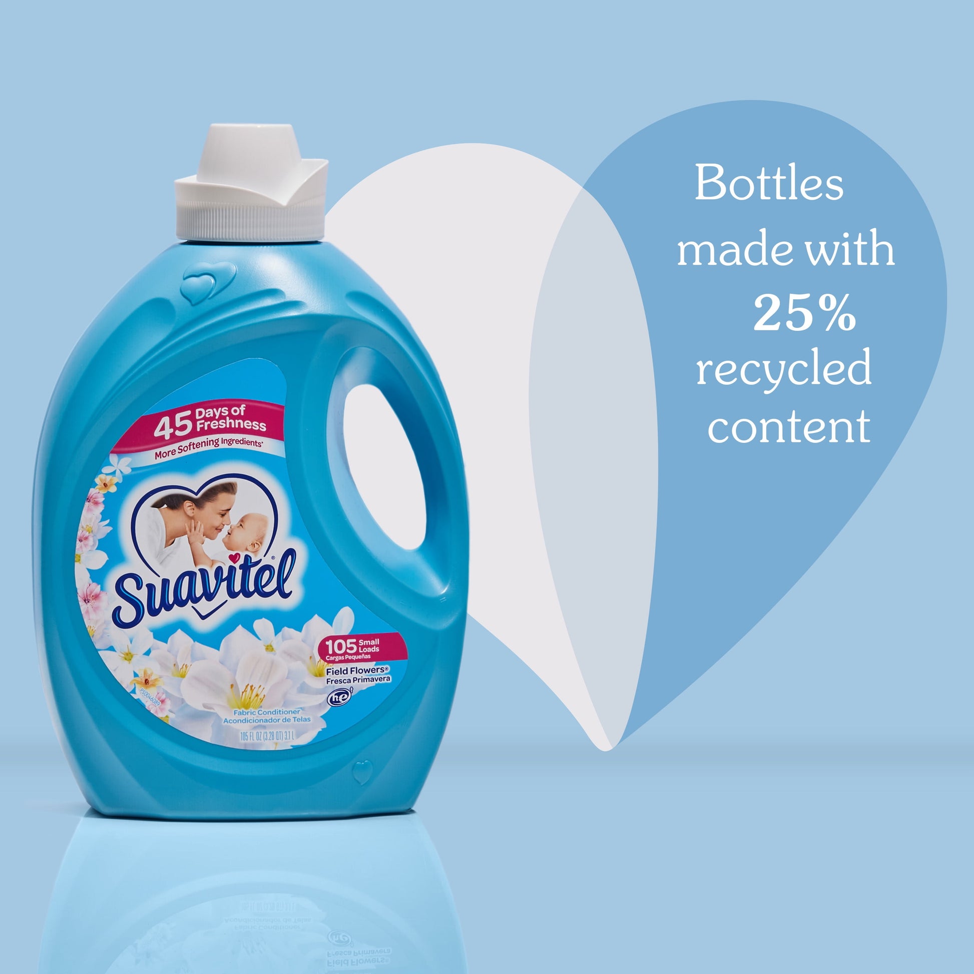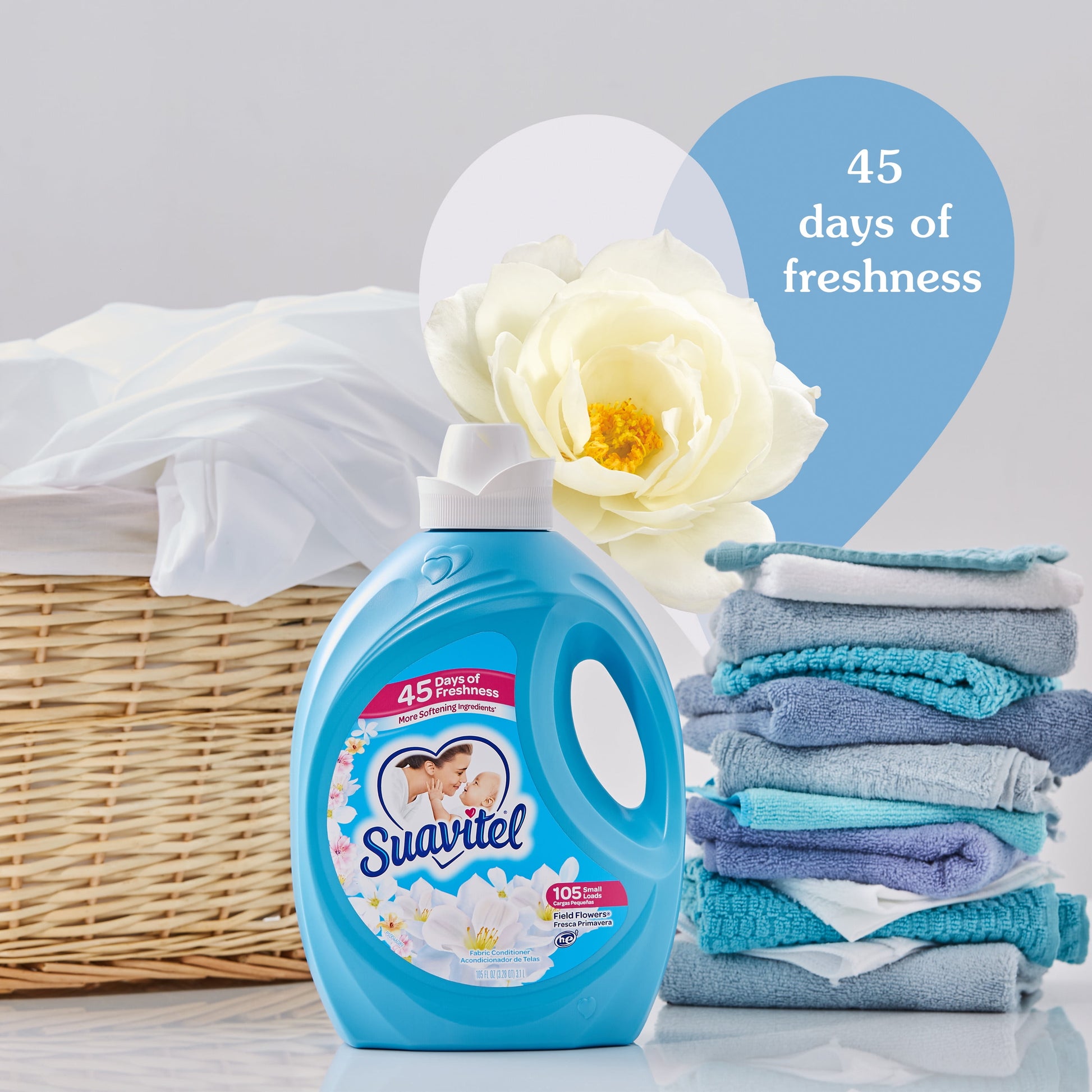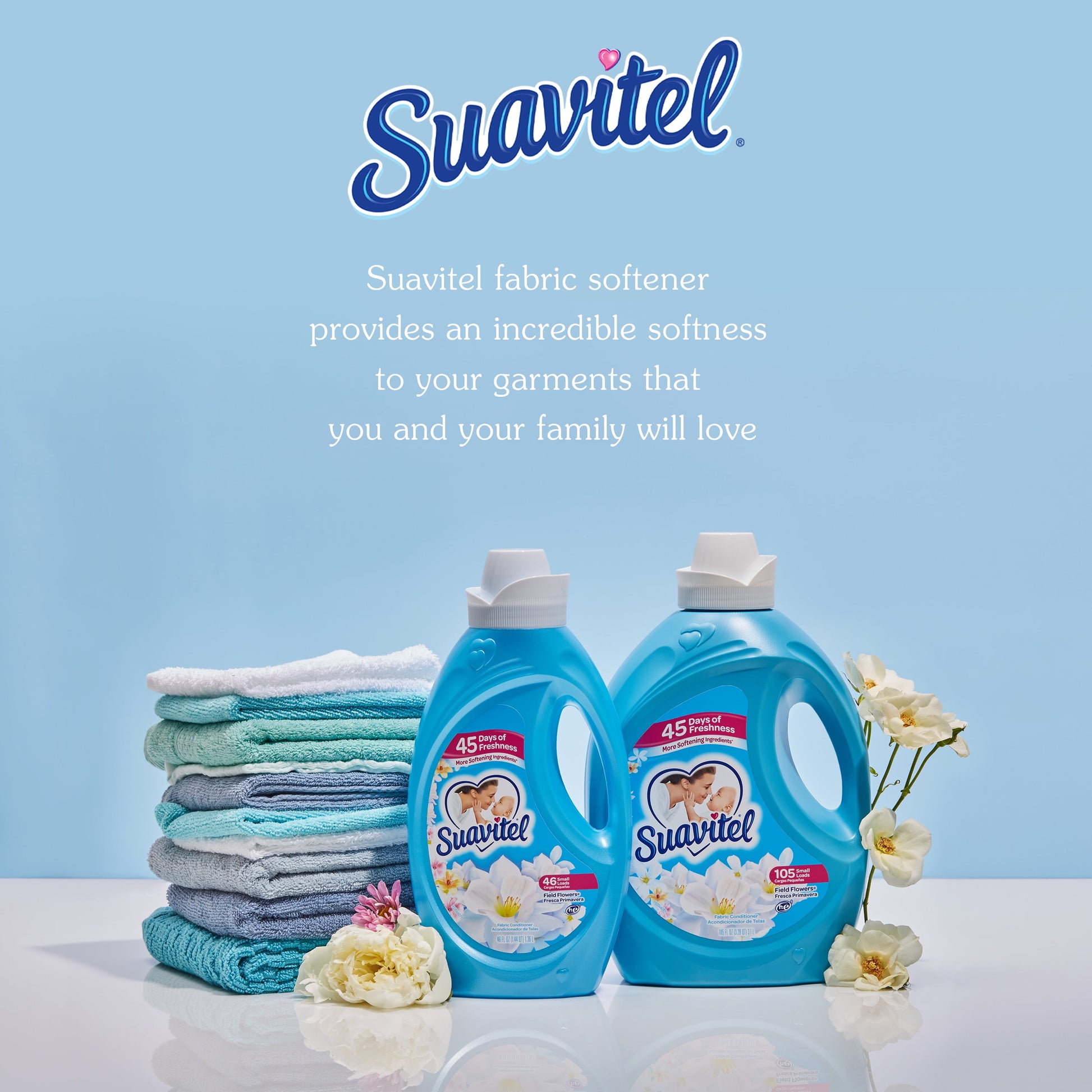 Suavitel’s new formula has more softening ingredients per ounce versus the previous formula, providing a softness that you and your family will love. Embrace the ultimate comfort that Suavitel fabric softener provides. Suavitel fabric softener not only leaves your laundry incredibly soft but also imparts a delightful fragrance that lasts for up to 45 days. Enjoy the uplifting and refreshing scent of Field Flowers, bringing the essence of a blooming garden to your clothes and linens. Suavitel is compatible with all types of washing machines, including HE Washing Machines (1). You can trust Suavitel to deliver outstanding results without causing any damage to your laundry appliances. Upgrade your laundry routine with Suavitel Fabric Softener Field Flowers. Experience the benefits of a new formula, more softening ingredients (2), and a lower dosing amount than the prior Suavitel formula. Revel in the captivating fragrance, incredible softness, and long-lasting freshness that Suavitel provides, and enjoy the confidence of beautifully cared-for clothes.