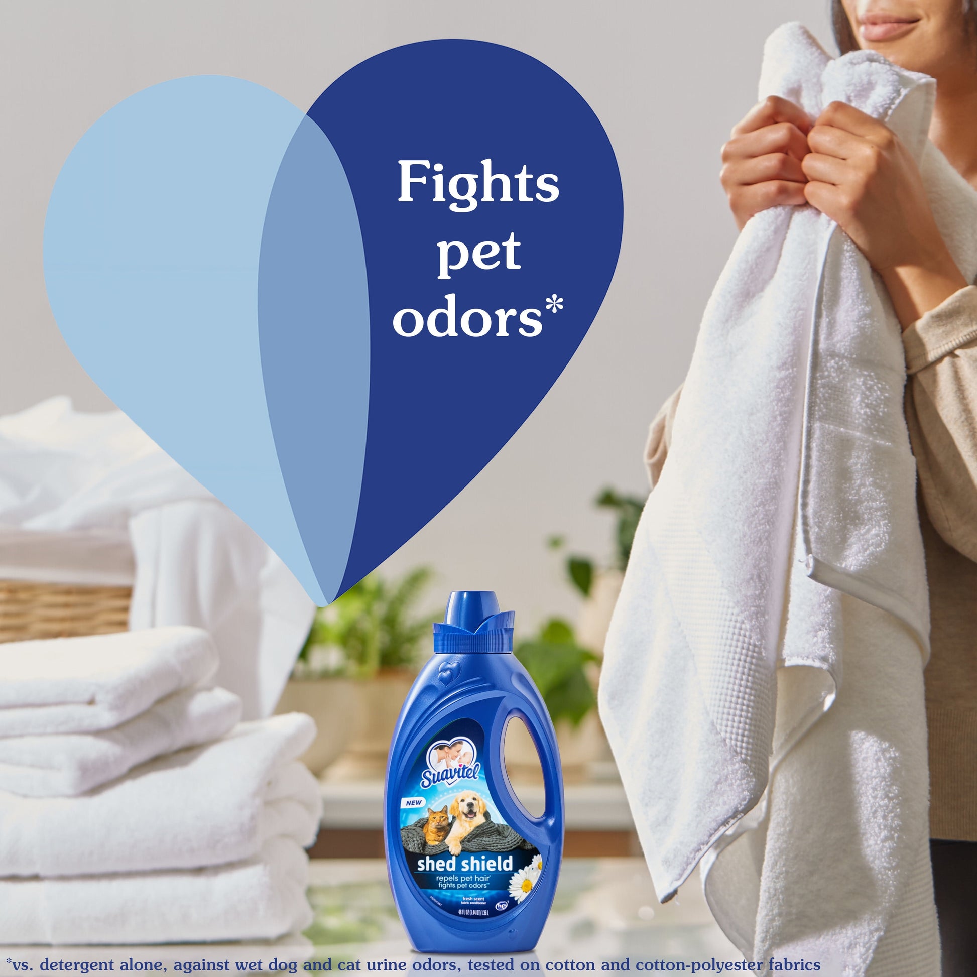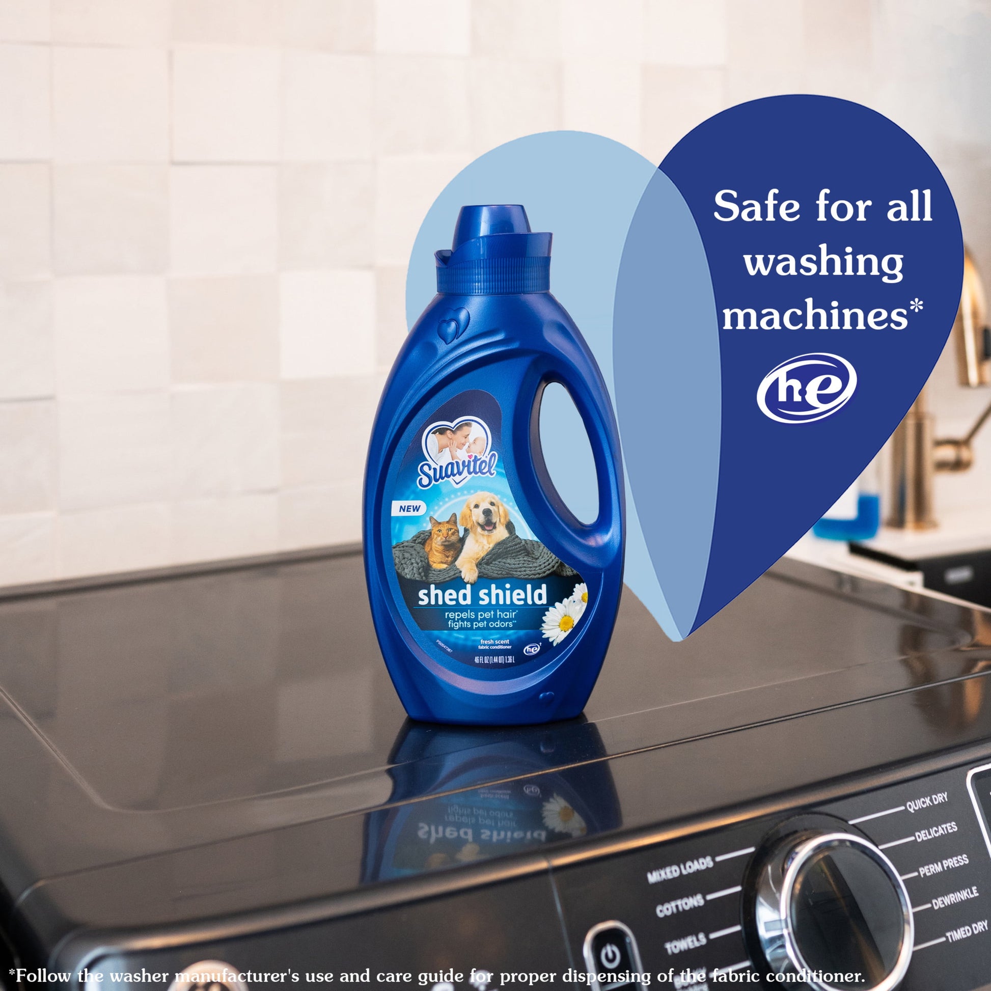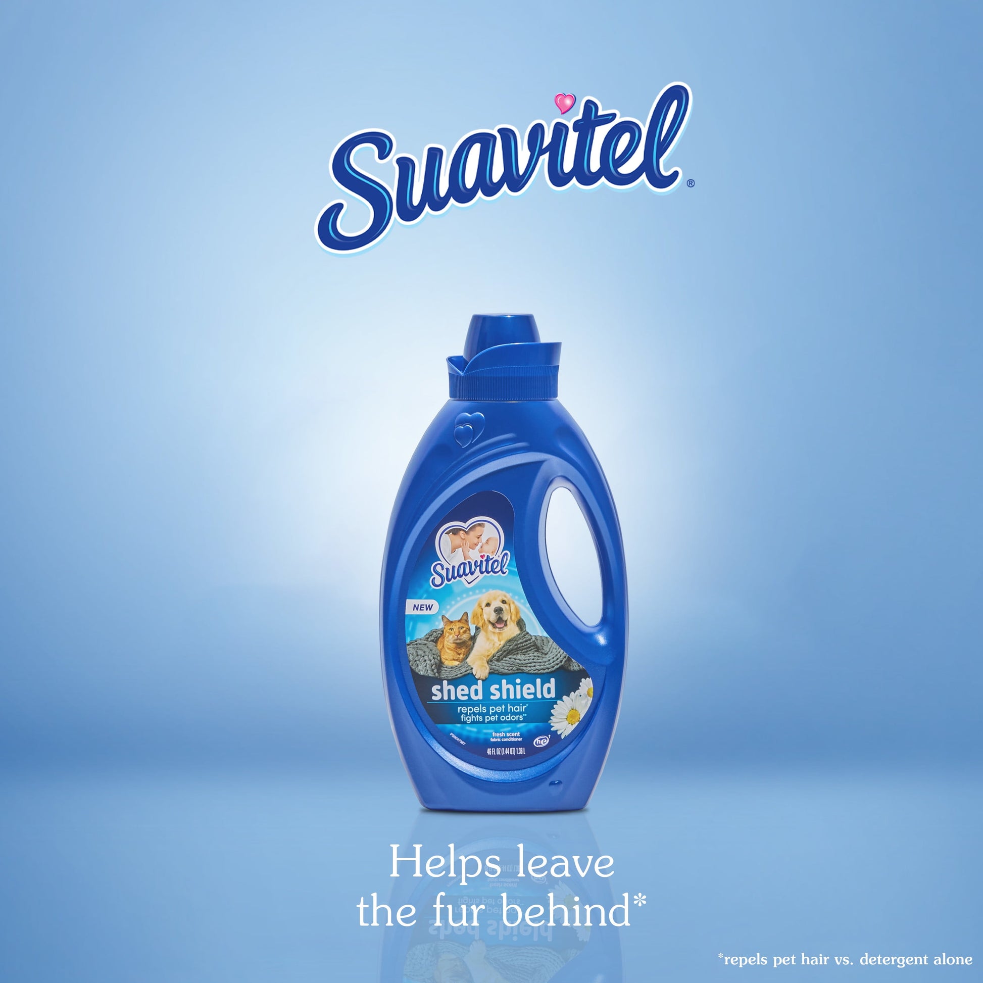 Introducing Suavitel Shed Shield, fresh scent, is the ideal solution designed specifically for pet parents who want to win the fight against pet hair and odors. Suavitel Shed Shield helps you leave the fur behind by repelling pet hair compared with using detergent alone. Make Suavitel Shed Shield your go-to fabric conditioner to win the fight against pet fur mess. Suavitel Shed Shield effectively repels pet hair versus using detergent alone (1). You can now worry less about fur sticking to your clothes and enjoy the fresh scent with every wash. Our formula fights pet odor vs detergent alone (2). Having been tested on cotton and cotton-polyester fabrics, this fabric conditioner helps your laundry stay fresh. We understand the unique challenges that pet parents face, that's why Suavitel Shed Shield is specifically designed for you. Suavitel addresses your needs and helps your fabrics fight pet fur compared with only using detergent. Shed Shield not only repels pet hair (1) and fights odors (2), but it also leaves your fabrics soft and comfortable to touch. The Fresh Scent provides a harmonious combination of soft floral top notes and juicy fruity mid notes. Suavitel Shed Shield is compatible with all washing machines, including HE compatible (3), making it convenient for every pet parent. You can trust Shed Shield to provide outstanding results without any hassle. Suavitel Shed Shield allows you to focus on the love and companionship of your furry friends, without worrying about the mess they leave behind. Help your clothes stay fresh while repelling pet hair (1) and fighting pet odor (2) with Suavitel Shed Shield.