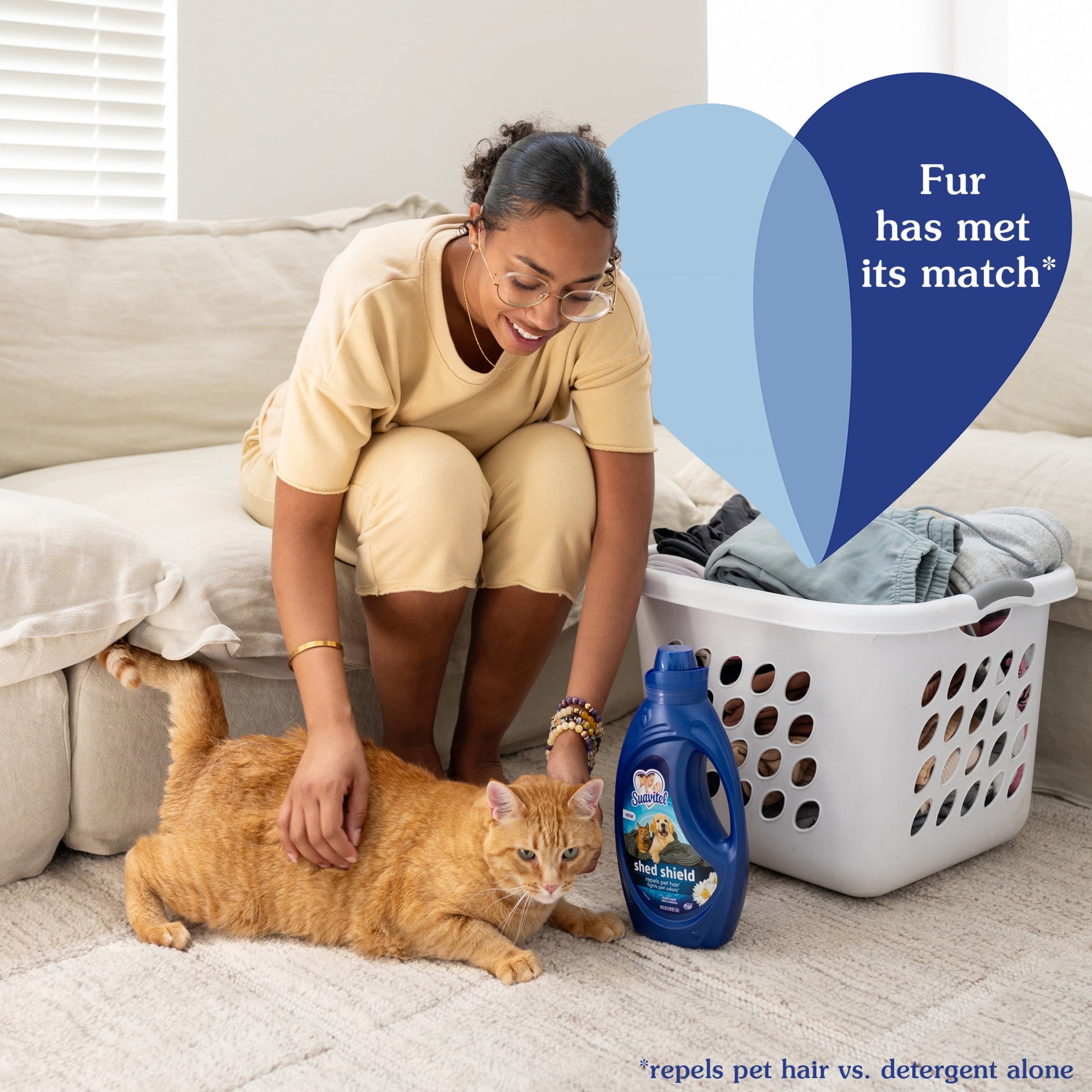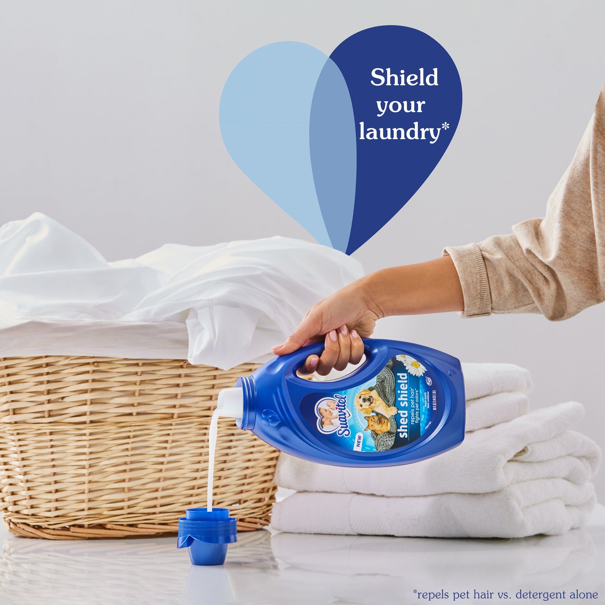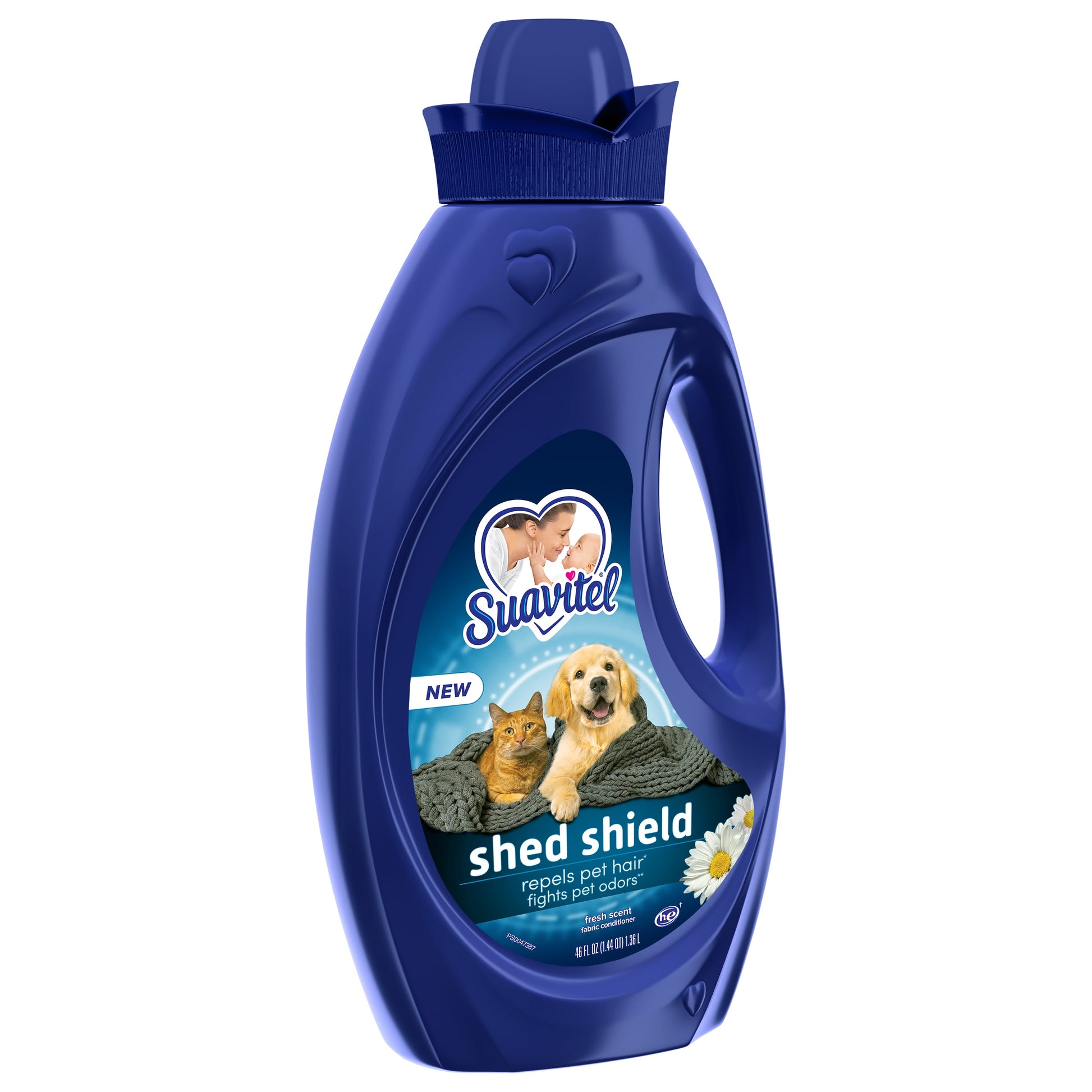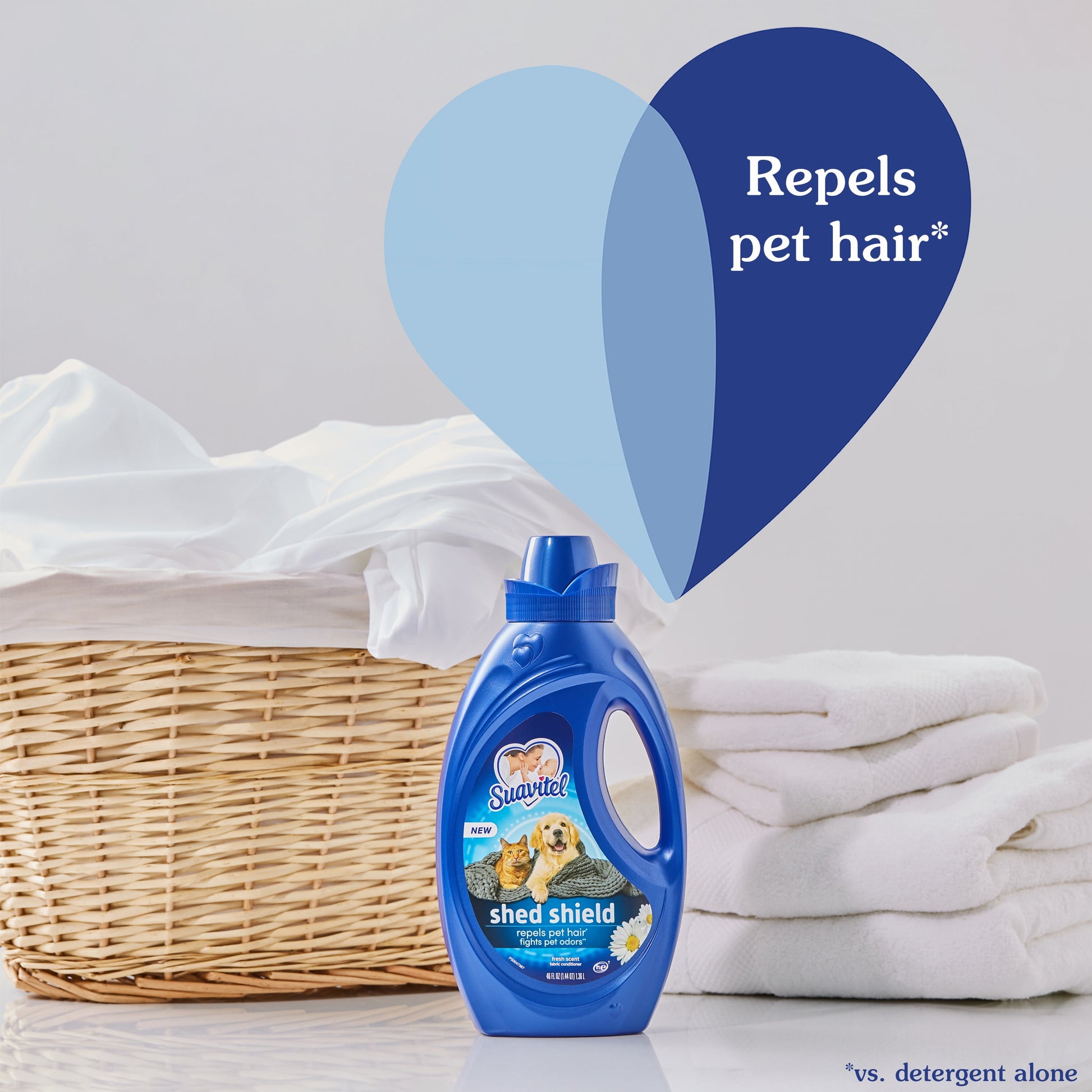 Introducing Suavitel Shed Shield, fresh scent, is the ideal solution designed specifically for pet parents who want to win the fight against pet hair and odors. Suavitel Shed Shield helps you leave the fur behind by repelling pet hair compared with using detergent alone. Make Suavitel Shed Shield your go-to fabric conditioner to win the fight against pet fur mess. Suavitel Shed Shield effectively repels pet hair versus using detergent alone (1). You can now worry less about fur sticking to your clothes and enjoy the fresh scent with every wash. Our formula fights pet odor vs detergent alone (2). Having been tested on cotton and cotton-polyester fabrics, this fabric conditioner helps your laundry stay fresh. We understand the unique challenges that pet parents face, that's why Suavitel Shed Shield is specifically designed for you. Suavitel addresses your needs and helps your fabrics fight pet fur compared with only using detergent. Shed Shield not only repels pet hair (1) and fights odors (2), but it also leaves your fabrics soft and comfortable to touch. The Fresh Scent provides a harmonious combination of soft floral top notes and juicy fruity mid notes. Suavitel Shed Shield is compatible with all washing machines, including HE compatible (3), making it convenient for every pet parent. You can trust Shed Shield to provide outstanding results without any hassle. Suavitel Shed Shield allows you to focus on the love and companionship of your furry friends, without worrying about the mess they leave behind. Help your clothes stay fresh while repelling pet hair (1) and fighting pet odor (2) with Suavitel Shed Shield.