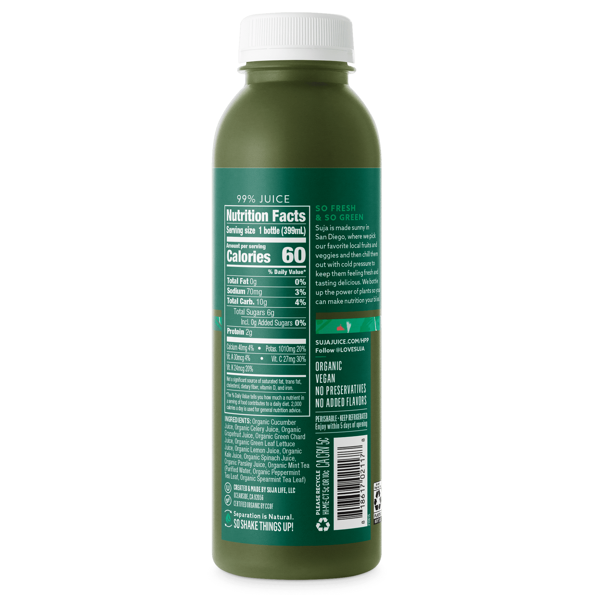So fresh and so green, Suja Organic Cold-Pressed Uber Greens is an earthy, nutrient dense green juice full of leafy greens, tangy citrus and revitalizing mint tea and is the best way to drink your veggies and gulp your greens. Featuring cucumber, celery, grapefruit, green chard, green leaf lettuce, lemon, kale, spinach, parsley, peppermint and spearmint tea. Suja Organic Cold-Pressed Uber Greens is USDA Certified Organic, Non-GMO Project Verified, Gluten-free, Dairy-free, vegan, and high pressure processed (HPP) to maintain nutrients and fresh taste. Suja is made sunny in San Diego, where we pick our favorite local fruits and veggies and then chill them out with cold pressure to keep them feeling fresh and tasting delicious. We bottle up the power of plants so you can make nutrition your bliss!