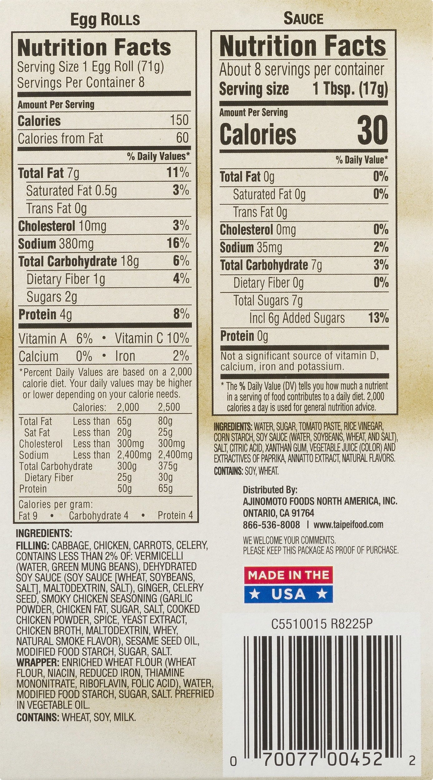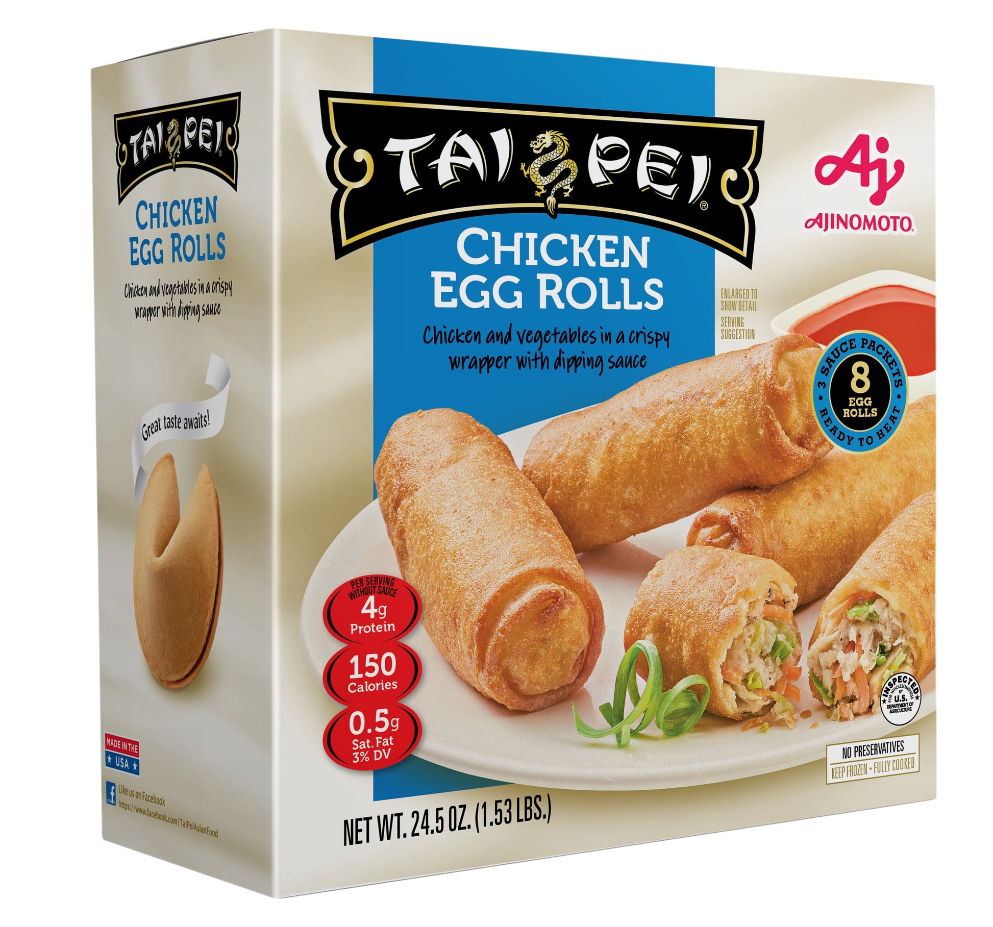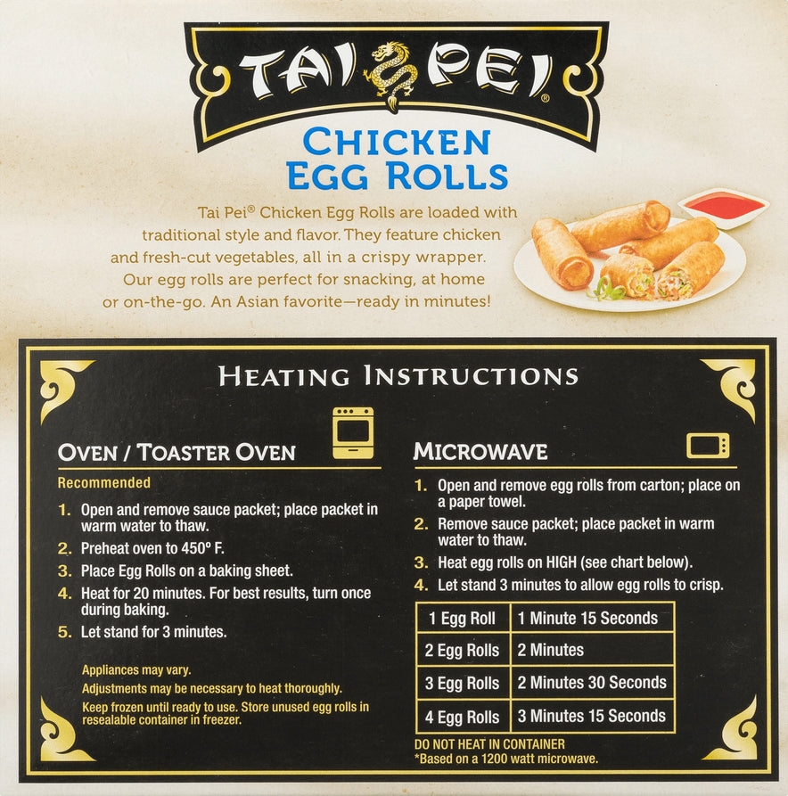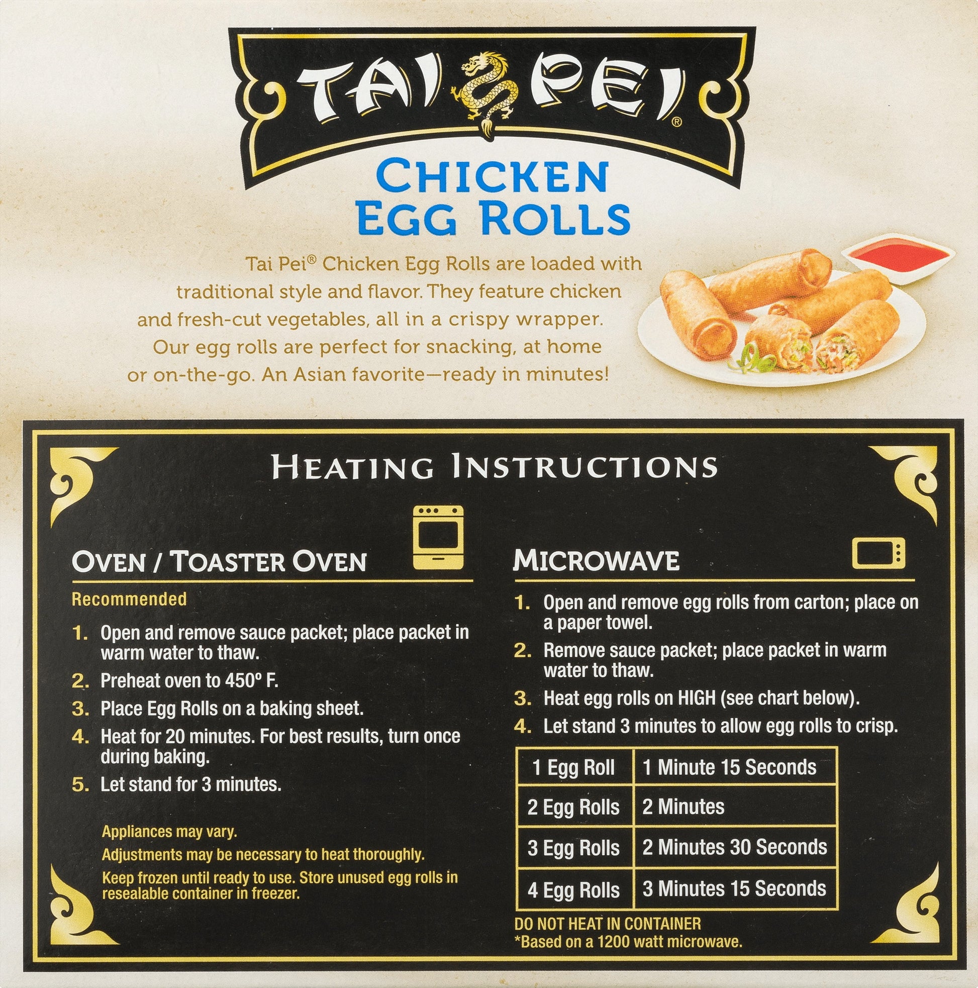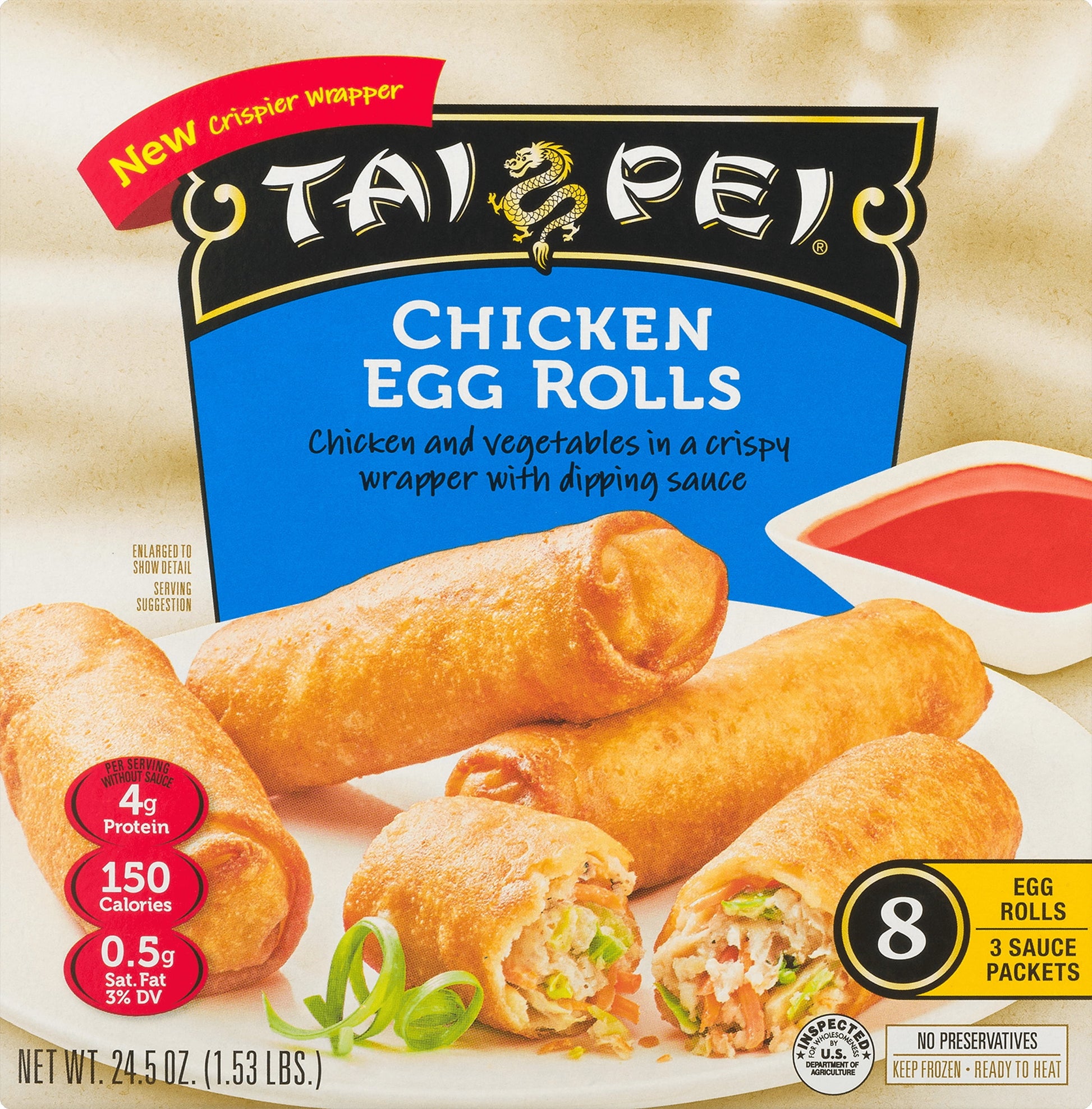 Tai Pei Chicken Egg Rolls Frozen Asian Appetizers 24.5 oz. - inspired by your neighborhood Chinese take-out restaurant, Tai Pei Chicken Egg Rolls are the perfect snack, appetizer or meal. Packed with savory chicken, flavorful vegetables and seasonings, all rolled up in a delicious flaky wrapper. Tai Pei, Meal Accomplished! Find us in the freezer aisle. Perfectly paired with our signature dipping sauce.