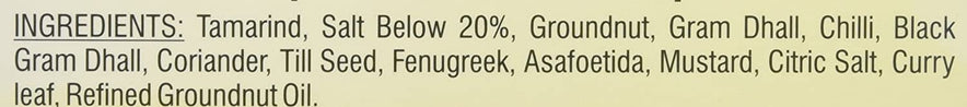 Tamarind, Salt Below 20%, Peanuts, Gram Dal, Chilly, Black Gram Dal, Coriander, Sesame Seed, Fenugreek, Mustard, Lemon, Salt, Curry leaves, Refined Peanuts Oil.