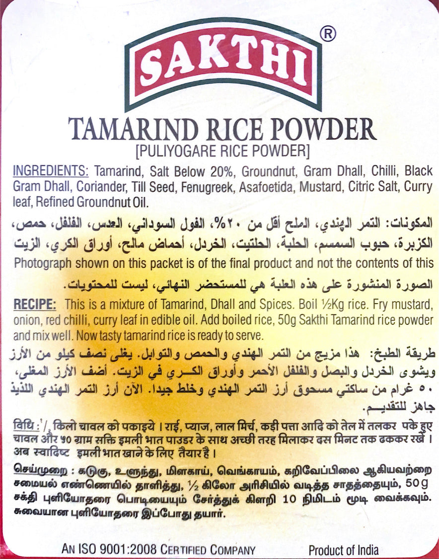 Tamarind, Salt Below 20%, Peanuts, Gram Dal, Chilly, Black Gram Dal, Coriander, Sesame Seed, Fenugreek, Mustard, Lemon, Salt, Curry leaves, Refined Peanuts Oil.