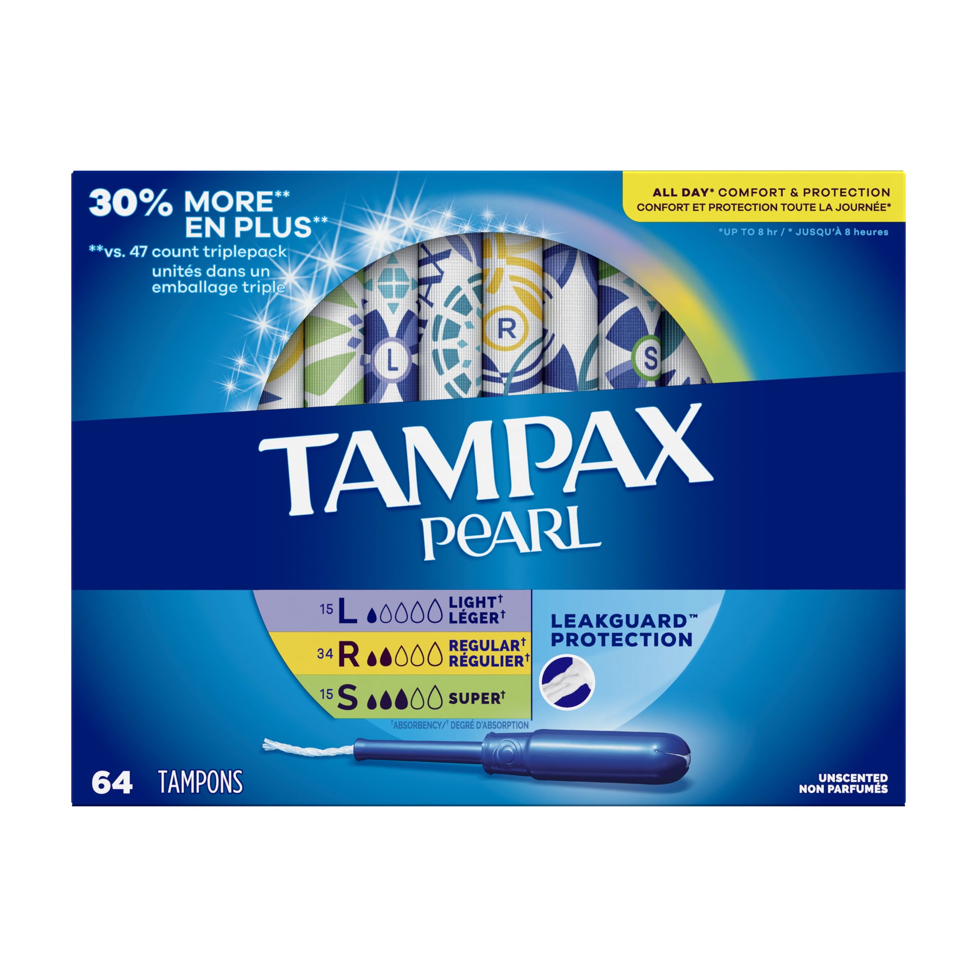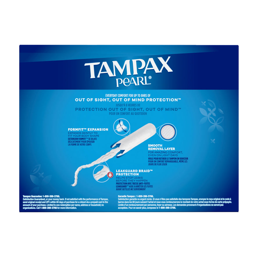 It's time to Tampax and live your life without limits. Get incredible all day comfort and protection for up to eight hours with Tampax Pearl tampons. Choose from five different absorbencies to match your changing flow. Got leaks? Go up an absorbency. Uncomfortable to remove? Go down an absorbency. Designed with a LeakGuard Braid to help stop leaks before they happen. Tampax Pearl Light/Regular/Super Absorbency provides protection you can feel good about. Free of dyes, perfume, latex*, BPA, and elemental chlorine bleaching. Get amazing protection with Tampax, the #1 U.S. Gynecologist recommended tampon brand**. Discover your perfect flow combo and get the protection you need. *natural rubber latex **based on 2022 survey. 64 Ct. Unscented.