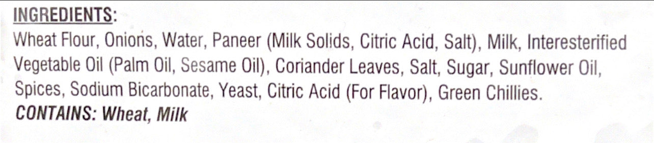 Ingredients: wheat flour, milk, onions, water, paneer, corn oil, salt, coriander leaves, spices, sodium bicarbonate, green chilli, citric acid.