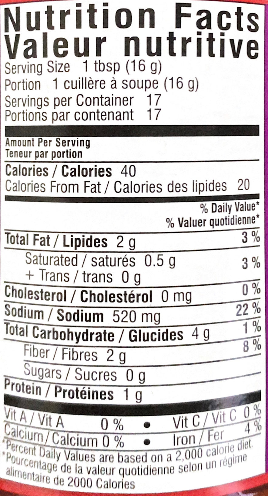 Ingredients: Garlic (65%), Corn Oil, Tamrind (10%), Salt (8%), Coriander, Cumin, Ginger, Lentils, Red Chili Powder, Citric Acid, Turmeric, Acetic Acid, Sodium Benzoate (E211), Colors: F.D.&C Red No. 3 (Erythrosine), F.D.&C. Yellow No. 6. (Sunset Yellow FCF).