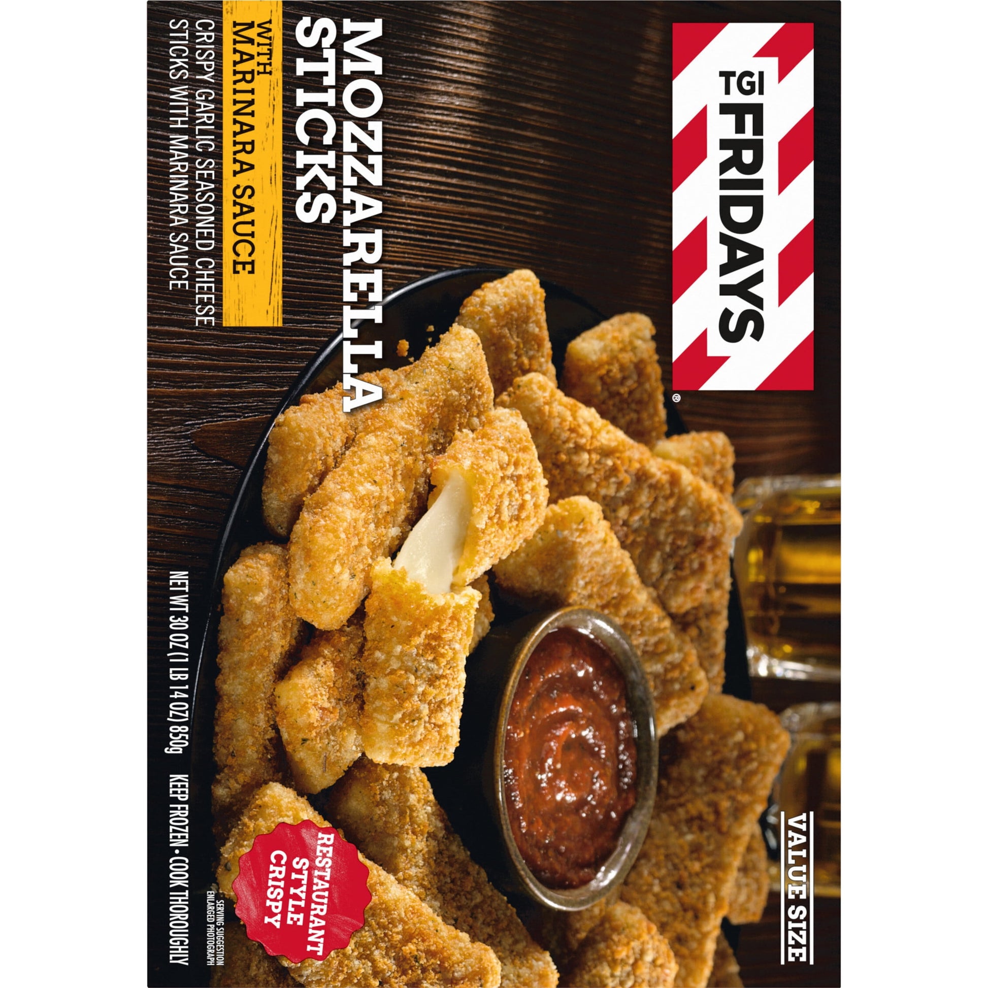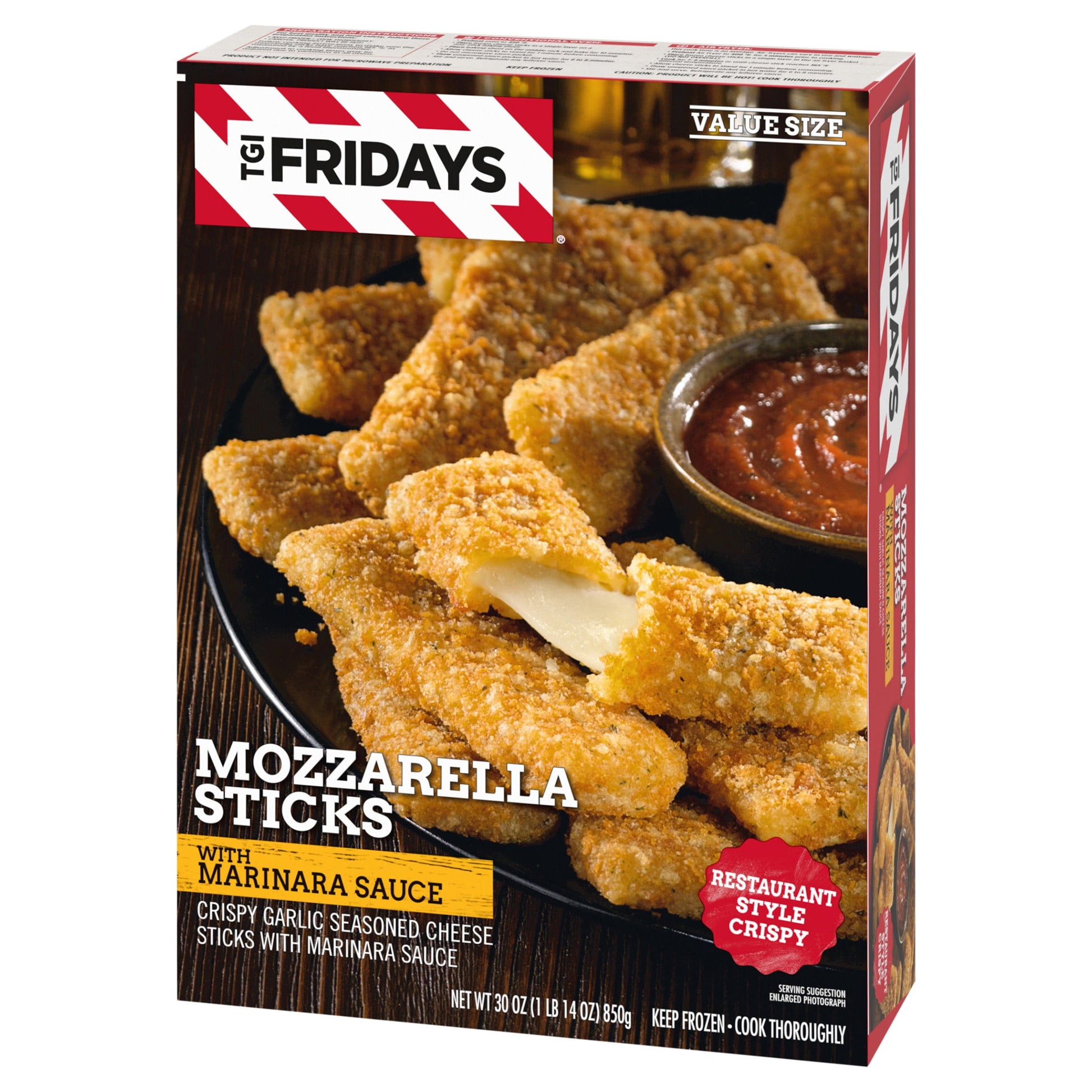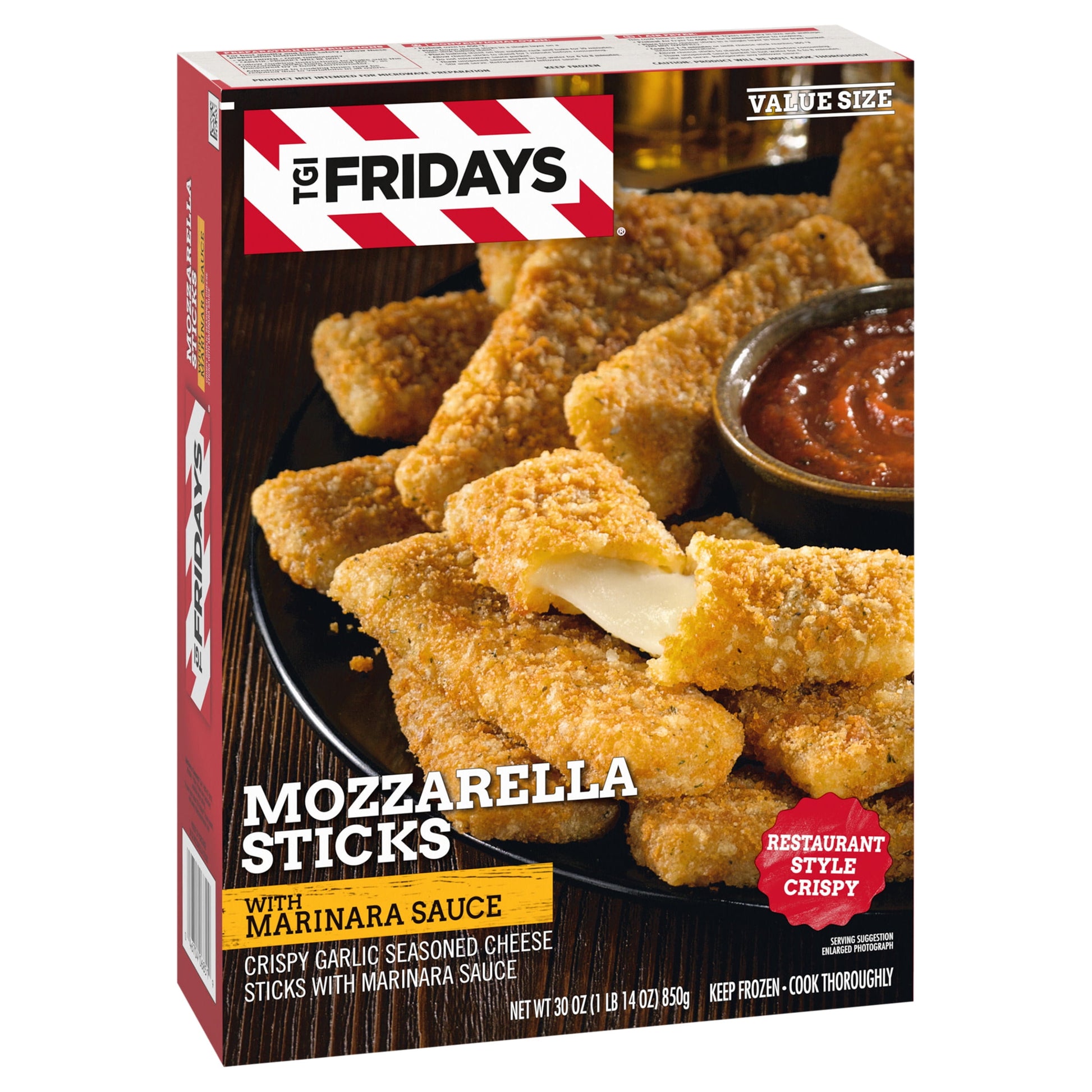 Enjoy your TGI Fridays menu favorites at home with our easy restaurant style appetizers. Ready to heat, TGI Fridays Mozzarella Sticks with Marinara Sauce are a quick and delicious appetizer or party food. Our mozzarella sticks are made with real mozzarella cheese that is coated with a crispy, garlic-seasoned panko breading and served with a zesty marinara dipping sauce. Packaged in a box for convenient storage, you can heat our mozzarella sticks in a conventional oven. Store our 30-ounce box of mozzarella sticks in the freezer until ready to prepare. Whether you’re craving mozzarella sticks, chicken wings, potato skins, spinach artichoke dip, chicken bites, jalapeno poppers or sliders, TGI Fridays has frozen appetizers the whole family will enjoy. Giant