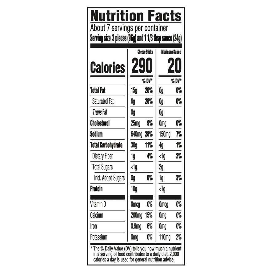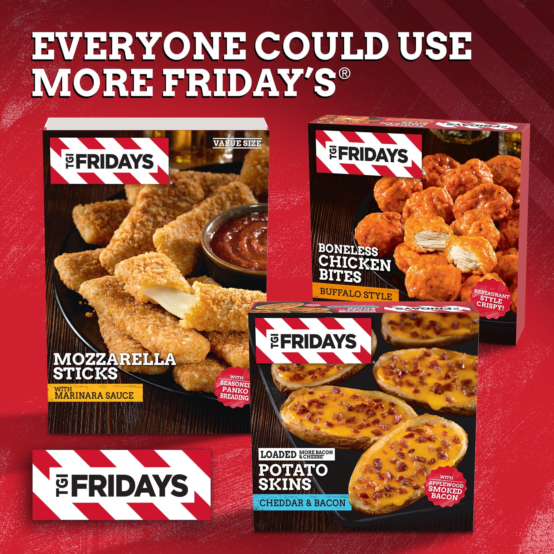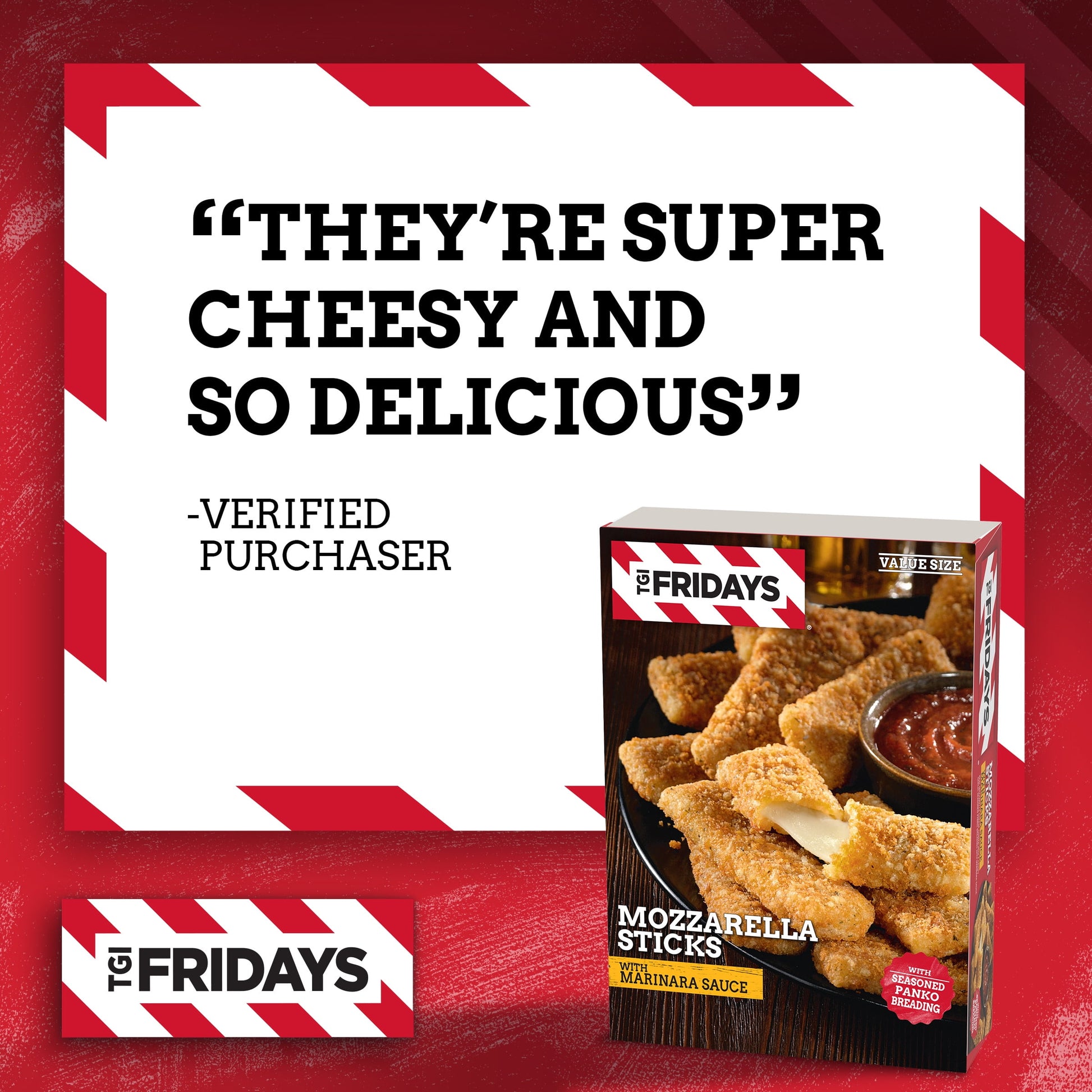 Enjoy your TGI Fridays menu favorites at home with our easy restaurant style appetizers. Ready to heat, TGI Fridays Mozzarella Sticks with Marinara Sauce are a quick and delicious appetizer or party food. Our mozzarella sticks are made with real mozzarella cheese that is coated with a crispy, garlic-seasoned panko breading and served with a zesty marinara dipping sauce. Packaged in a box for convenient storage, you can heat our mozzarella sticks in a conventional oven. Store our 30-ounce box of mozzarella sticks in the freezer until ready to prepare. Whether you’re craving mozzarella sticks, chicken wings, potato skins, spinach artichoke dip, chicken bites, jalapeno poppers or sliders, TGI Fridays has frozen appetizers the whole family will enjoy. Giant