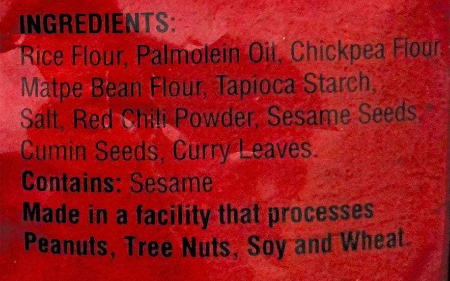Ingredients: Rice Flour, Palmolein Oil, Chickpea Flour, Split Matpe Beans Flour, Salt, Red Chili Powder, Sesame Seeds, Cumin, Curry Leaves, Natural Flavour, Ascorbic Acid.