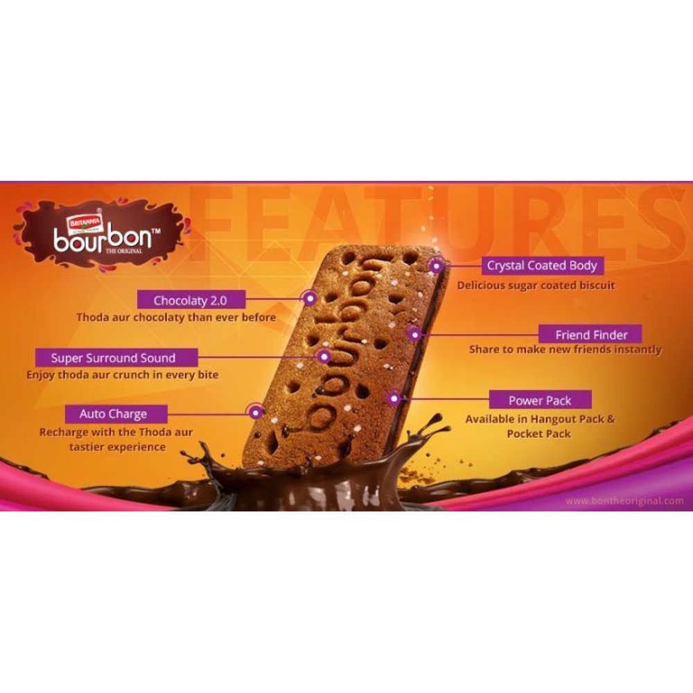 Thick, rich and delicious chocolate packed between two crunchy chocolate biscuits, topped with sugar crystals - presenting, the original Bourbon, from the house of Britannia. India's first and favorite Bourbon's sweet adventure began in 1955. Since then, Bourbon lovers across the country have been caught opening this chocolate couplet, licking the cream, and nibbling at the melt-in-your-mouth biscuit, bit by bit. Some have been witnessed chomping it whole, at one go. Some have been noted to alternate it with sips of coffee; others team it with lots of gossip and gupshup, while a few have been observed enjoying it with a book. And some have been seen reluctantly sharing their Bourbon. Whatever the occasion, wherever the hangout, Bourbon makes for great company. You can grab your very own Nano Pack or a Pocket Pack. The Hangout Pack is just right for chilling with friends. Take along a Party Pack for... yes, a party! And the Gift Pack will surely win you a few brownie points! So go on, give yourself a happy high with a quick dose of Britannia Bourbon!