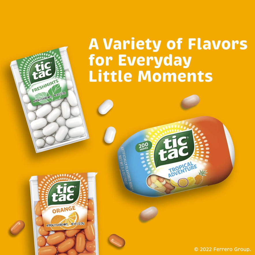 Enjoy the taste of Tic Tac Fruit Adventure mints. Each 3.4-ounce pack is filled with delicious mints ready to boost your confidence and refresh your day. Enjoy 100 layers of satisfying and delicious flavor in each mint in this pack of Tic Tac Fruit Adventure mints. The portable pack fits perfectly in your pocket or purse for on-the-go sharing. These gluten-free mints are satisfying and GMO-free! Tic Tac is an iconic brand of beloved mints. Whether you enjoy one or the whole pack, you've got a variety of flavors and sizes to choose from.
