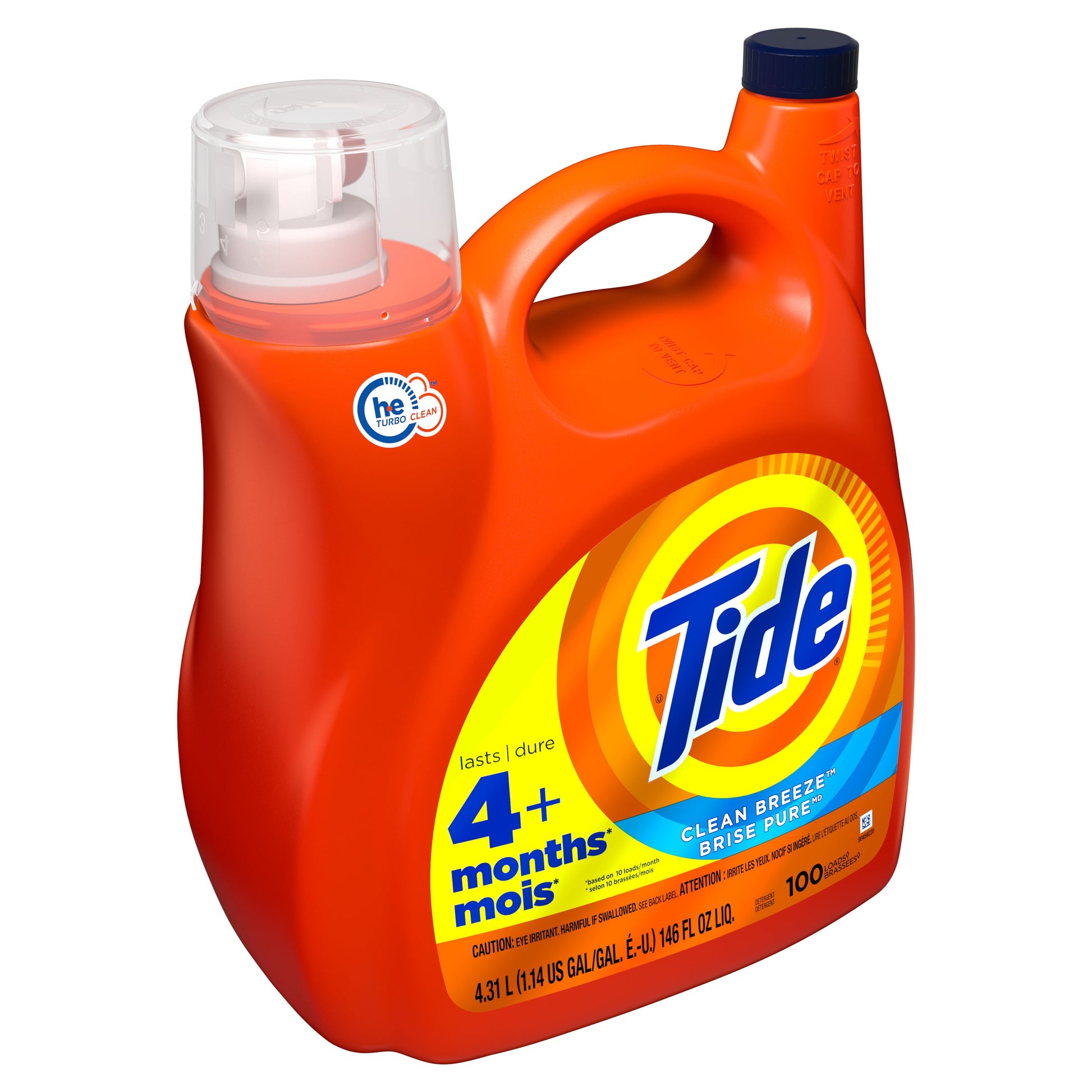 America's #1 detergent*, now even better. This Tide liquid laundry detergent has an improved formula engineered to attack tough body soils. Tide's HE Turbo Clean detergents feature Smart Suds technology. The quick-collapsing suds clean faster and rinse out quicker, even in cold cycles. Tide HE laundry detergent keeps your whites white and your colors colorful with a refreshing scent, wash after wash. Available in Original and Clean Breeze scents. The Tide clean you love is also available in Tide PODS laundry pacs.* Tide, based on sales, Nielsen laundry detergent category.146 fl oz