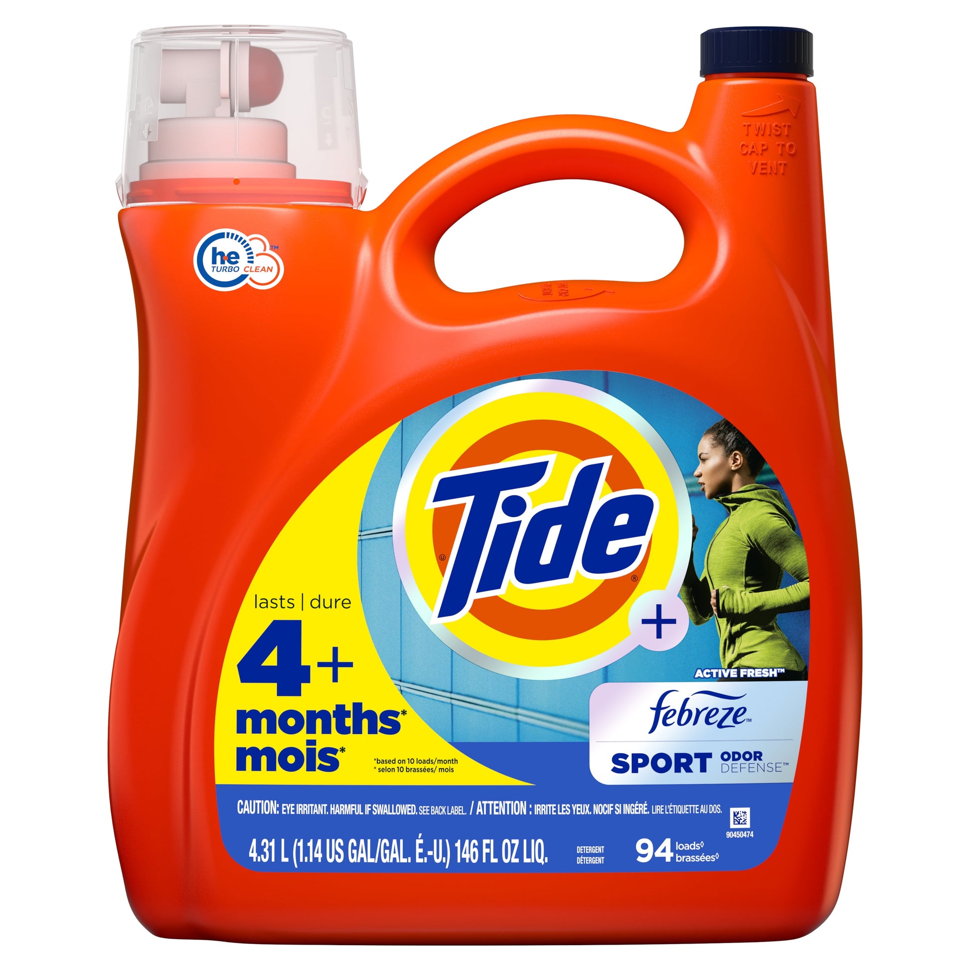Tide Plus Febreze Sport Odor Defense HE Turbo Clean liquid laundry detergent offers excellent clean and odor removal, plus the Febreze freshness that helps your workout and athletic gear stay fresh up to 3x longer*. It effectively targets tough stains and removes even week-old sweat odors. Also, the Tide's formula contains special scent-renewal technology that releases freshness as you move, helping keep your fabrics smelling great all day. Enjoy a wonderful scent experience that lasts and benefit from even more odor-fighting power. *vs. Tide Original. 146 Fluid Ounces