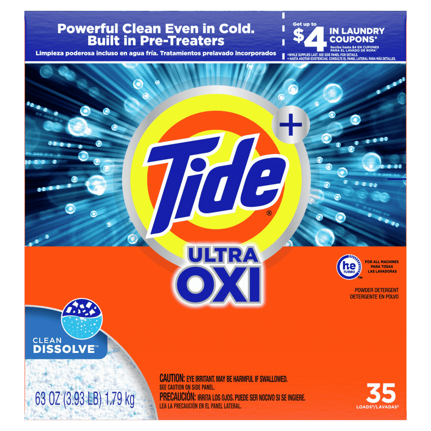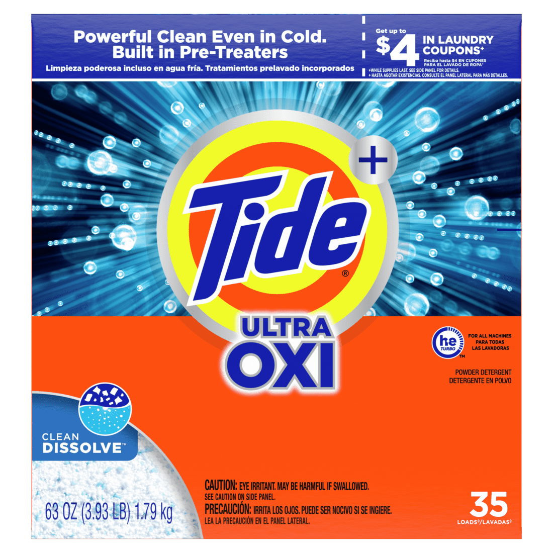 New Tide Ultra OXI laundry detergent powder. Better Cleaning with Ultra OXI Power for your money*. Tide Ultra OXI Powder targets tough set-in odors deep down in clothing fibers for a fresh deep clean. With the combination of built-in pre-treaters, surfactants and enzymes, this powerful powder detergent effectively attacks even 14 day old stains, all in one step. Also try Tide PODS Ultra Oxi for a superior cleaning convenient experience.*vs. Tide Original. 63 oz.