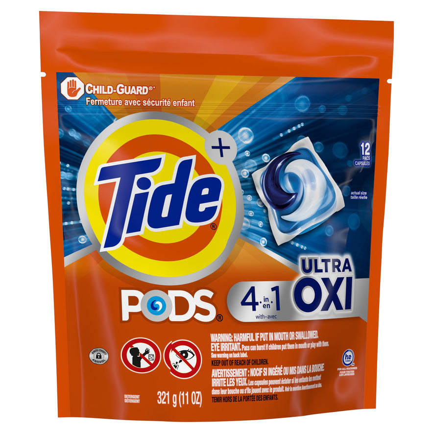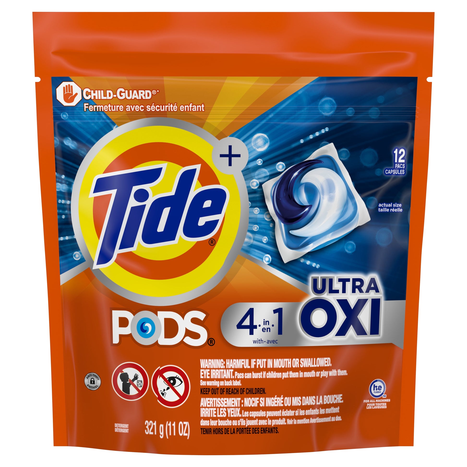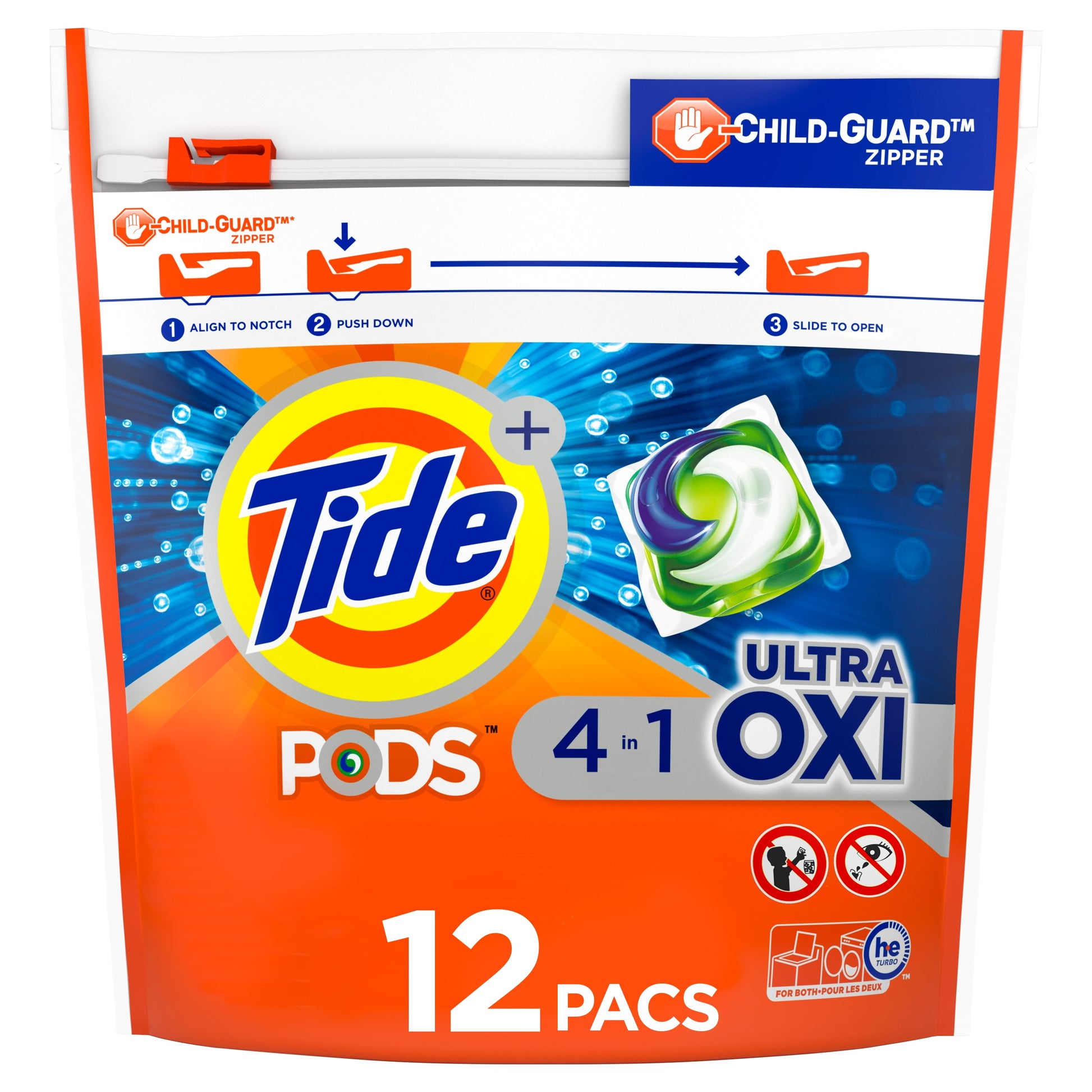 New Tide PODS Ultra OXI laundry detergent pacs. With built-in pre-treaters, Tide PODS Ultra OXI removes even the toughest stains. It’s the 4-in-1 laundry solution with detergent, stain remover, color protector and built-in pre-treaters, for a next-level stain fighting. The special film enables the multi-chamber technology to dissolve in both hot & cold water while the quick collapsing Smart Suds targets tough stains and work in both HE and standard washing machines. 12 count.