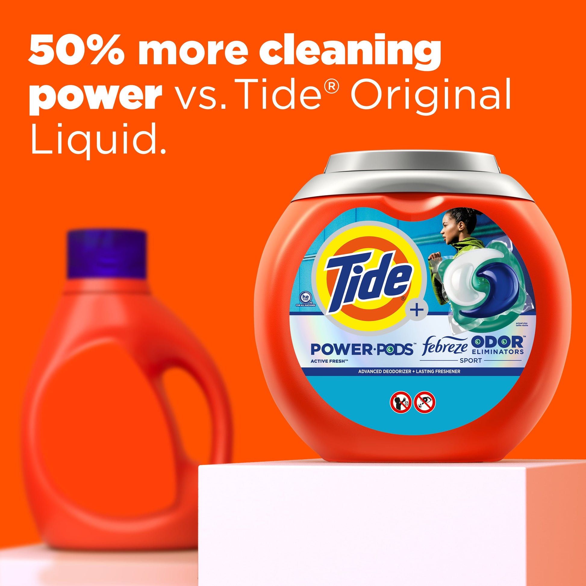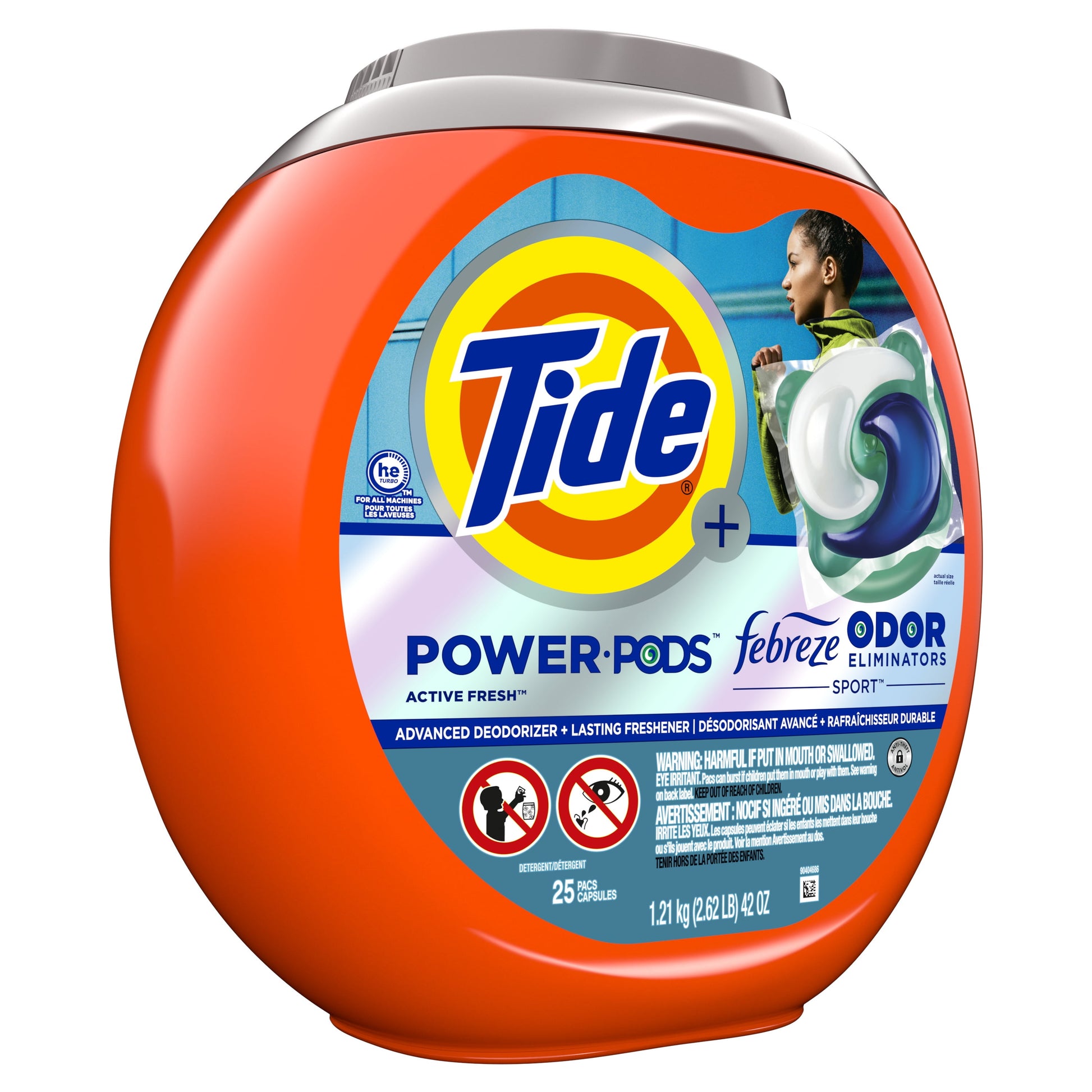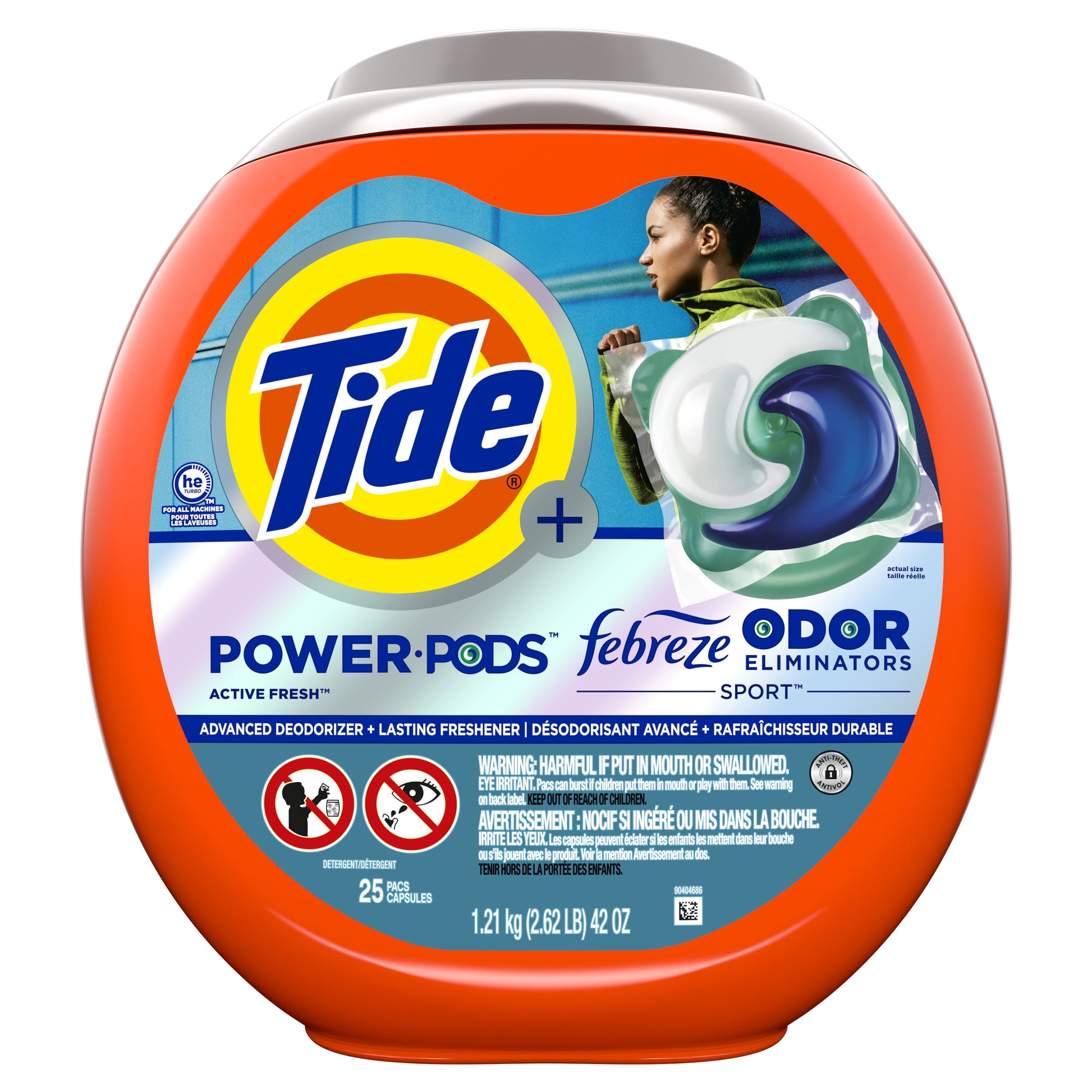 Tide POWER PODS Febreze Odor Eliminators Plus Sport fights tough stains and set-in odors, while providing freshness. Tide POWER PODS have 50% more cleaning power than Tide liquid detergent and are designed to fight stains and odors in every type of load and leaves clothes smelling fresh. With 4-in-1 technology, Tide Plus Febreze delivers a combination of concentrated detergent, Febreze odors eliminators, stains removers, and long-lasting freshness all-in-one solution, perfect for handling your stinky workout and athletic gear. Tide POWER PODS Plus Febreze help eliminate set-in stink at the source, while leaving garments with a good-smelling Active Fresh scent. 25 Count.