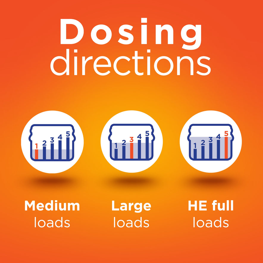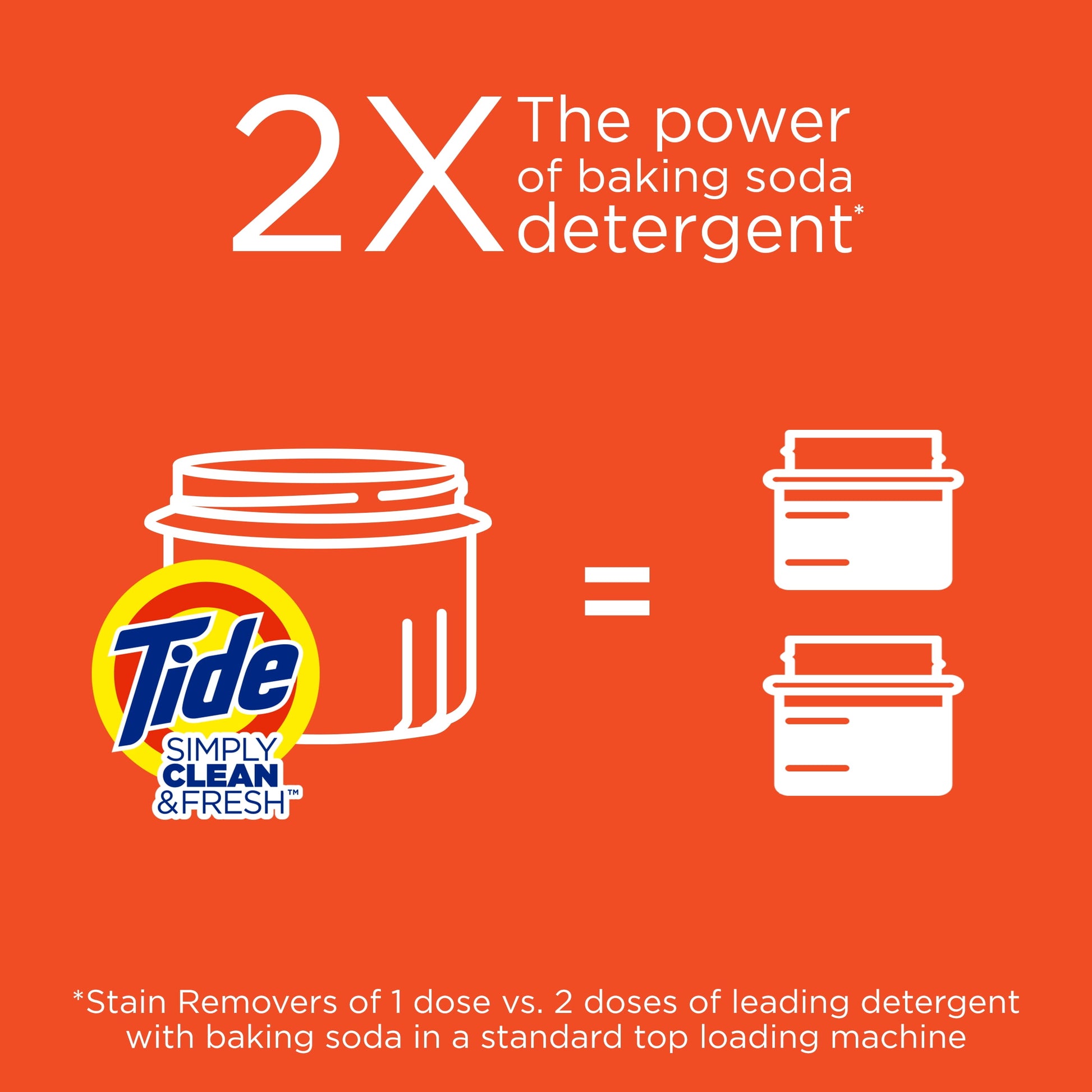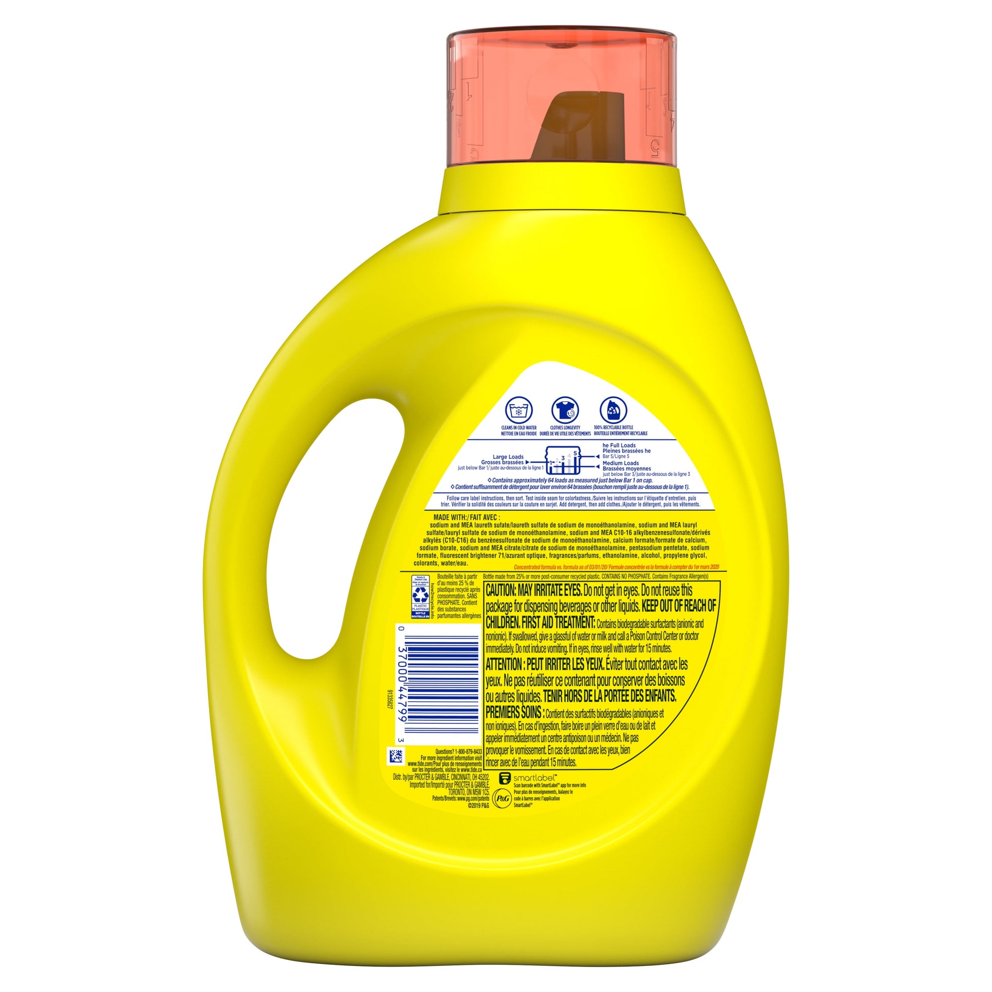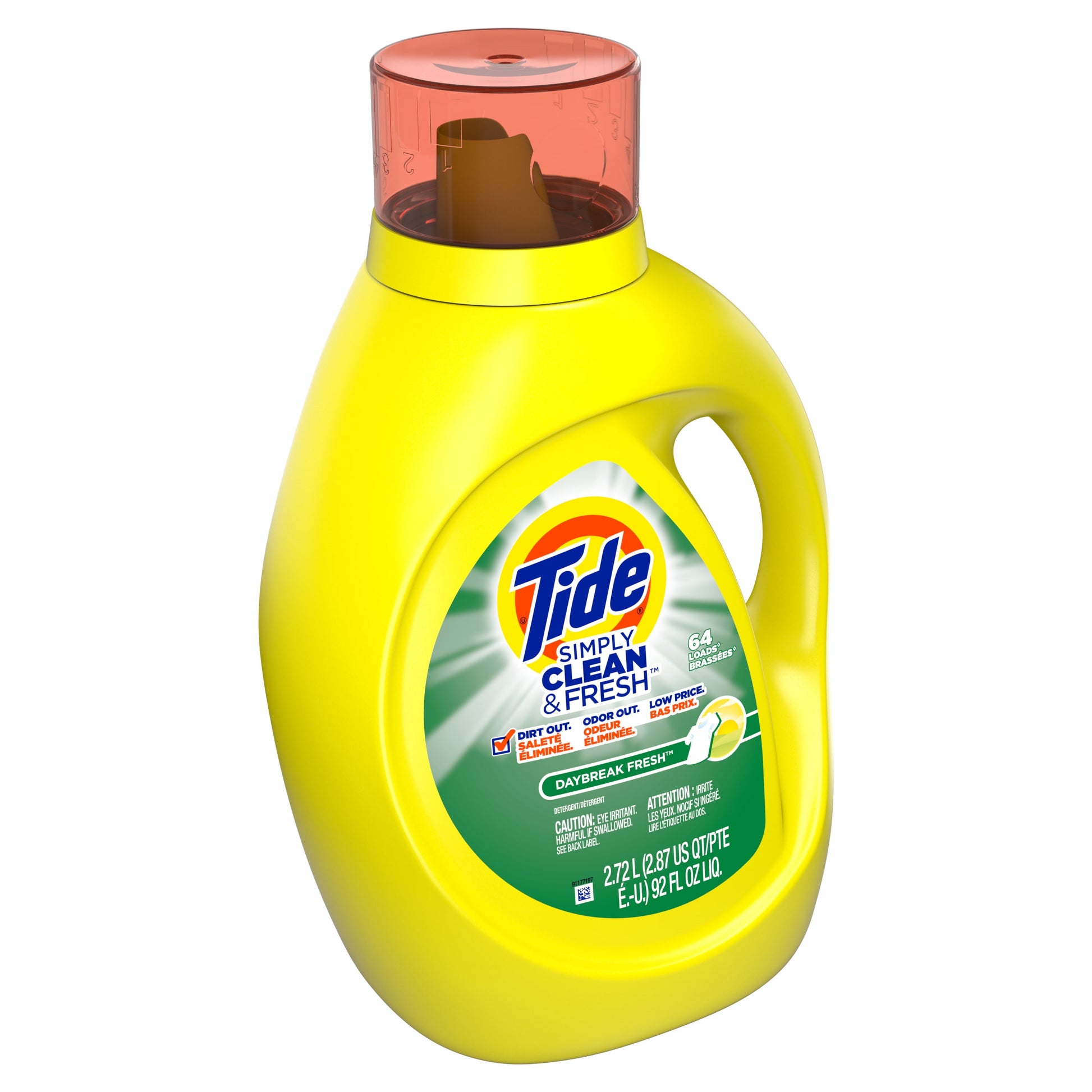 Tide Simply All-In-One liquid laundry detergent that tackles 99% of the most common stains and odors. This All-in-one detergent tackles stains, odors, has a fresh scent & works in cold water. It is now more concentrated to provide more stain removal and freshness and less water*. From Canada’s #1 detergent, ** to cover your many laundry needs. Also try our powerful Tide PODS laundry pacs. Measure your loads with cap. For medium loads, fill to bar 1. For large loads, fill to bar 3. For HE full loads, fill to bar 5. Add clothes, pour into dispenser, start washer. * vs. previous formula ** based on sales. 92 fl oz