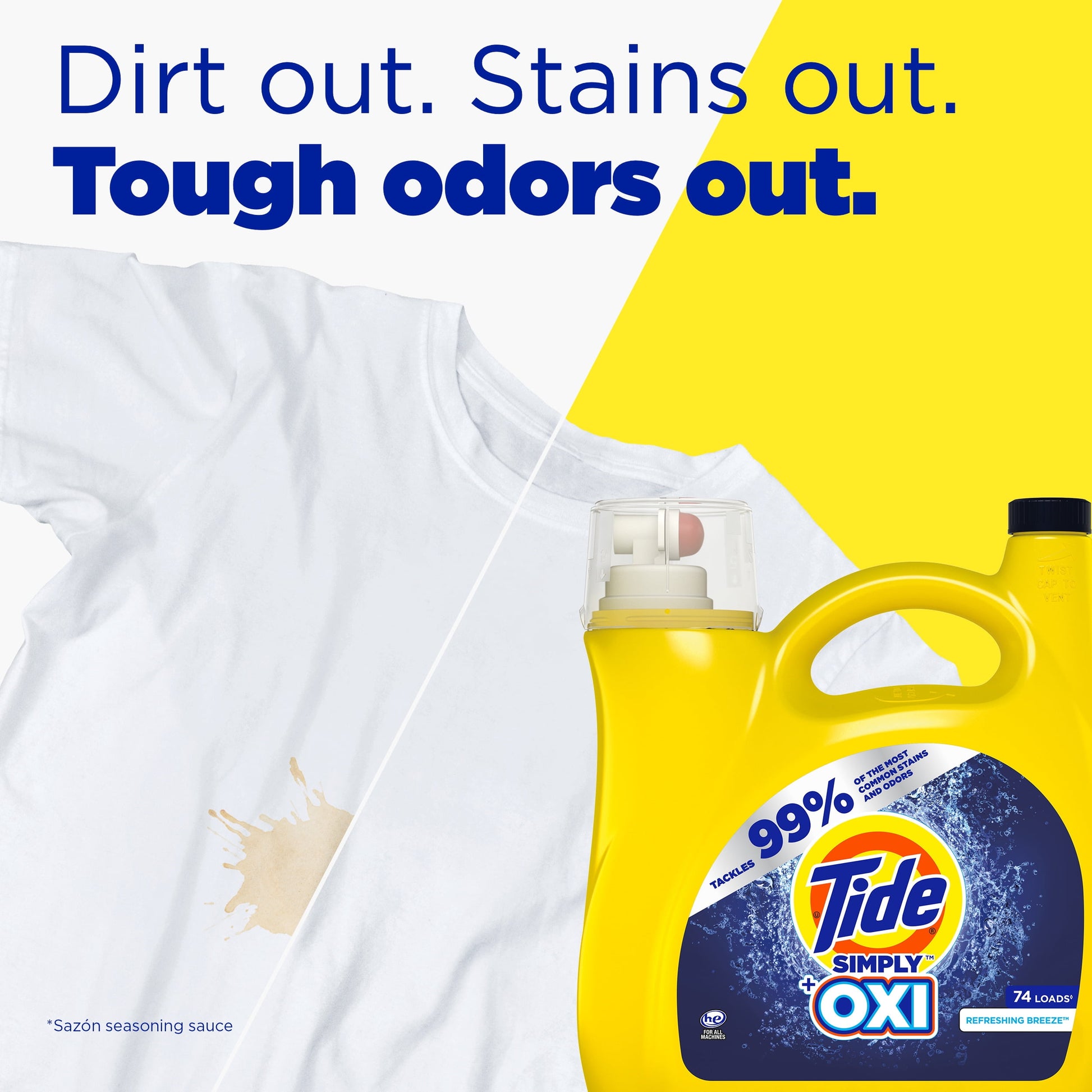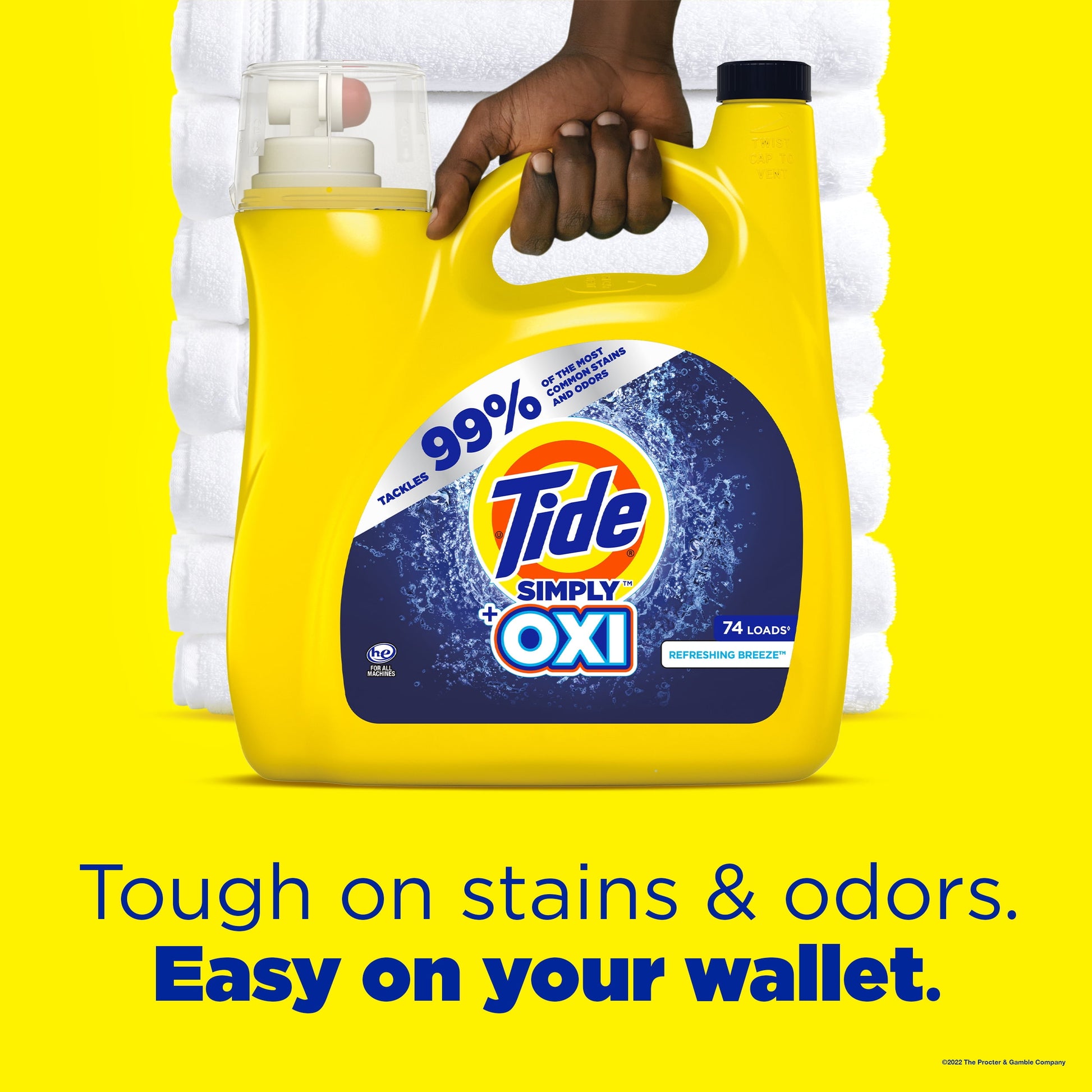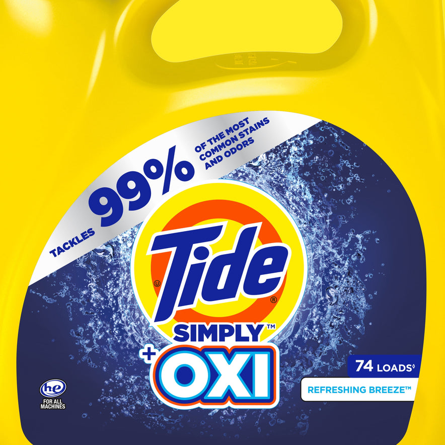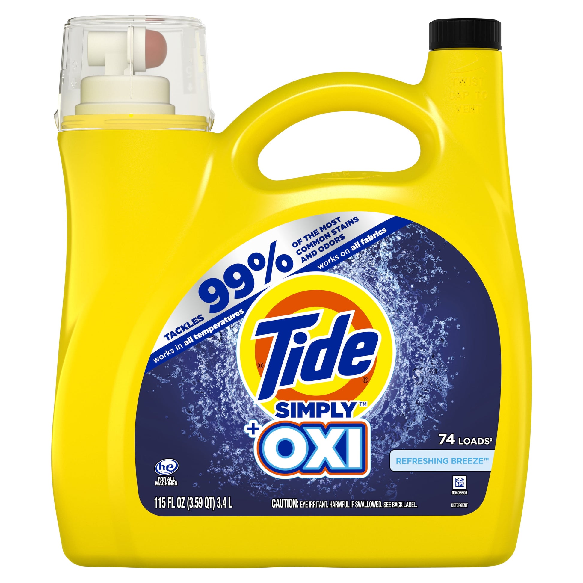 Tide Simply Plus Oxi Liquid Laundry Detergent fights stains and odors with twice the Oxi fighting power (1), where all you need is one dose per load with no need to pretreat. Tide Simply Plus Oxi targets those tough odors deep in the fibers of your clothes and is available at a great low price. The Refreshing Breeze scent infuses your clothes with floral, fruity and woody notes for a fresh, clean scent every time. It works with both HE and standard washing machines. (1) Stain removal of 1 dose vs 2 doses of the leading detergent with baking soda and Oxi. 115 fl oz.