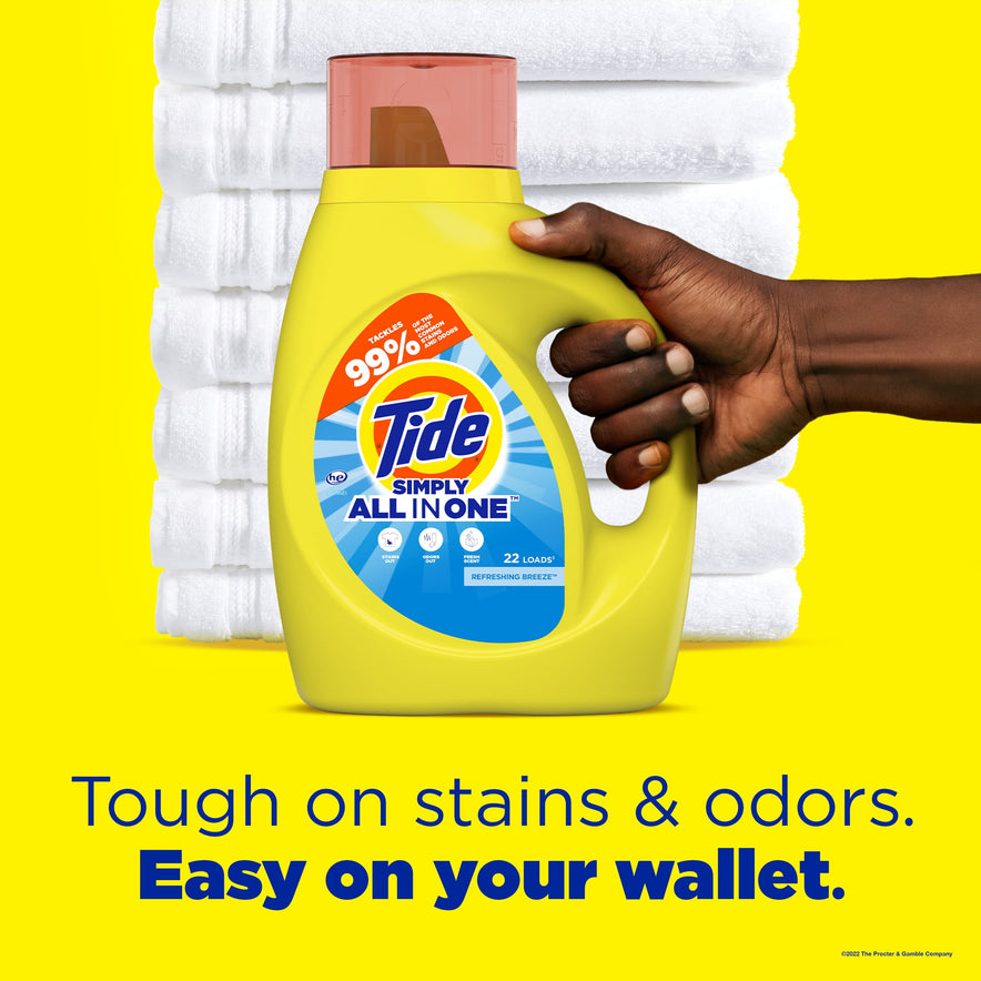 Tide Simply Refreshing Breeze liquid laundry detergent has 2X the baking soda power* to target tough odors deep in the fibers of your clothes. It is now more concentrated to provide more stain removal and freshness and less water*. From America's #1 detergent,** to cover your many laundry needs. Also try our small but powerful Tide PODS laundry pacs. Measure your loads with cap. For medium loads, fill to bar 1. For large loads, fill to bar 3. For HE full loads, fill to bar 5. Add clothes, pour into dispenser, start washer. * vs. previous formula ** based on sales 31 fl oz