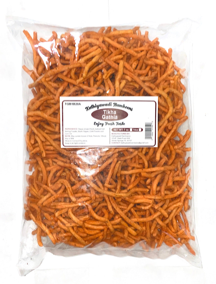 Kathiyawadi Namkeens Tikha Gathiya is a crunchy and spicy deep fried strands made from gram flour dough. It is a household food item in Gujarat and tastes best with deep fried chillies, carrot shreds, salad and mango pickle.