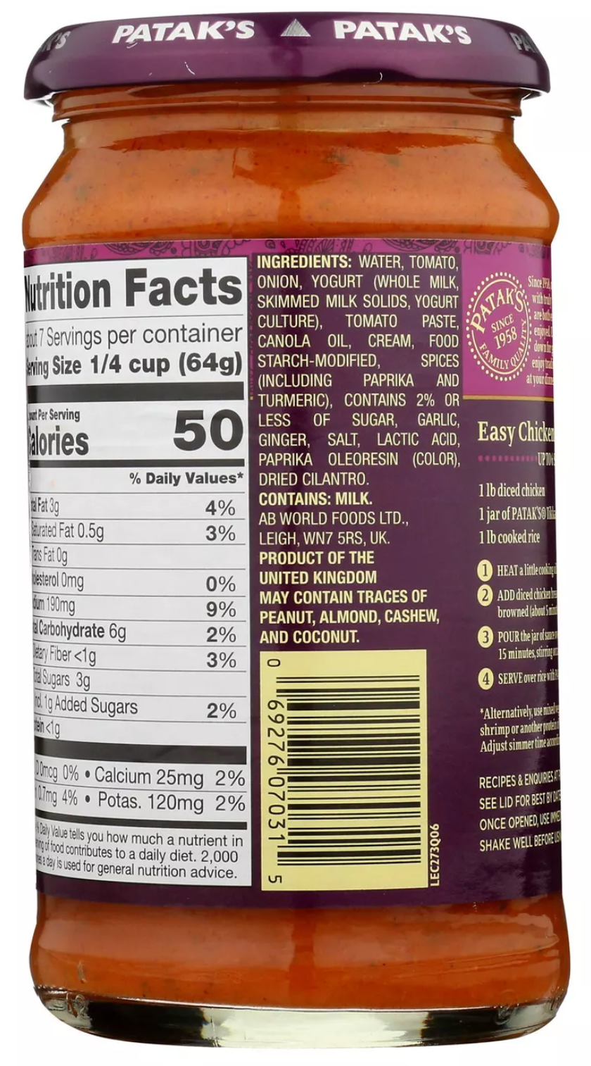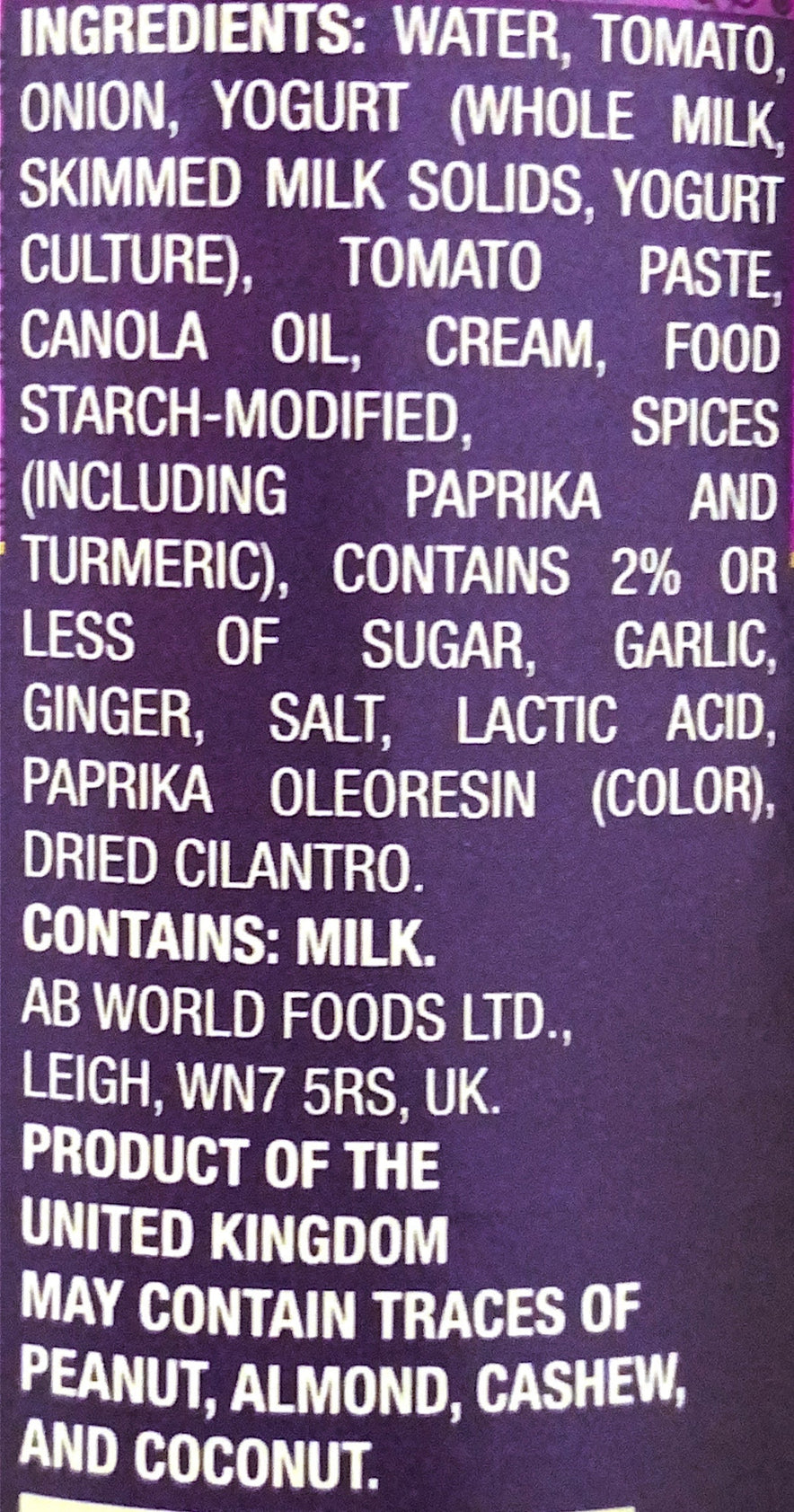 INGREDIENTS: WATER, TOMATO, ONION, YOGURT (WHOLE MILK, SKIMMED MILK SOLIDS, YOGURT CULTURE), TOMATO PASTE, CANOLA OIL, CREAM, FOOD STARCH-MODIFIED, SPICES (INCLUDING PAPRIKA AND TURMERIC), CONTAINS 2% OR LESS OF SUGAR, GARLIC, GINGER, SALT, LACTIC ACID, PAPRIKA OLEORESIN (COLOR), DRIED CILANTRO.