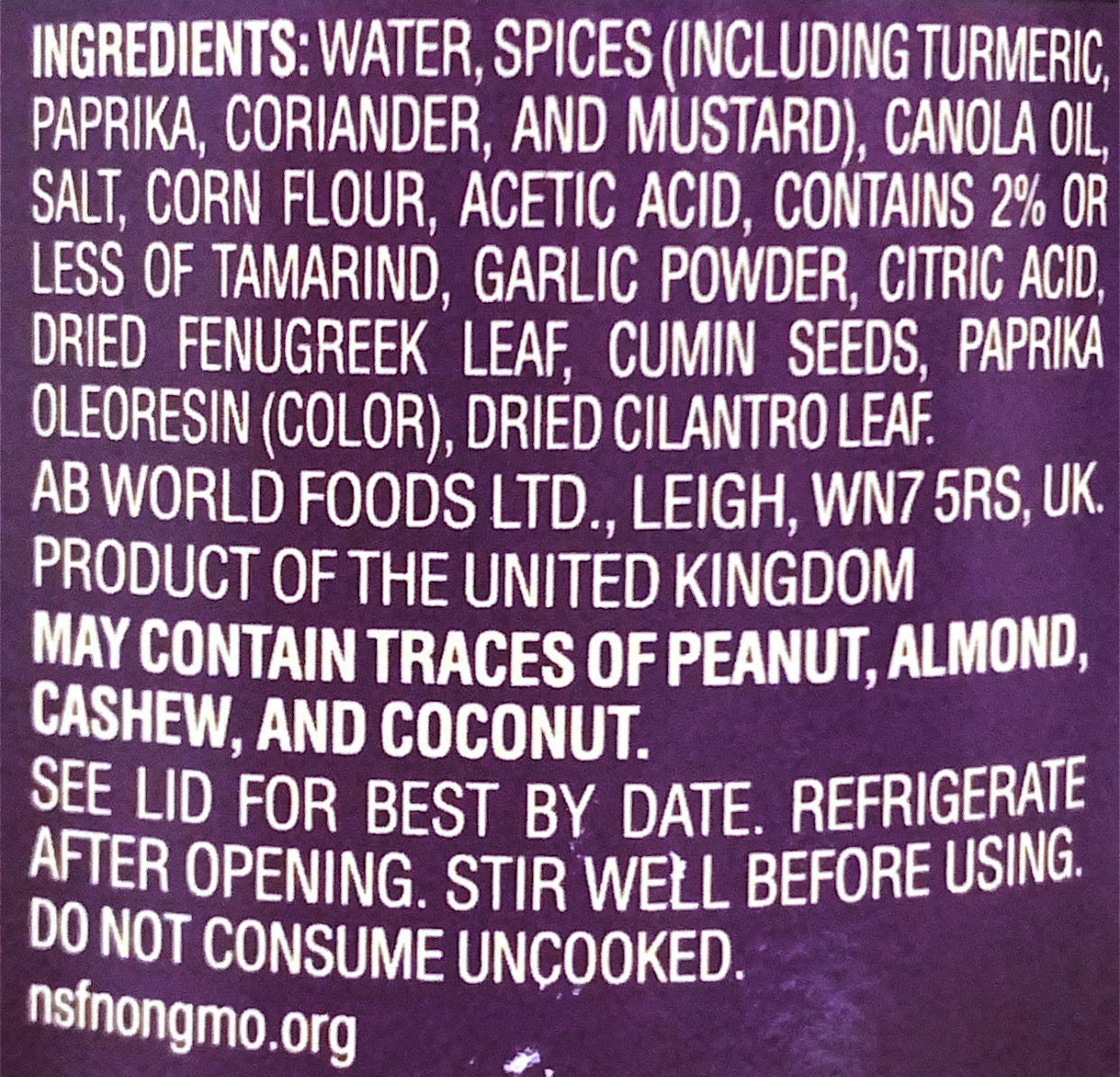 INGREDIENTS: WATER,SPICES(INCLUDINGTURMERIC, PAPRIKA, CORIANDER, AND MUSTARD), CANOLA OIL, SALT, CORN FLOUR, ACETIC ACID, CONTAINS 2% OR LESS OF TAMARIND, GARLIC POWDER, CITRIC ACID, DRIED FENUGREEK LEAF, CUMIN SEEDS, PAPRIKA OLEORESIN (COLOR), DRIED CILANTRO LEAF.