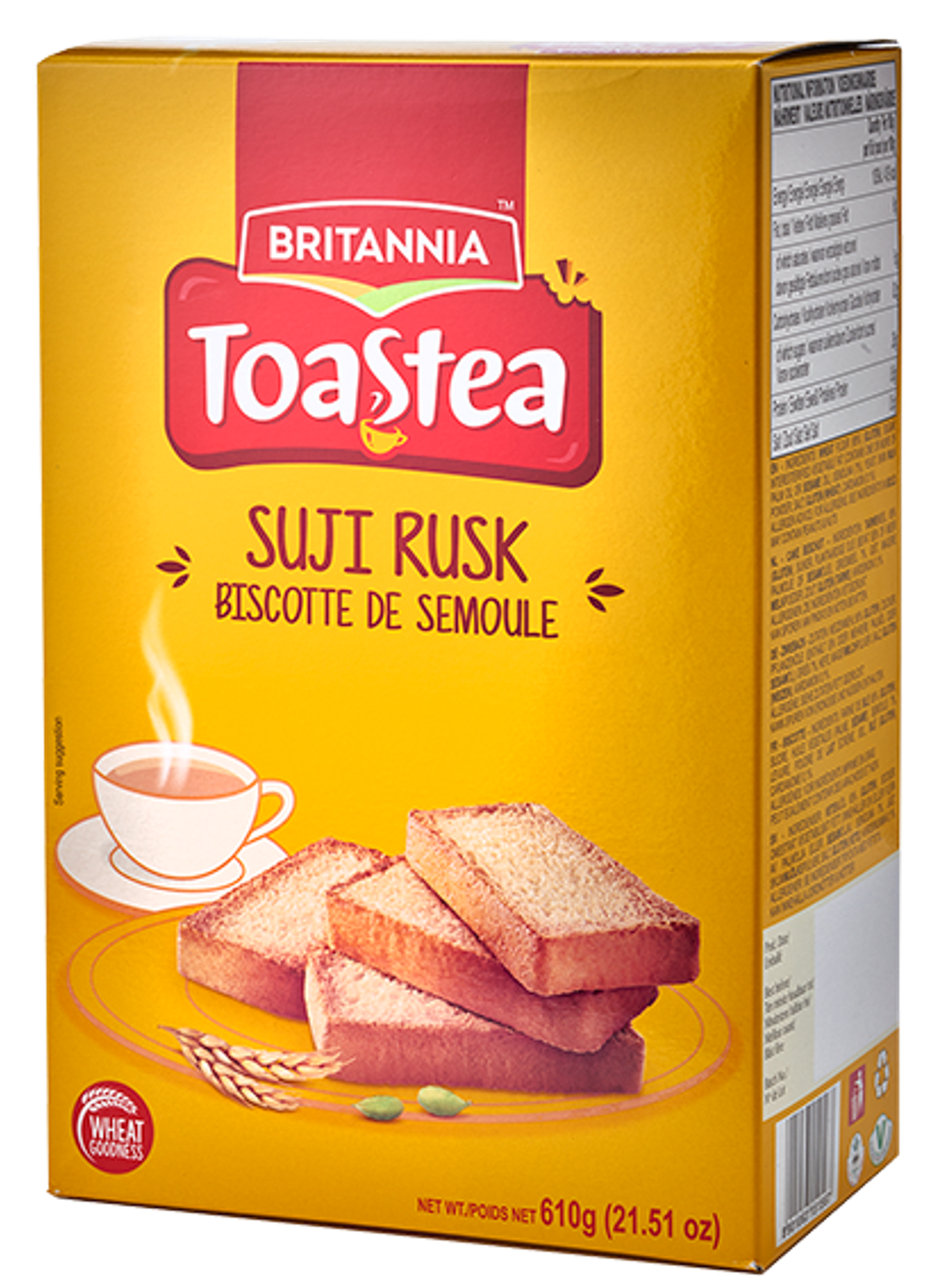 Toastea Suji Rusk. Crisp your tea time with the all new Britania Toastea. You can now feel the new improved taste, texture and crunch. Every Britania Toastea crispy toast has the right level of sweetness. Dip a slice in your cup of tea and watch it take in just the right amount of drink, but still enjoy a crunchy tea experience.