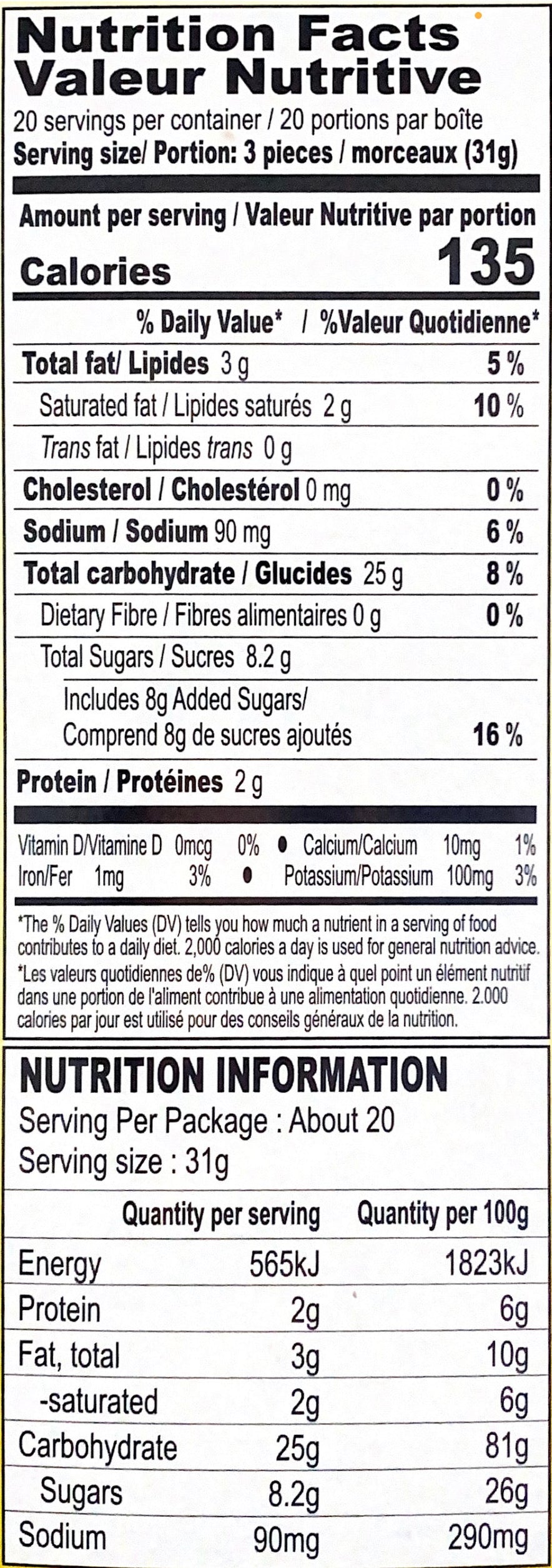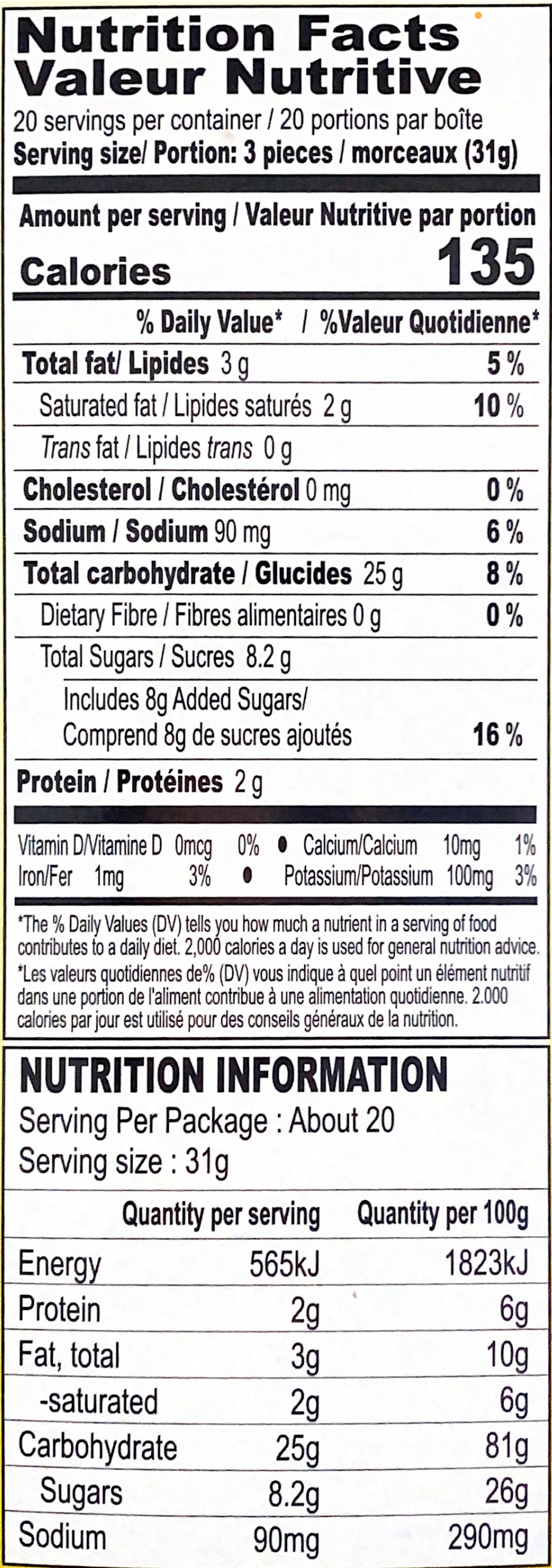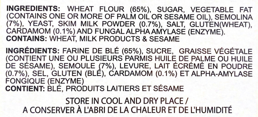 Wheat Flour (65%), Sugar, Transesterified Vegetable Fat (Contains one or more of Palm Oil or Sesame Oil), Semolina (7%), Yeast, Skimmed Milk Powder , Salt,, Gluten (Wheat), Cardamom (0.1%)
