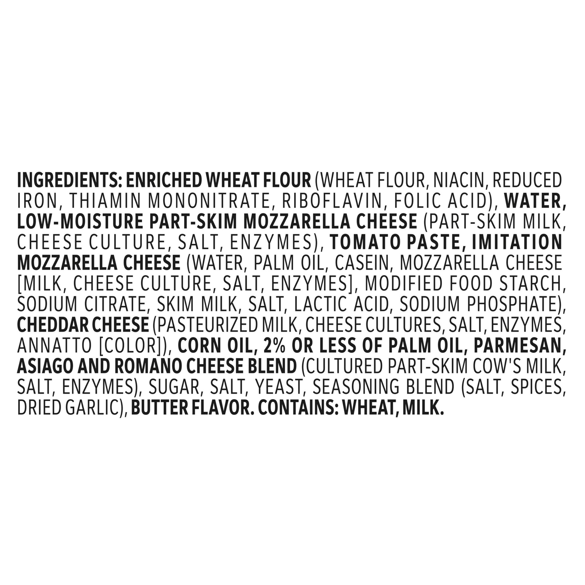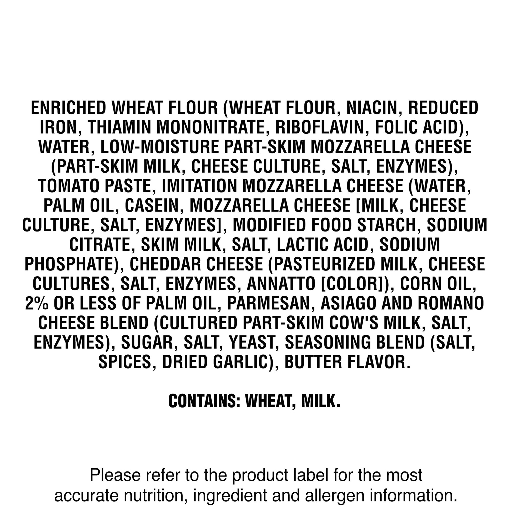 Oven bake pizza with zesty sauce, mozzarella, cheddar, romano, parmesan cheese and asiago cheese on buttery, crispy crust