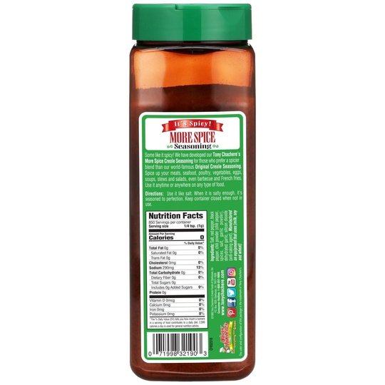 Is Tony Chachere’s Original Cajun/Creole Seasoning a “little too salty” for you? If you’ve answered yes, sometimes you just need a little more spice! Tony Chachere’s More Spice Seasoning is the most zesty blend you’ll taste. Tony Chachere’s More Spice Cajun/Creole Seasoning was developed for those who love the flavor profile of our Original Cajun/Creole Seasoning but wants a little less salt and a little more spice. It has 14% less sodium per serving than our Original blend. Just like the Original, it enhances the flavors of your favorite meats, seafood, poultry, vegetables, eggs, soups, stews, and so much more! Tony Chachere’s More Spice is a multi-purpose seasoning that adds authentic Cajun/Creole flavor to any dish. This no MSG seasoning also comes in a 7 oz container with a shaker-style lid for easy dispensing. Tony Chachere’s makes everything taste great!