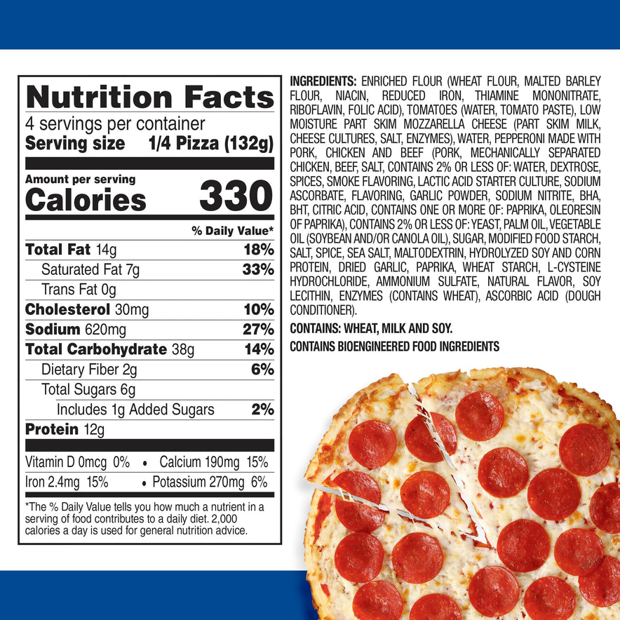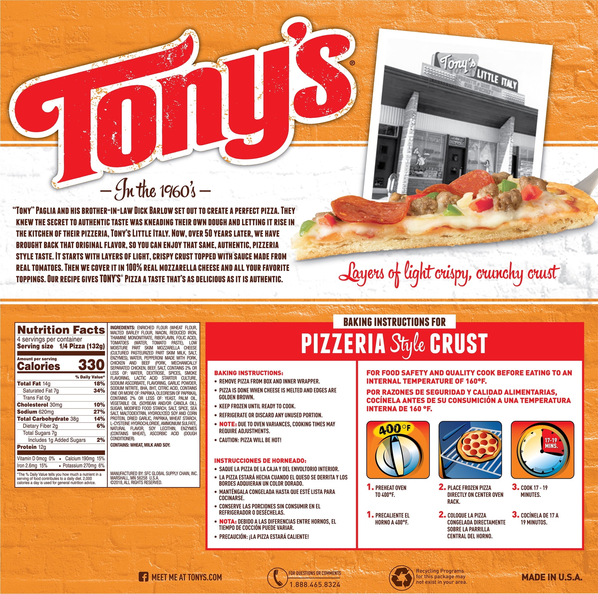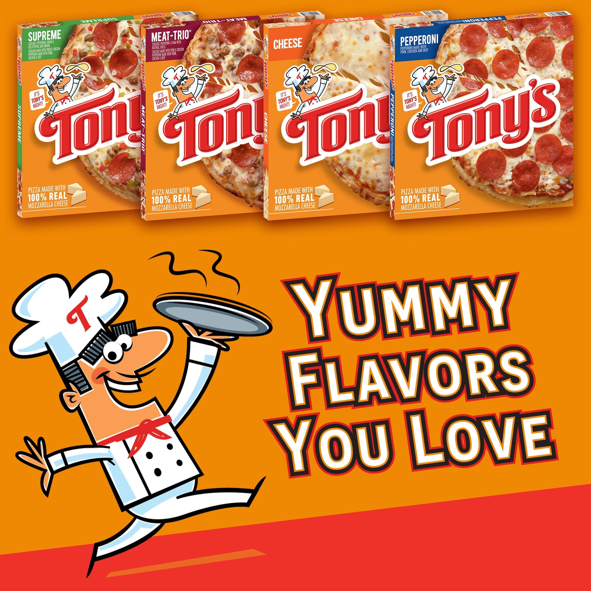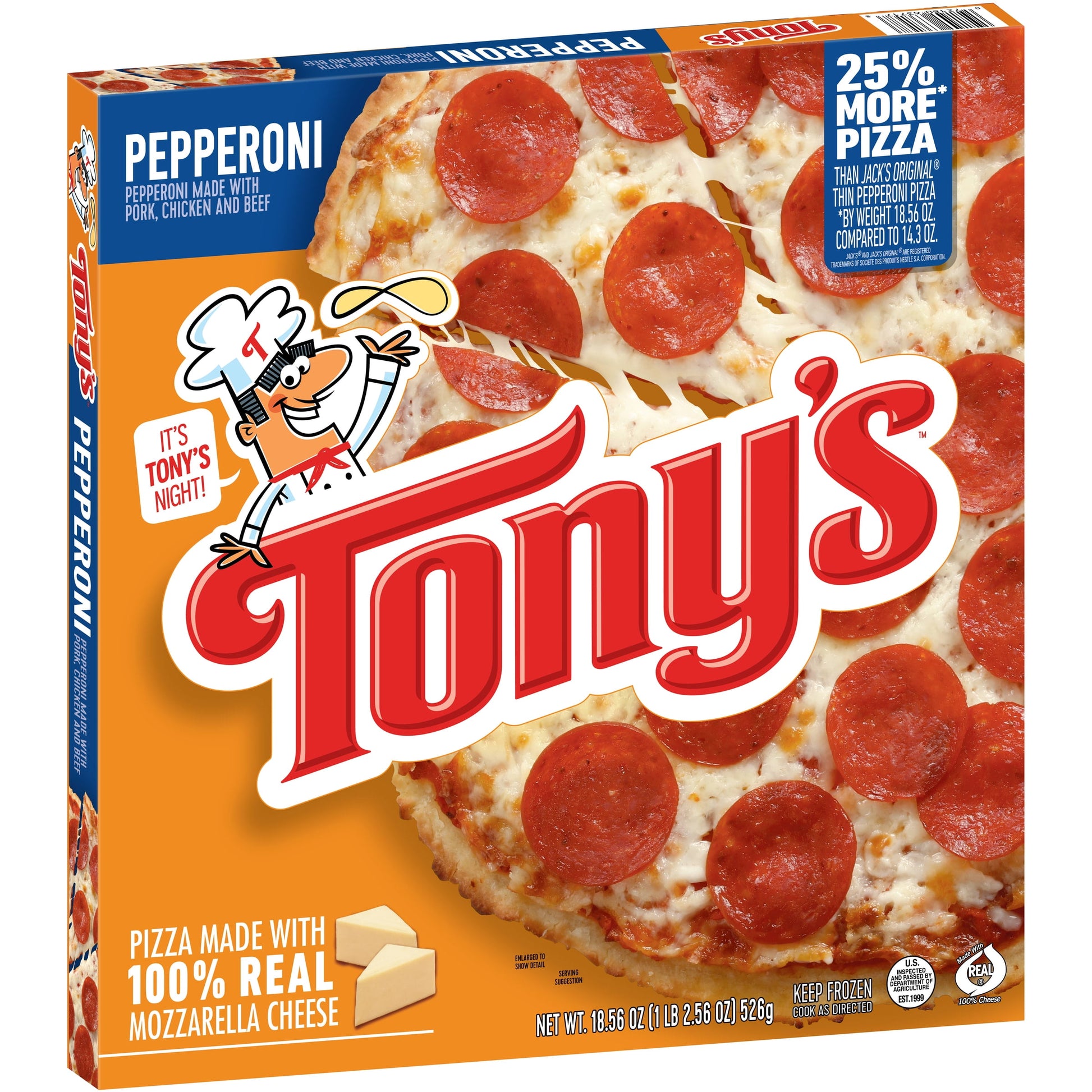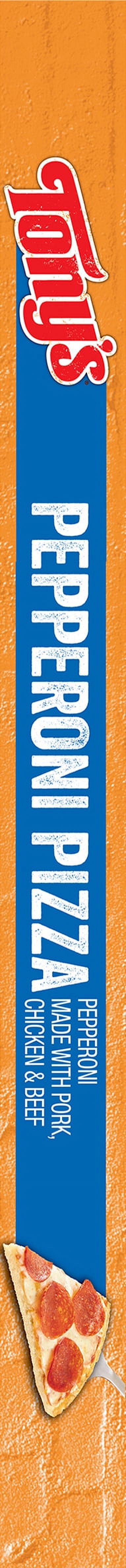 TONY'S PIZZA - Making Italian Moms proud since 1960! Dig in and enjoy our Pizzeria Style Pepperoni Pizza. It starts with layers of light, crispy, crunchy pizzeria style crust, topped with sauce made from real tomatoes, and real mozzarella cheese. Combined with a hearty topping of pepperoni to pack that classic pepperoni punch you love, this frozen pizza is so delicious you'll have to fight for seconds, and thirds, and fourths.