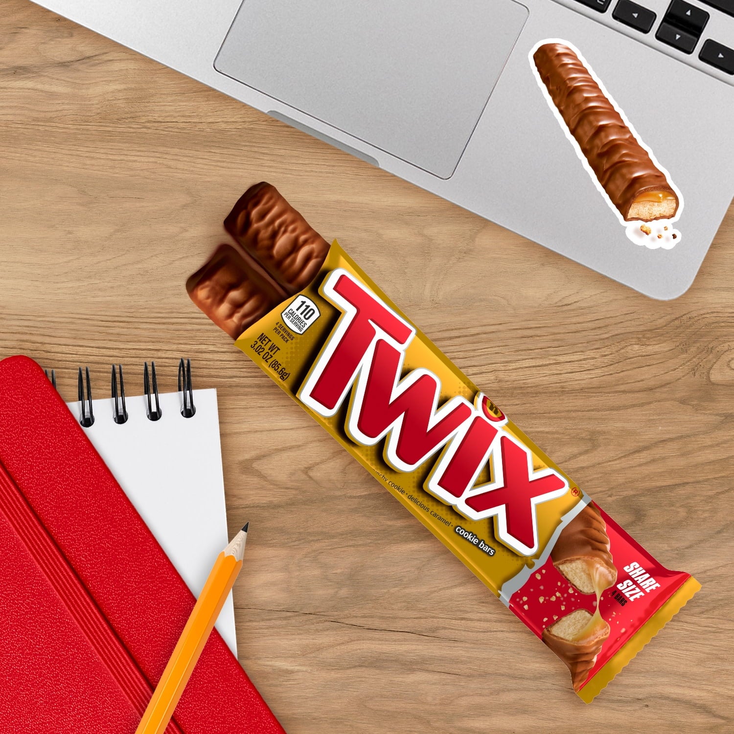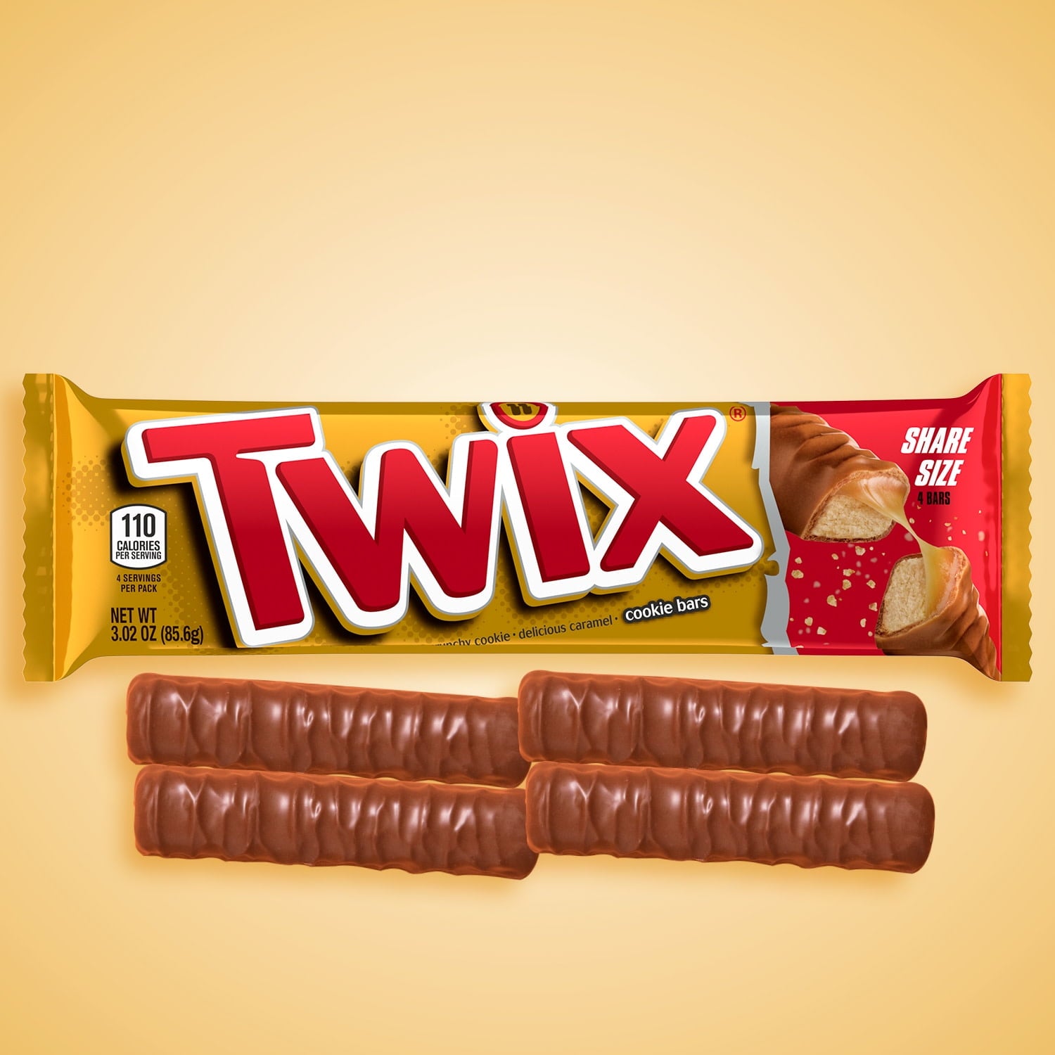Contains one (1) 3.02-ounce share size pack of TWIX Caramel Chocolate Candy Bars