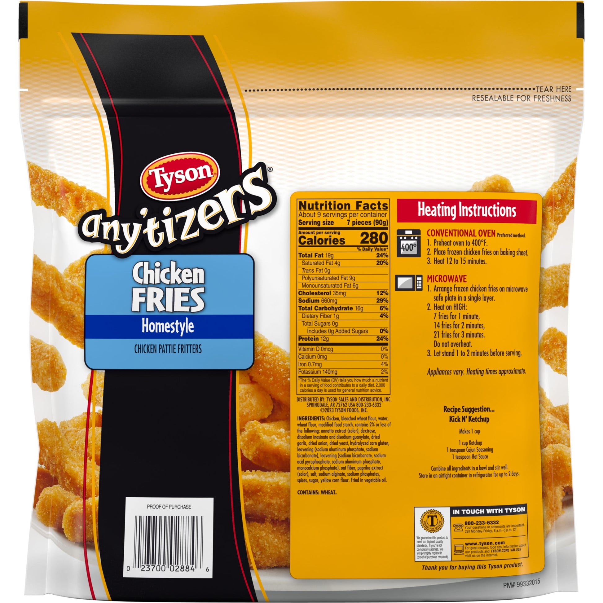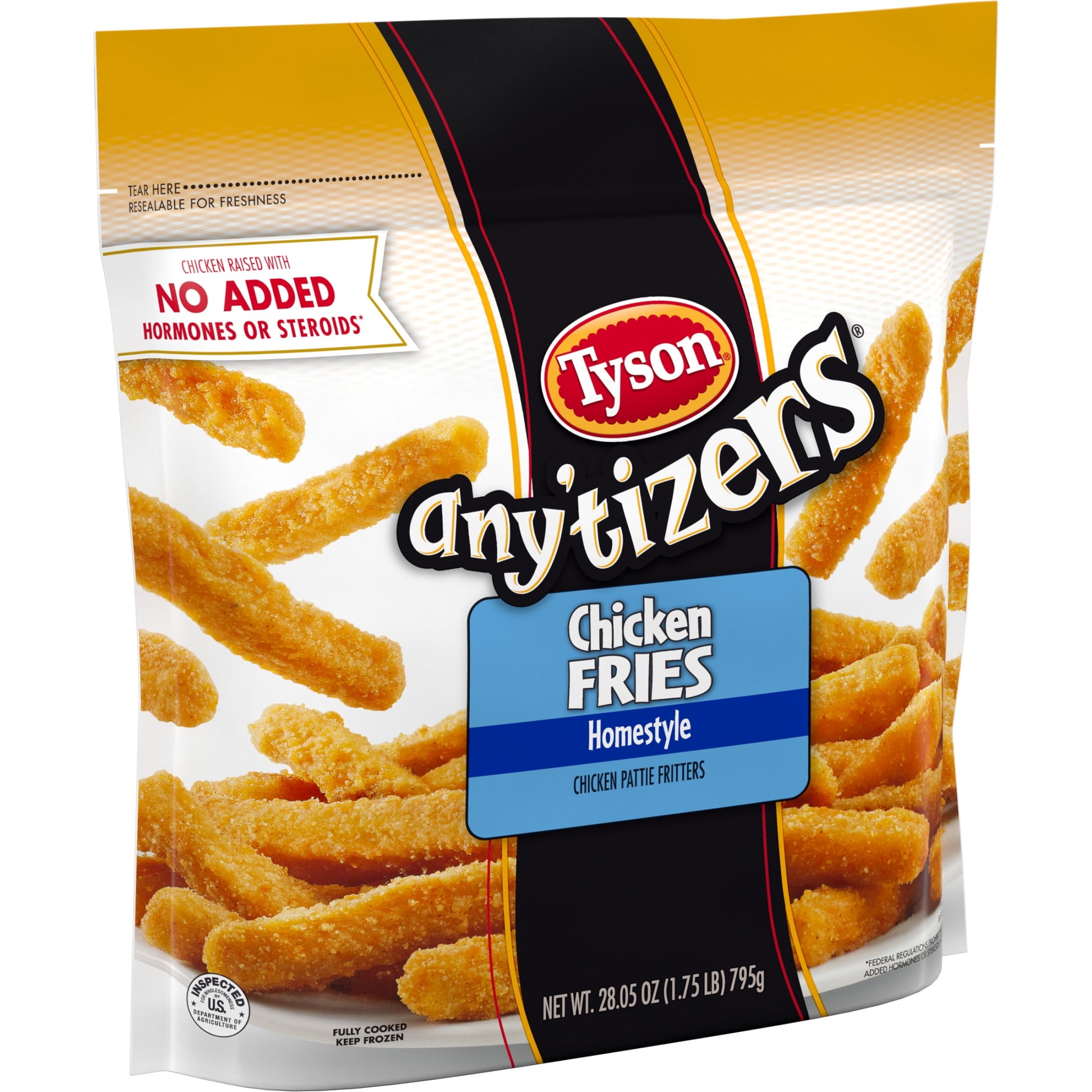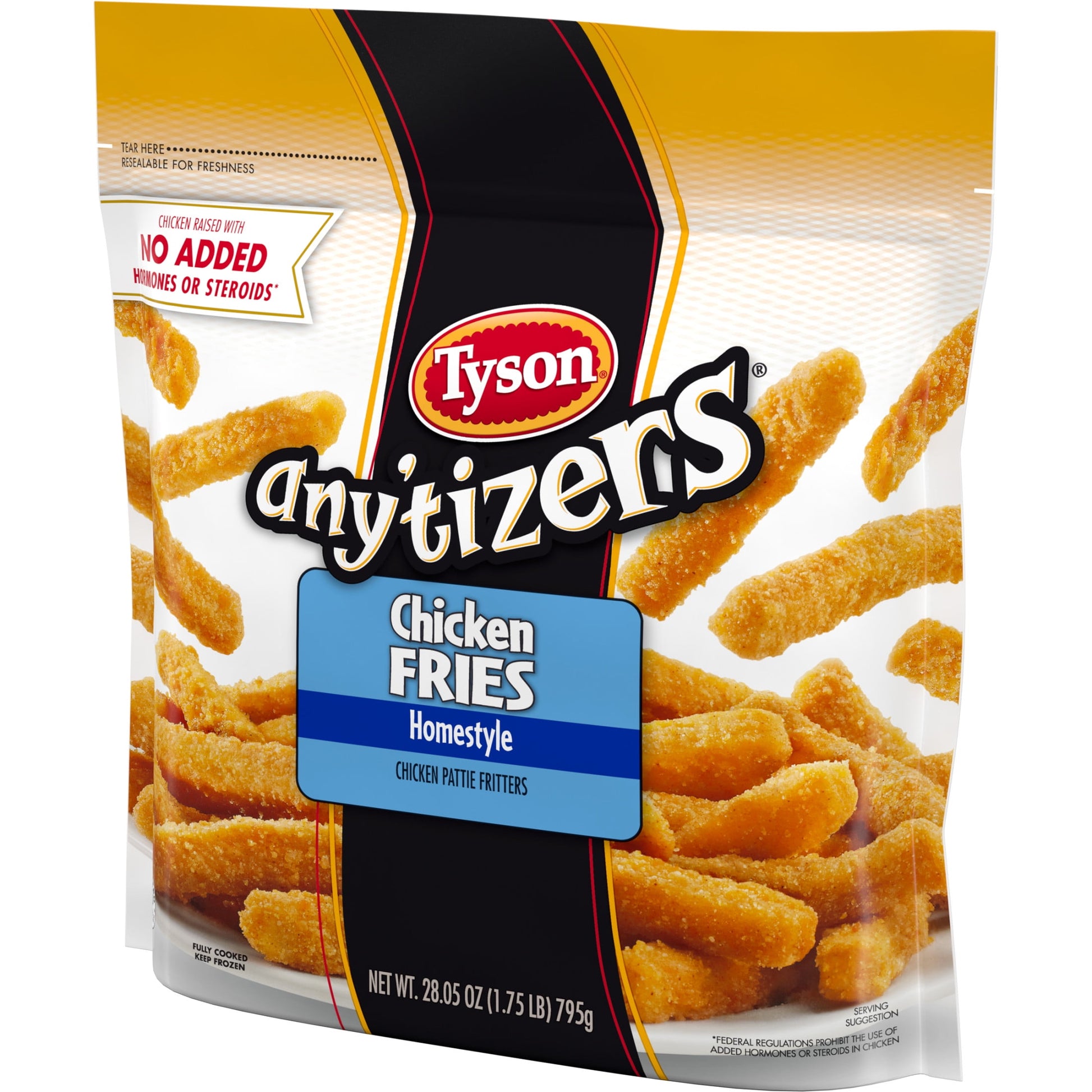 Take snack time to the next level with Tyson Any'tizers Homestyle Chicken Fries. Made with Tyson chicken white meat and seasoned with a savory blend of spices, our chicken fries are a great appetizer for dunking into your favorite sauce. With 12 grams of protein per serving, these protein filled crunchy chicken fingers are sure to be a favorite at your next party. Fully cooked and ready to eat, enjoy frozen chicken air fryer hot. Can also be prepped in an oven or microwave and served with fried cheese sticks as Holiday or Christmas appetizers for this year's party. Perfect to add to your frozen home cooked meals. Chicken fingers are a great addition to any frozen snack or dinner ready meals you keep on hand. Look for these items and other Tyson frozen snack foods in the freezer aisle. Each package includes 28.05 oz of homestyle, easy to prepare frozen chicken fries.