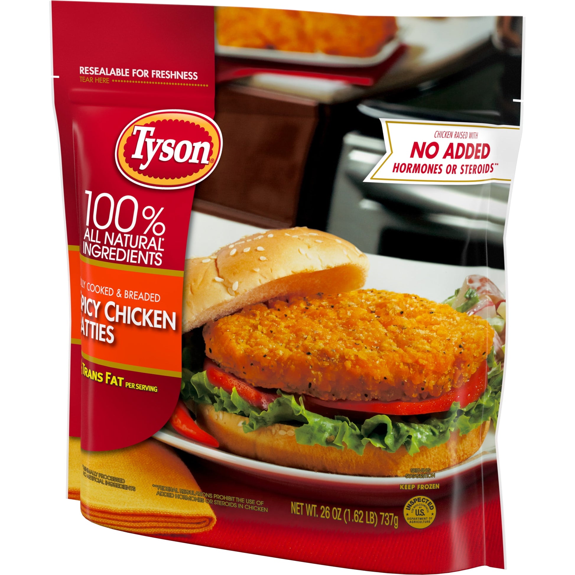 One 26 oz. package of Tyson Fully Cooked and Breaded Spicy Chicken Patties
