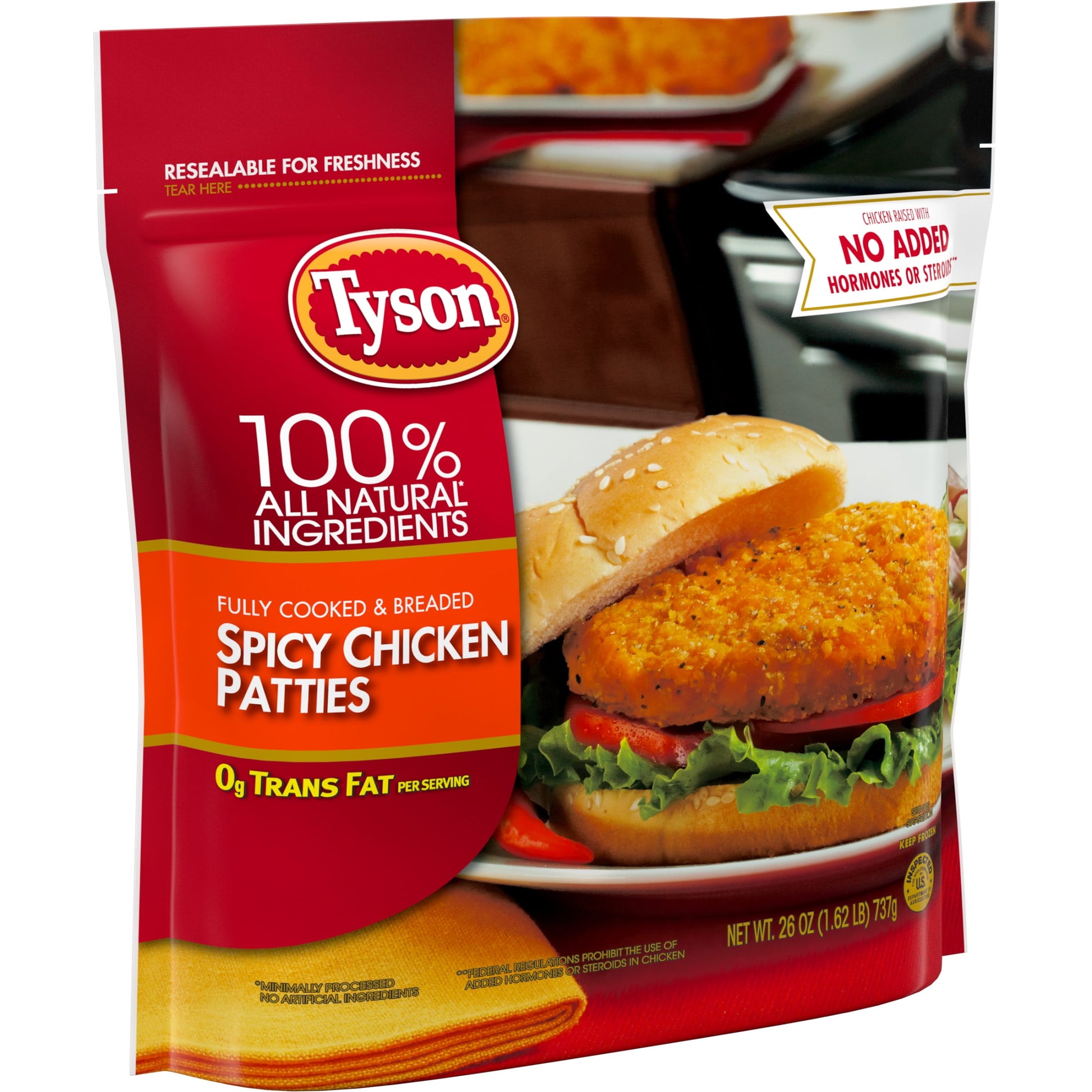 Tyson Fully Cooked and Breaded Spicy Chicken Patties are a delicious addition to any meal. Our frozen chicken patties are made with no preservatives, then breaded with a kick of spice. Love a classic crispy fried chicken breast sandwich? With 0 grams of trans fat per serving, these are great for a spicy chicken sandwich. Fully cooked, these Tyson spicy, frozen patties can be prepared in an oven or microwave and served with ketchup on a sesame seed bun for a delicious lunch. Dinner time gets better when you have a fully cooked, frozen chicken breast ready to heat and eat. When it comes to family size frozen meals, chicken pot pie and other delights, chicken is simple to keep and prepare. Includes one 1.62 lb package. Everything seems to turn out a whole lot better when you just keep it simple. No nonsense. Just stick to the good stuff. The 100% real stuff that makes life, and chicken, great. Keep it real. Keep it Tyson. *Minimally processed, no artificial ingredients.