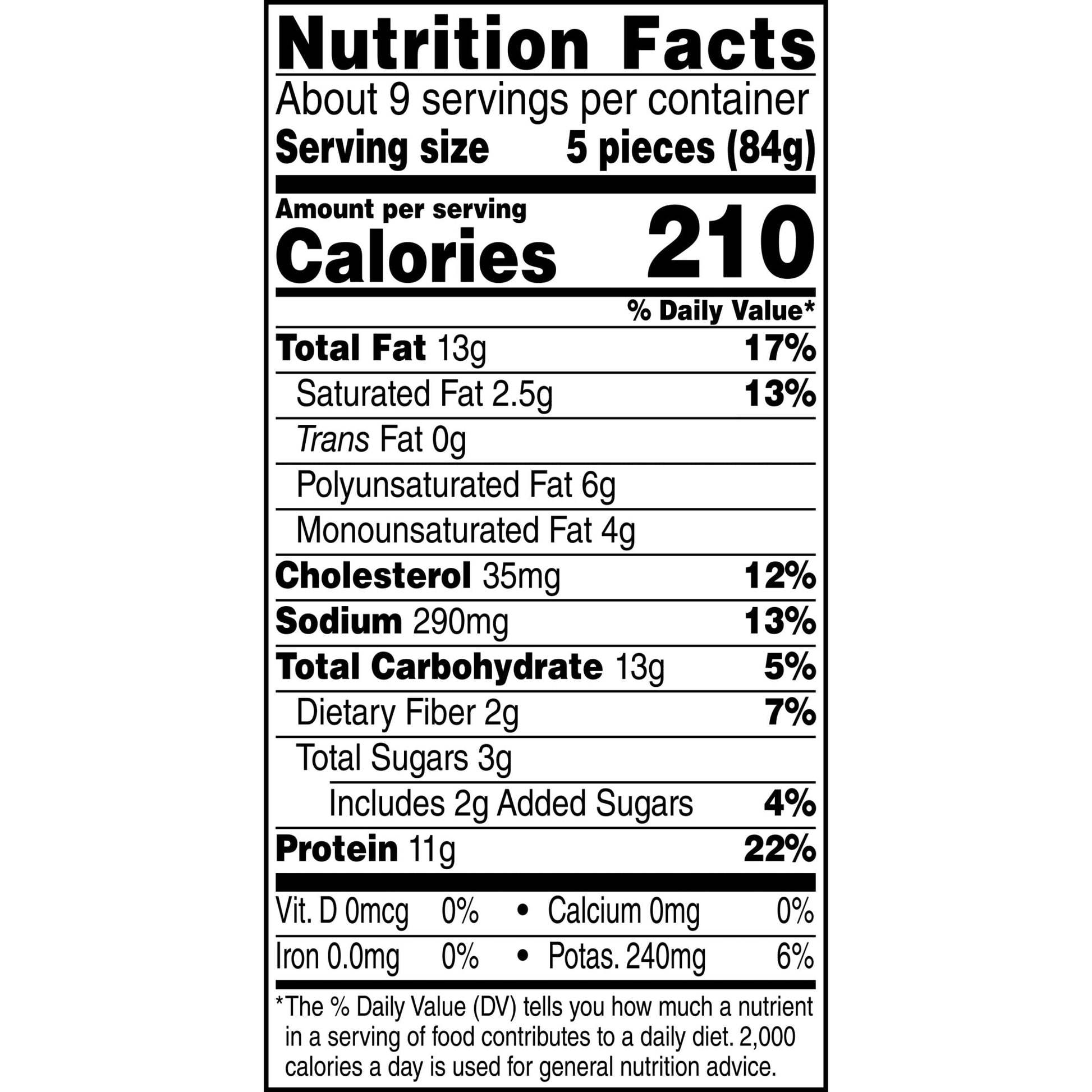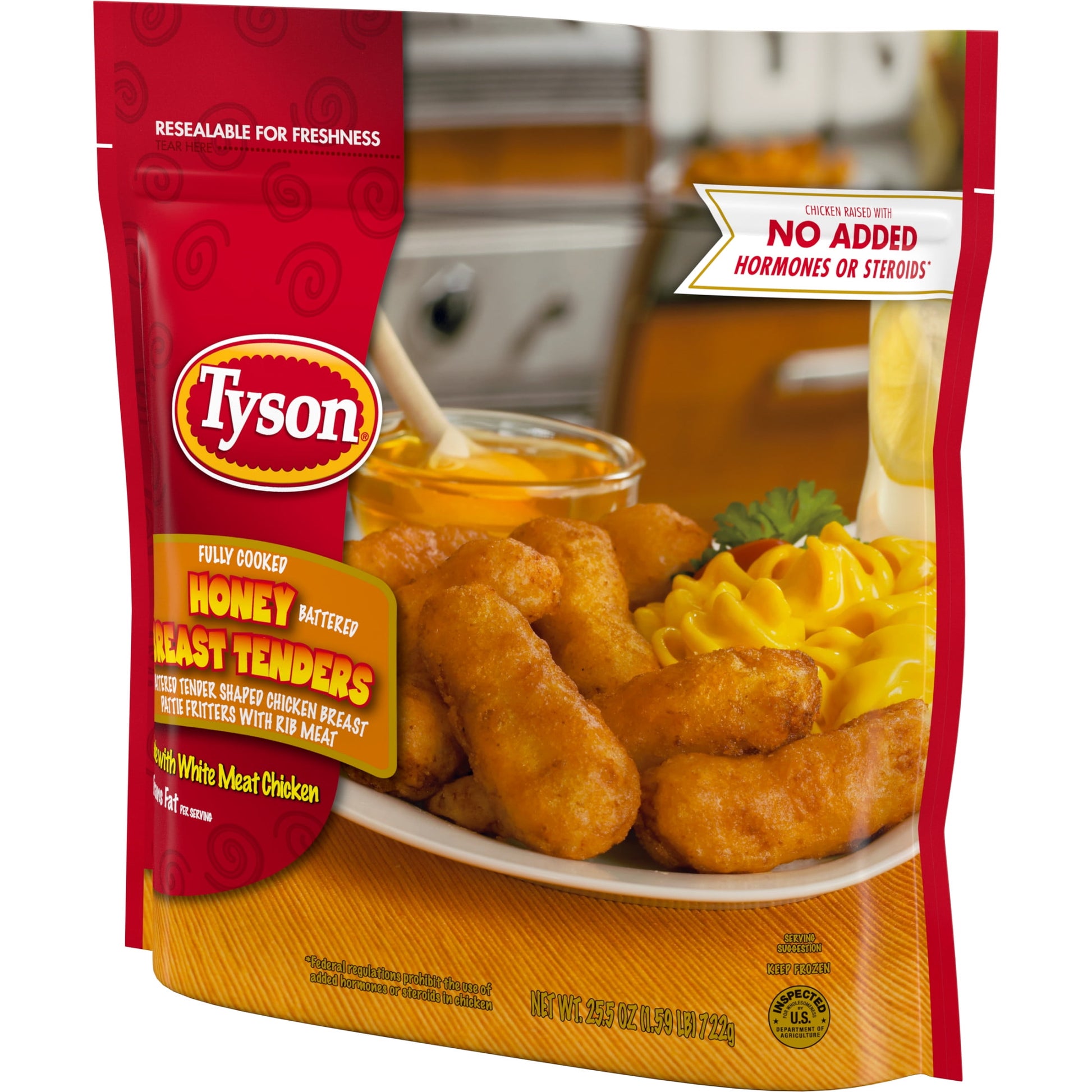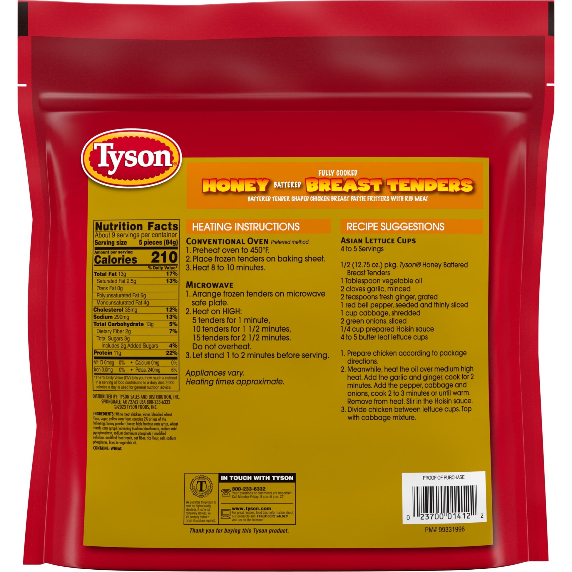 Tyson Fully Cooked Honey Battered Breast Tenders are a delicious addition to any meal. Our chicken tenders are made with all natural* chicken with no preservatives, then dipped in a batter sweetened with a touch of honey. With 0 grams of trans fat and 11 grams of protein per serving and ideal for frying, chicken tenders and crispy chicken strips are sure to be a hit with the entire family. Need dinner, fast? Just pull out your air fryer, frozen chicken tenders go in, and your main course is ready! No fryer? No worries. Perfect for those who like them oven baked. Chicken breast tenderloins can also be microwaved. Perfect on a chicken tender sandwich or as finger food appetizers. Look for our other frozen, home cooked meals, including frozen popcorn chicken, ready cooked chicken breasts and rotisserie chicken style meals. Includes one 1.59 pound package of baked, breaded chicken tenderloins. Everything seems to turn out a whole lot better when you just keep it simple. No nonsense. Just stick to the good stuff. The 100% real stuff that makes life, and chicken, great. Keep it real. Keep it Tyson. *Minimally processed, no artificial ingredients.