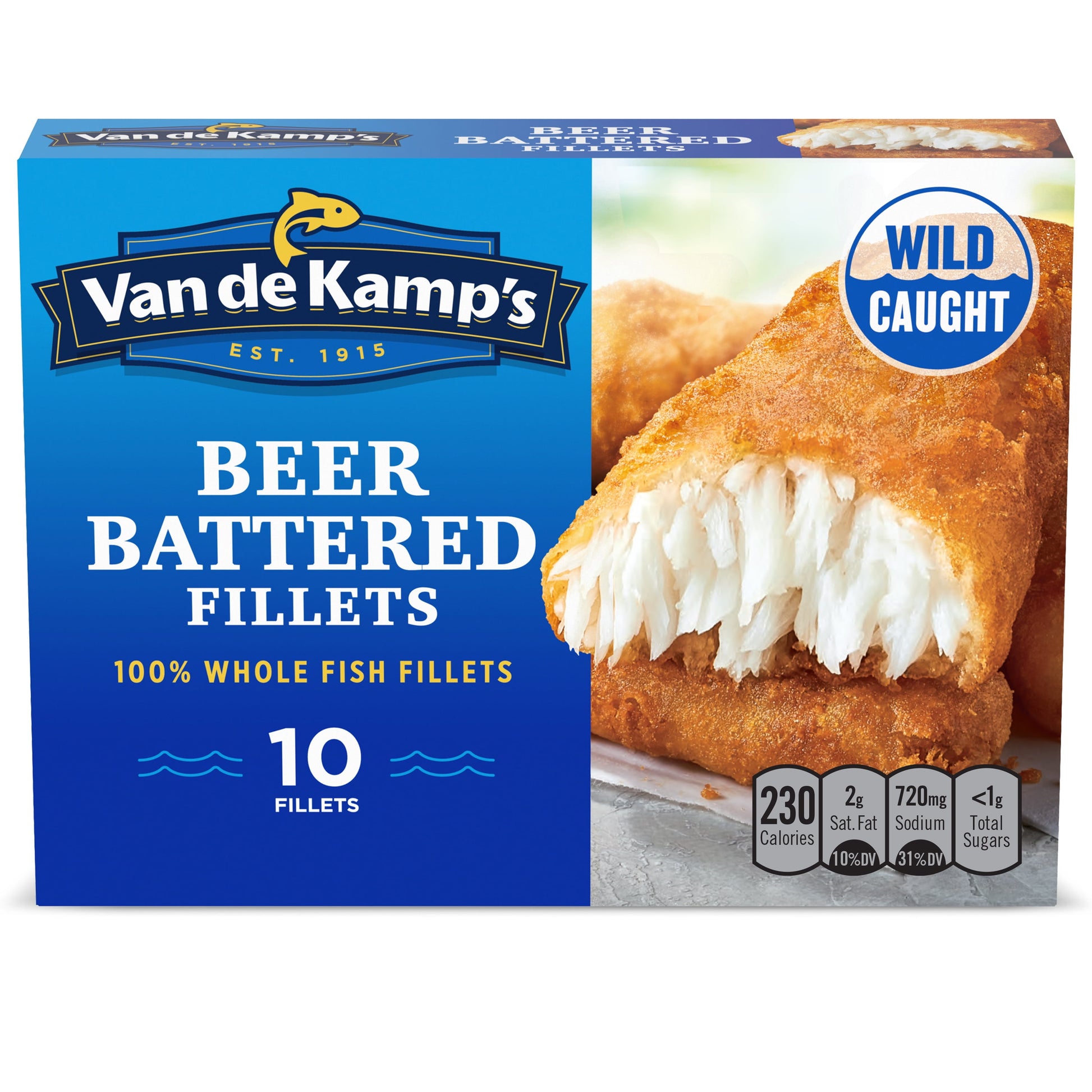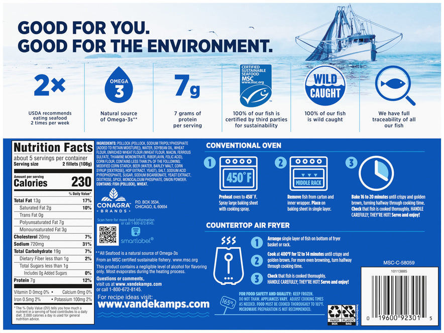 When you want delicious, crispy fish fillets, reach for Van de Kamp's Beer Battered 100% Whole Fish Fillets. This mouthwatering, wild-caught pollock is dipped in a crispy beer batter that is the perfect combination of flavor and crispiness. Whether you are adding them to your favorite fish taco recipe, drenching them in tartar sauce or simply eating them all by themselves, you will love these tasty fish fillets. They are also a good source of omega-3s, so you can feel good about the seafood you're eating. Van de Kamp's: made with 100% real fish and never any fillers.