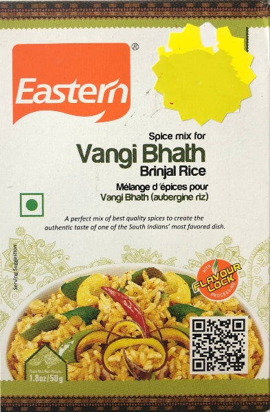 Step 1. Cook 175g of rice and keep aside, Step 2. Fry 175g, of brinjal and 100g vegetables with a pinch of turmeric in 1/2 teaspoon of cooking oil, Step 3: Add 3 1/2 teaspoons of Eastern Vangi Bhath if desired, Step 4. Season it with 3 tablespoon of cooking oil, 1/4 teaspoon of mustard, 1/2 teaspoon of chilli, Steps 5. Add Fried copra and cooked rice, Mix well and Serve hot.