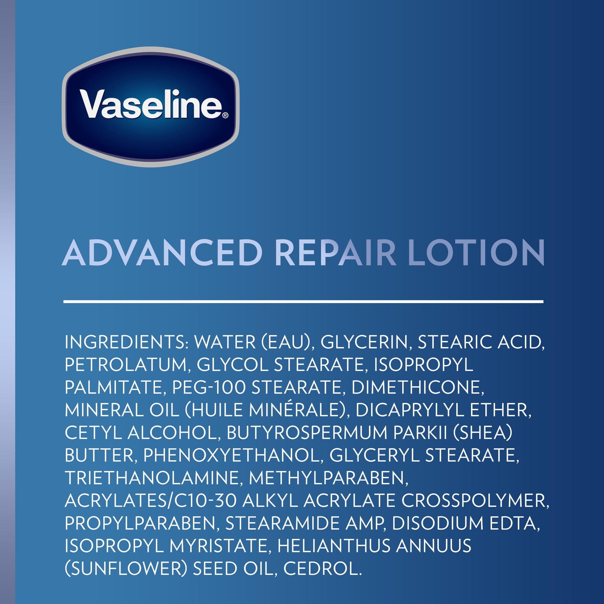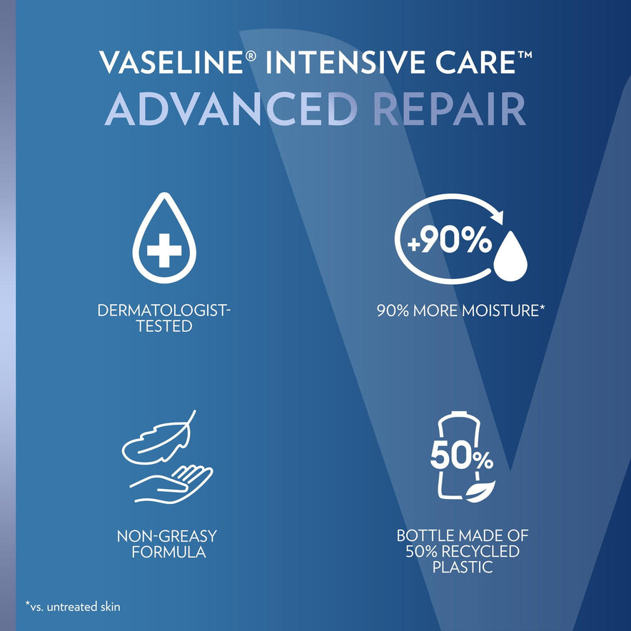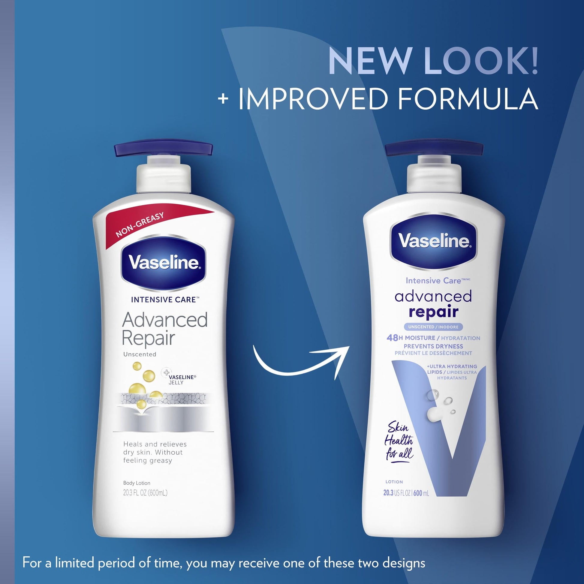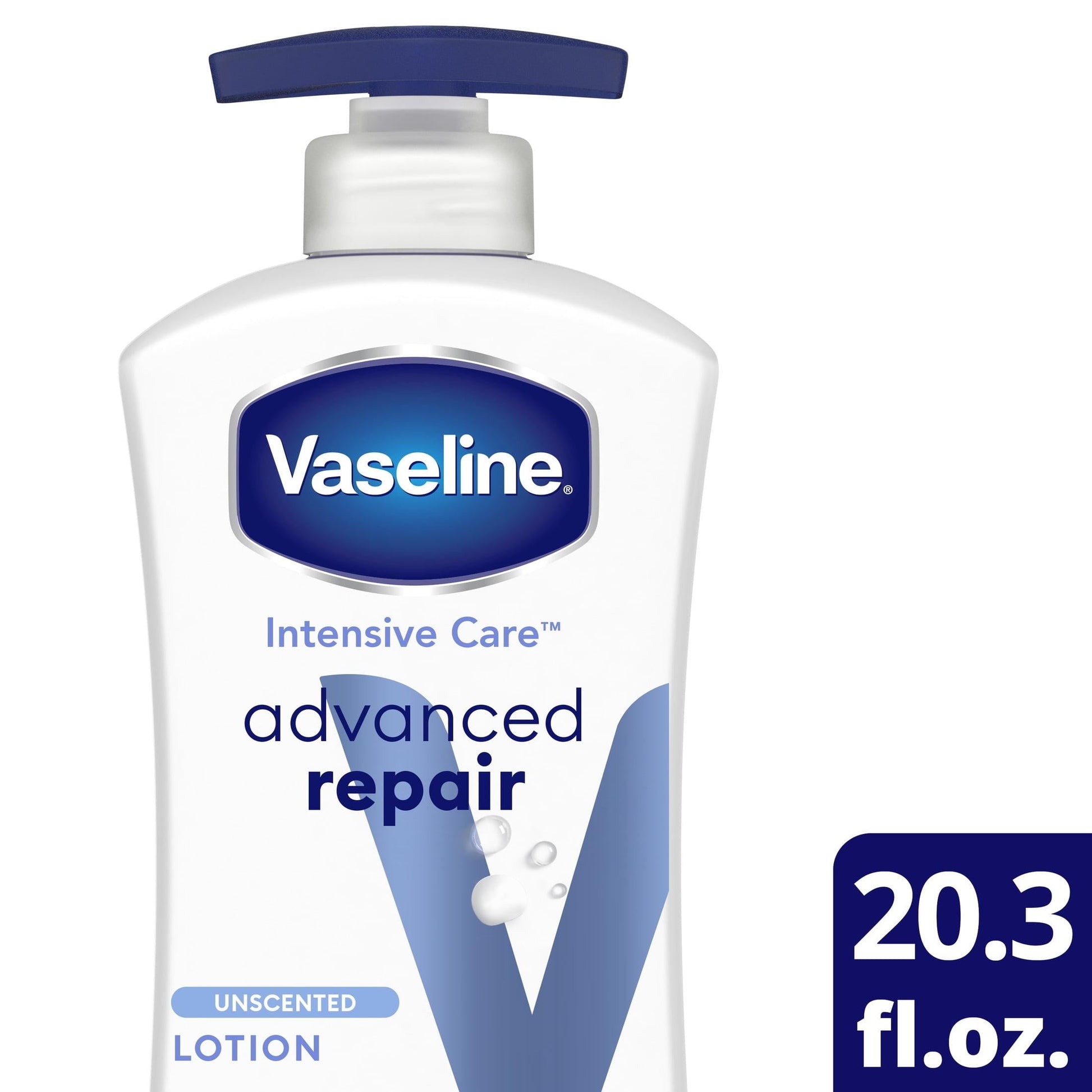 Vaseline Intensive Care Advanced Repair Non Greasy Body Lotion, Unscented, 20.3 fl oz, Made with Vaseline Jelly and Ultra-Hydrating Lipids, Vaseline Intensive Care Advanced Repair Unscented Body Lotion for dry skin prevents dryness and helps keep your skin looking healthy and hydrated. With daily exposure to environmental triggers (like wind, lack of humidity, and sun), skin's natural moisture barrier can break down, allowing water to escape the skin. But the Ultra-Hydrating Lipids in our Advanced Repair lotion fortify the skin barrier and replenish moisture to allow the skin's natural barrier to recover. Vaseline Intensive Care Advanced Repair Unscented Lotion, formulated with Ultra-Hydrating Lipids and Vaseline Jelly, locks in moisture and repairs extremely dry skin. This unscented body moisturizer is clinically tested to provide 90% more moisture (vs. untreated skin). This unscented lotion for dry skin absorbs fast for rich moisturization without feeling greasy and provides 48-hour moisture.