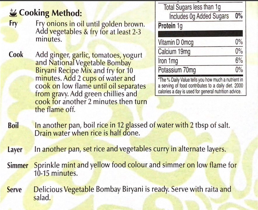 Receipe Mix for Vegetable Bombay Biryani |National Foods have been specially developed by a panel of experts, using the finest ingredients in exactly the right measure, enabling you to cook delicious traditional meals with ease