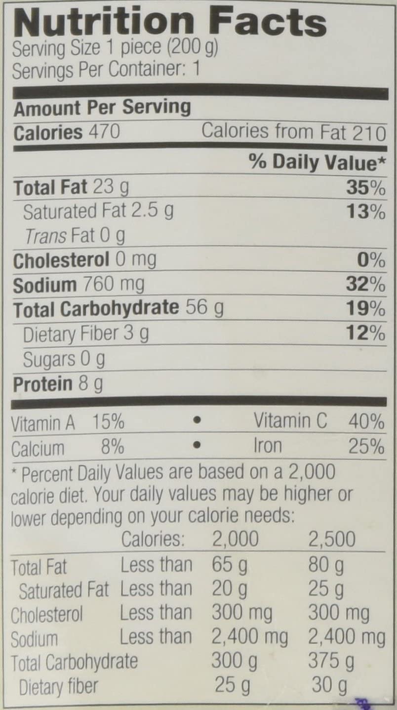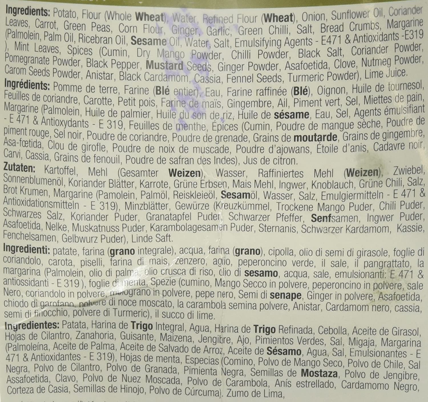 Ingredients: potato, refined wheat flour, wheat flour, sunflower oil, onion, water, milk, carrot, green peas, coriander leaves, corn flour, bread crumbs, green chilli, garlic, salt, ginger, margarine, cumin seeds, mint leaves, dry mango powder, red chilli powder, lemon juice, spices, black salt, turmeric powder.