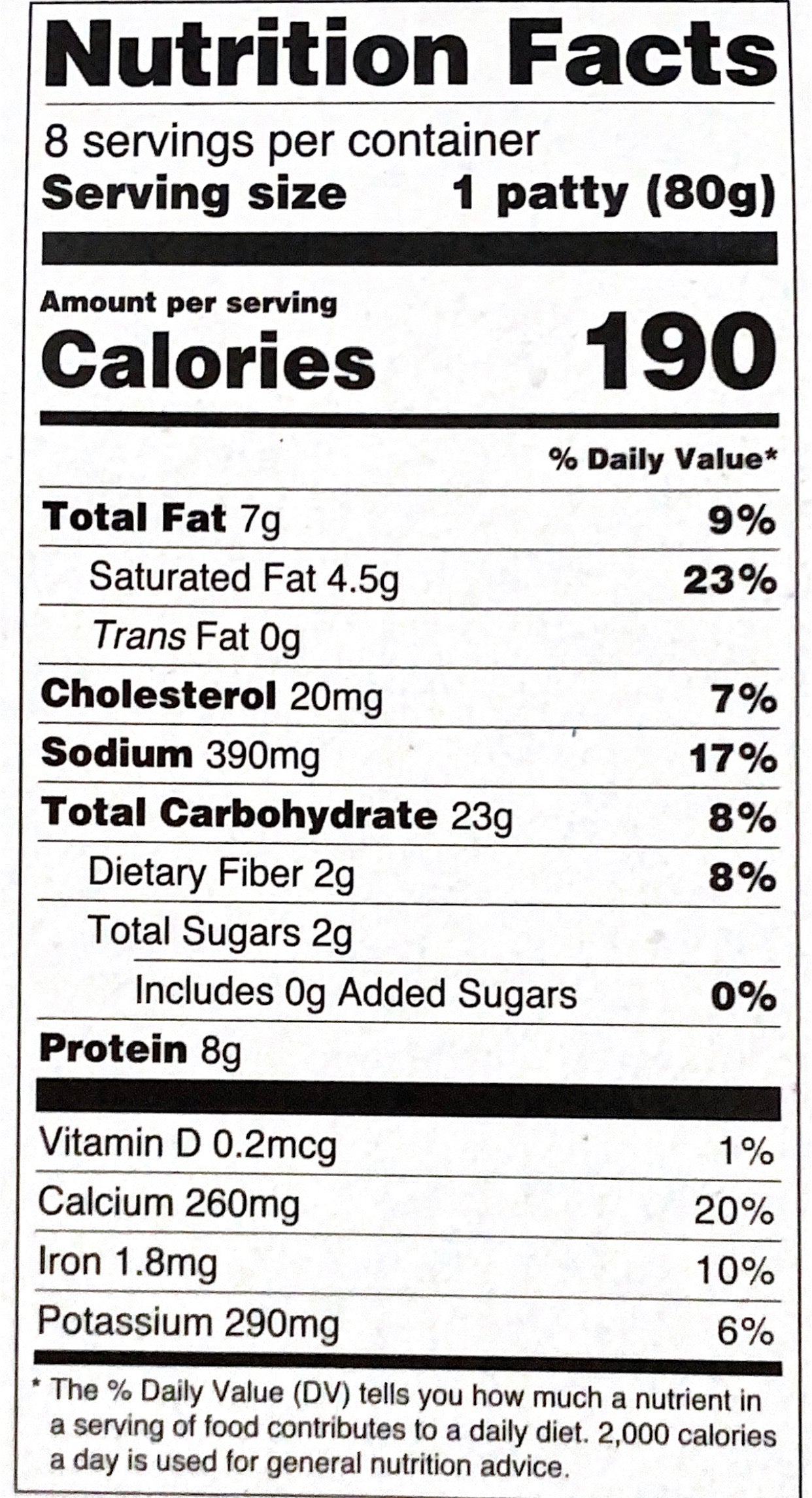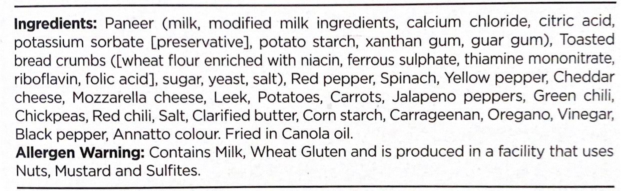 Paneer (milk, modified milk ingredients, citric acid, calcium chloride, potassium sorbate [preservative], modified food starch, xanthan gum, guar gum), toasted bread crumbs ([wheat flour enriched with niacin, ferrous sulphate, thiamine mononitrate, riboflavin, folic acid], sugar, yeast, salt), red pepper, spinach, yellow pepper, cheddar cheese, mozzarella cheese, leek, potatoes, carrots, green chili, chick peas, red chili, salt, clarified butter, corn starch, carrageenan, oregano, vinegar, black pepper, fried in canola oil.