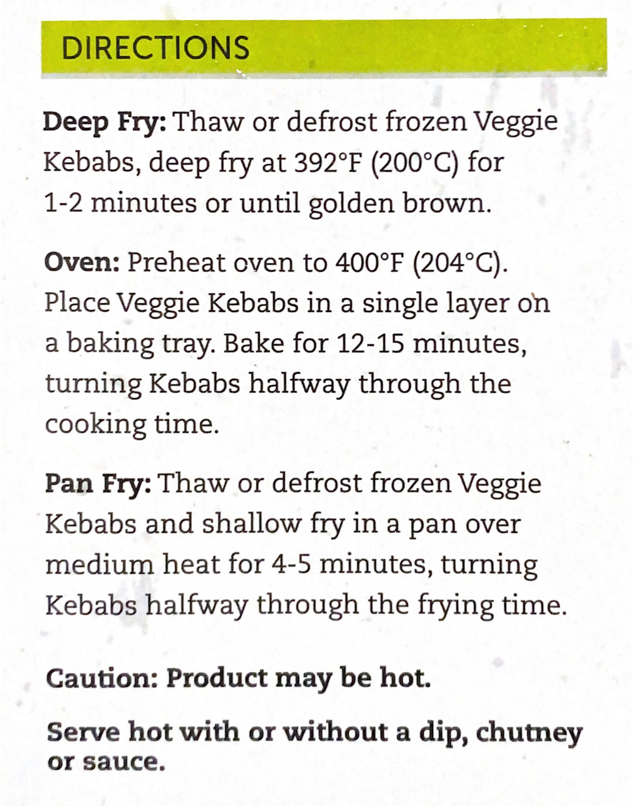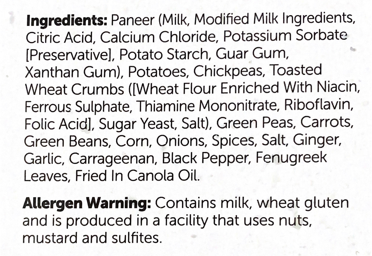 Paneer (milk, modified milk ingredients, citric acid, calcium chloride, potassium sorbate (preservative), modified food starch, guar gum, xanthan gum), potatoes, chick peas, toasted wheat crumbs, green peas, carrots, green beans, corn, onions, spices, salt, ginger, garlic, carrageenan, black pepper, fenugreek leaves, fried in canola oil.