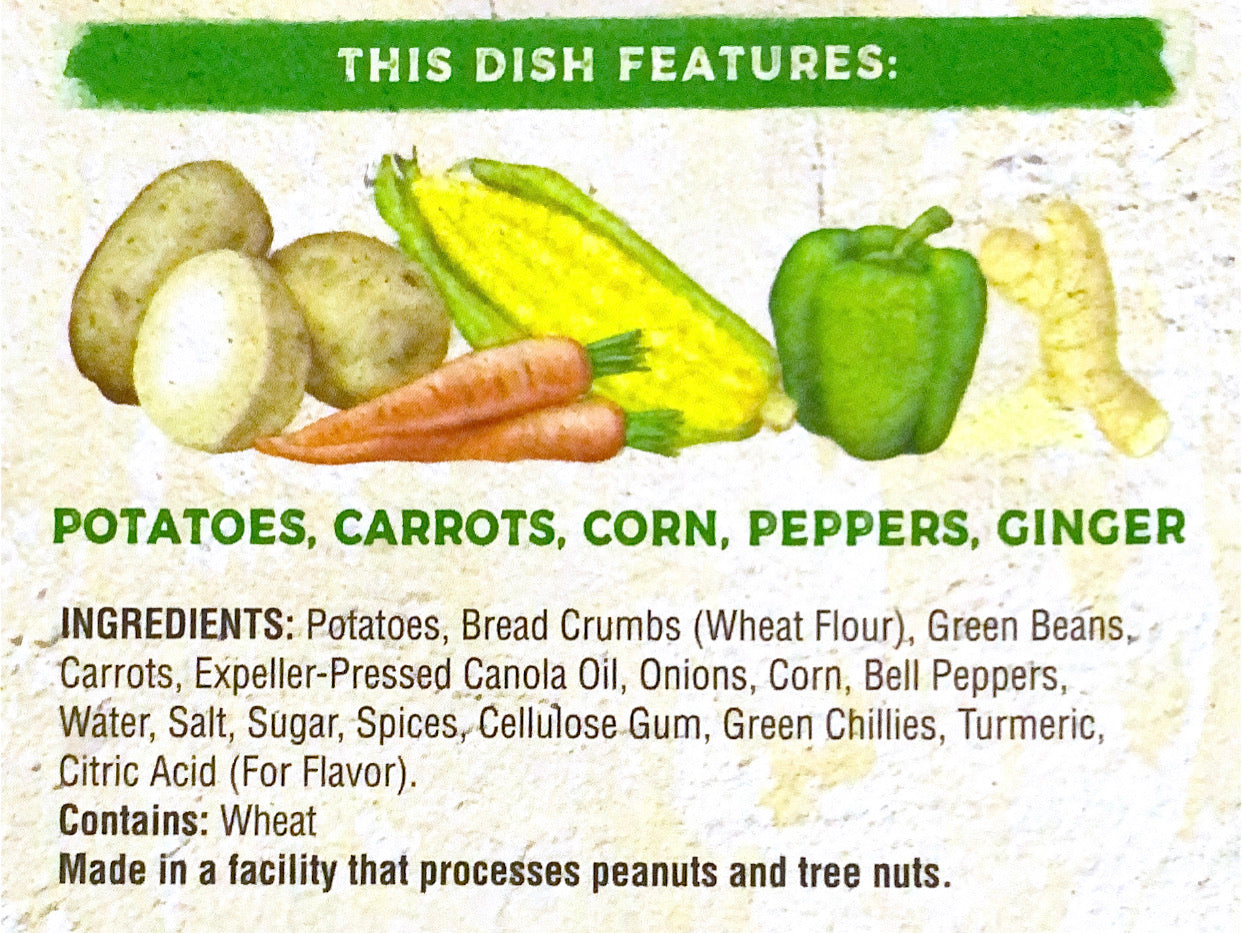 Potatoes Canola Oil Carrots Green Beans Water Bread Crumbs (Wheat Flour, Sugar, Yeast, Salt) Bell Peppers Onions Corn Salt Green Peppers Sugar Ginger Cellulose Gum Spices Citric Acid (for Flavor) Turmeric Mustard Seeds
