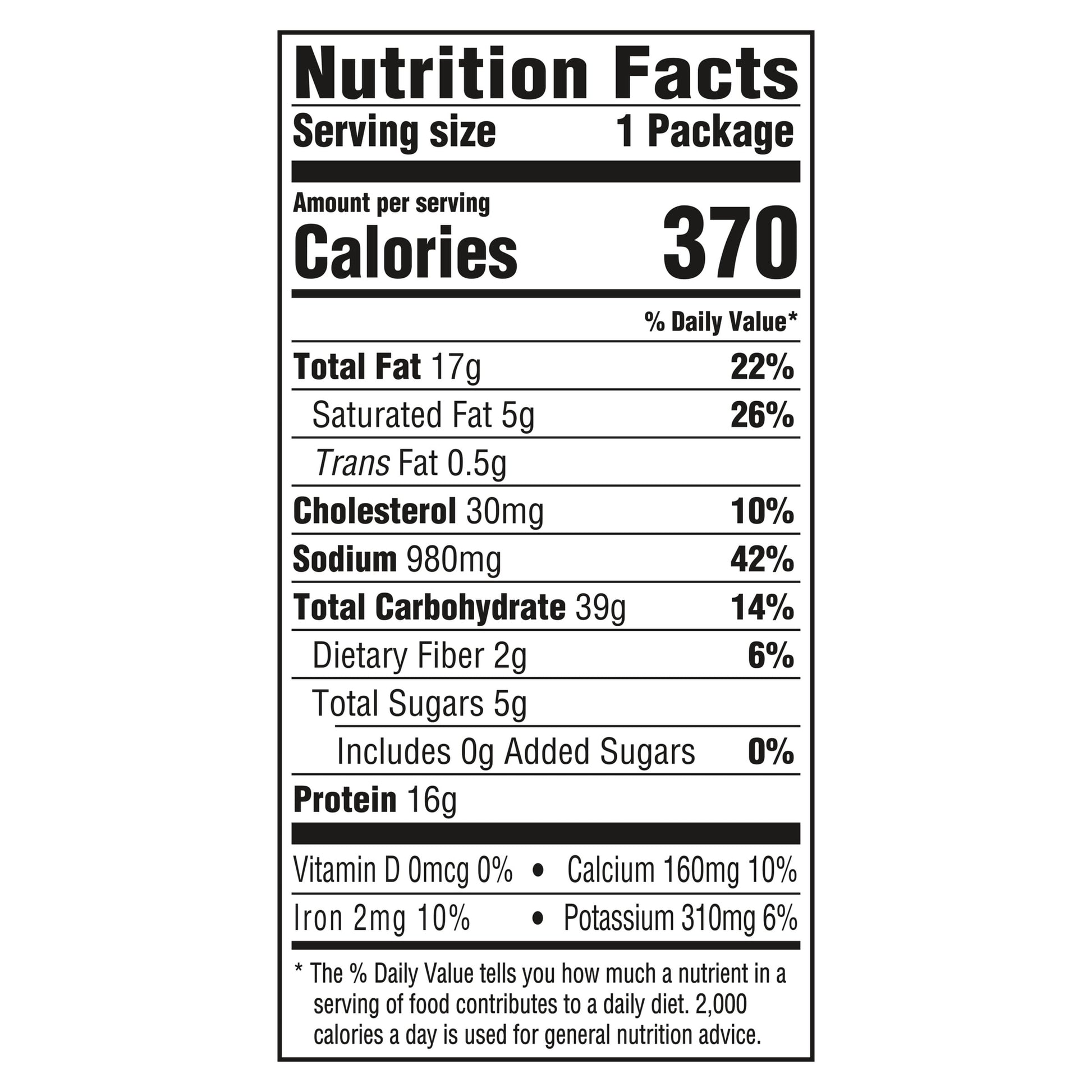 To prepare, remove cheese pouch, partially peel back film from top of tray, microwave on high for one minute and stir in cheese sauce with beef